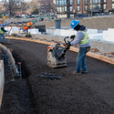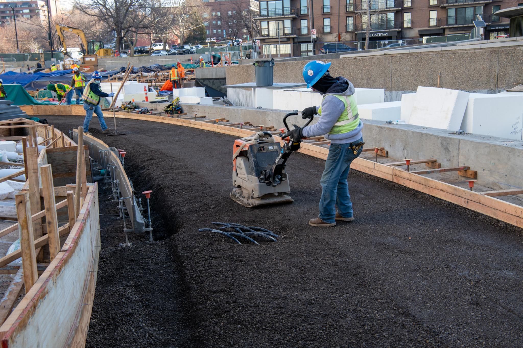 A crew member fills the surface of the Church Office Building plaza with soil and tamps it down to ensure an even surface for the pavement, Salt Lake City, Utah, January 2022.© 2022 by Intellectual Reserve, Inc. All rights reserved.