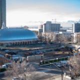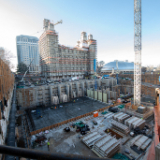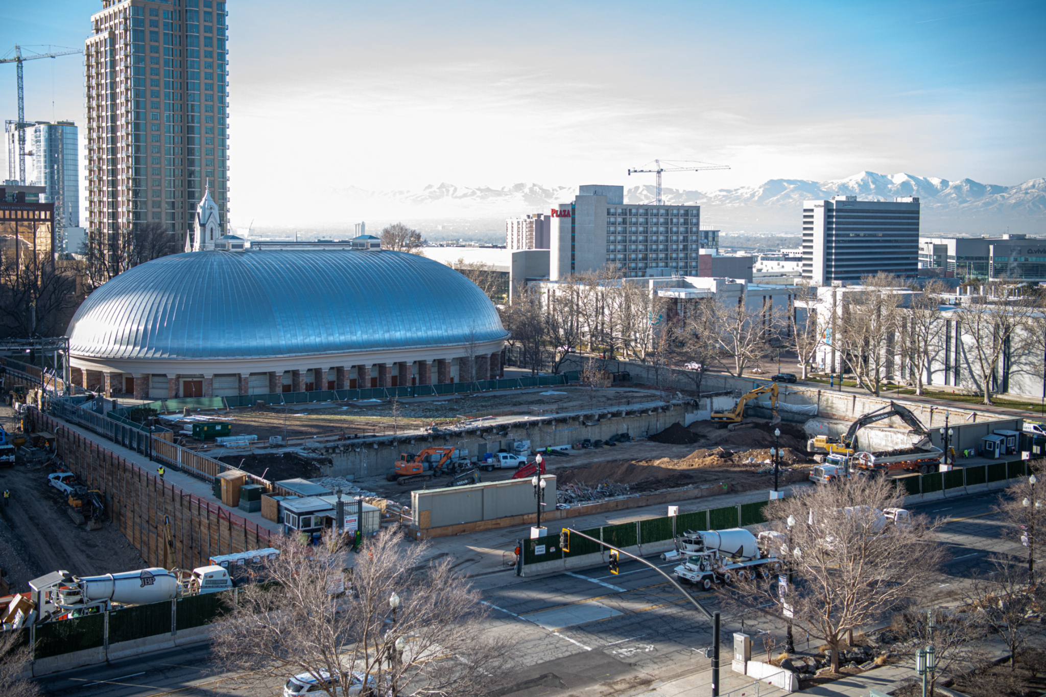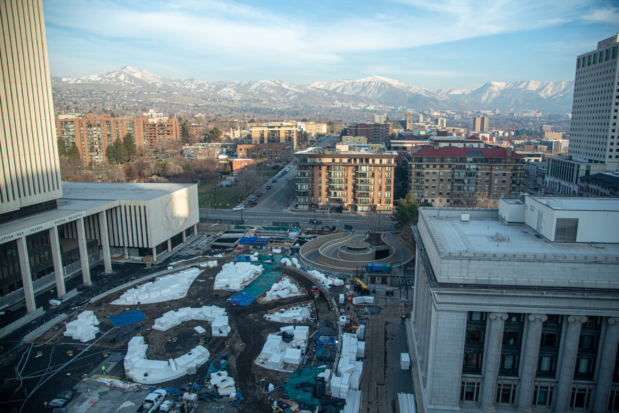 White Styrofoam blocks used to reduce the weight of the soil on the concrete deck of the Church Office Building plaza are visible from the east side of the Joseph Smith Memorial Building, Salt Lake City, Utah, January 2022.© 2022 by Intellectual Reserve, Inc. All rights reserved.The photo above shows a view from the Joseph Smith Memorial Building of the work on the Church Office Building plaza. The white blocks are the Styrofoam being placed to reduce the load of the soil on the concrete deck.