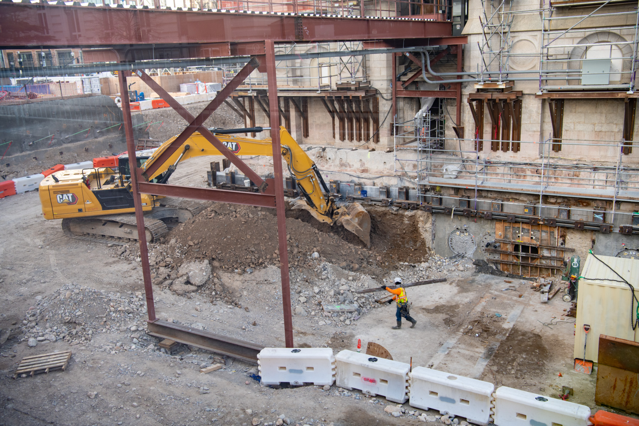 Renovation crews excavate in front of the east towers of the Salt Lake Temple in preparation for a concrete pad that will support equipment necessary in the jack and bore process, Salt Lake City, Utah, January 2022.© 2022 by Intellectual Reserve, Inc. All rights reserved.The North Visitors’ Center demolition is nearly complete. However, some work remains, such as removing the basement walls and sorting rubble for recycling.