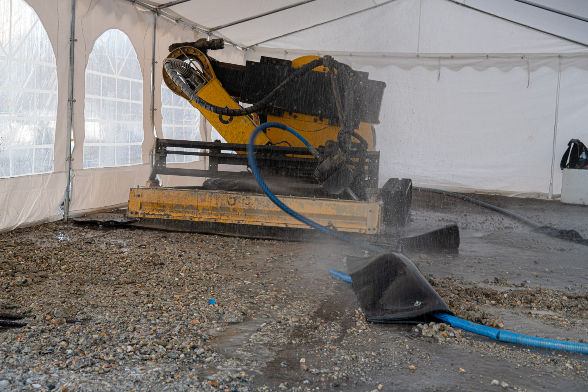 A hydroblaster, or “concrete lawnmower,” removes damaged concrete to a depth of 2 to 2.5 inches from the Church Office Building plaza on Temple Square, Salt Lake City, Utah, January 2022.© 2022 by Intellectual Reserve, Inc. All rights reserved.This machine removes the damaged concrete to a depth of about 2 to 2.5 inches at the plaza top deck. It is known on site as the “concrete lawnmower,” but its proper name is a hydro blaster machine. The blaster shoots an oscillating, high-pressured water stream through a tiny nozzle that removes the damaged concrete (seen in front of the machine).