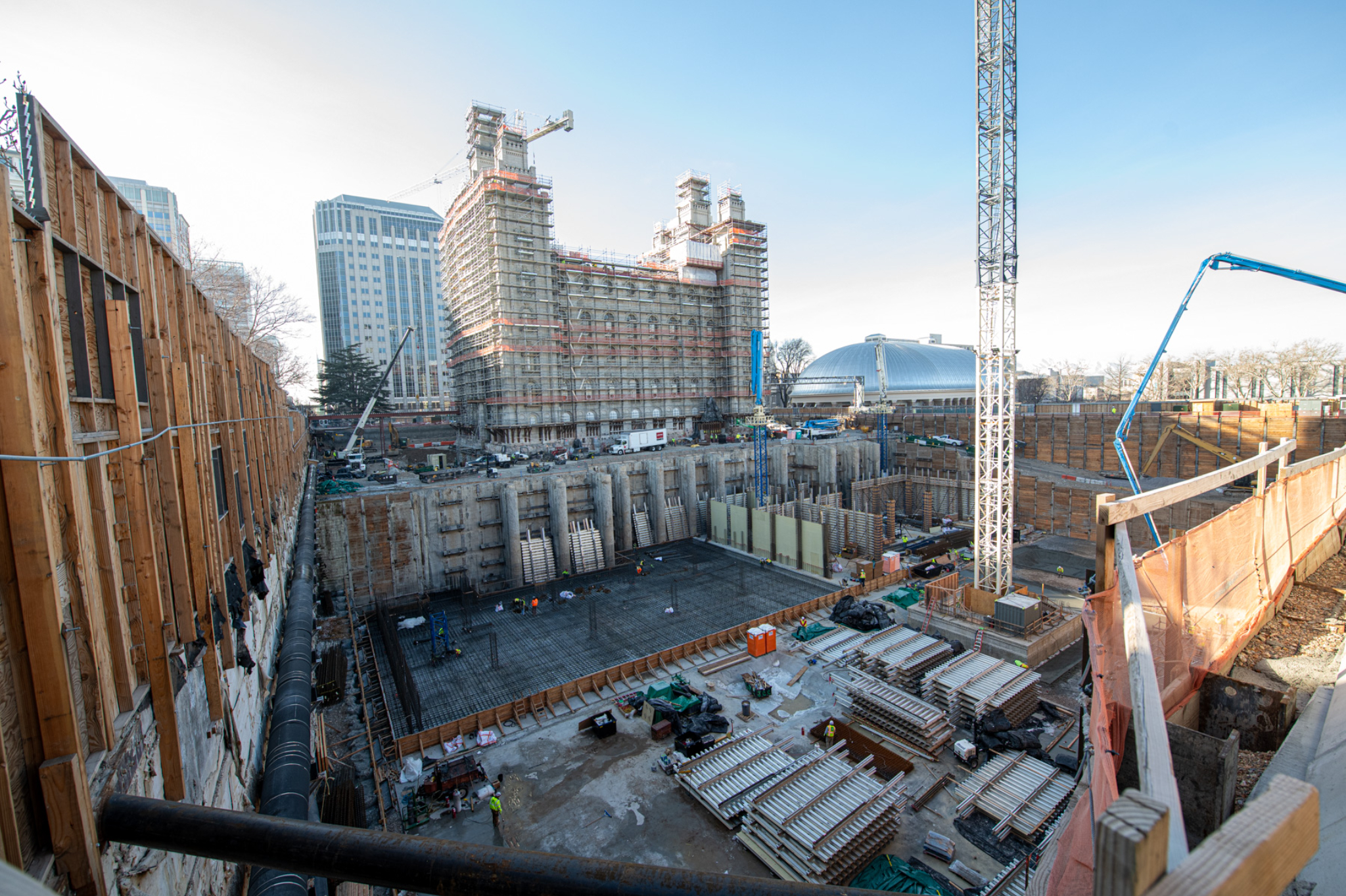 Little remains of the North Visitors’ Center after its demolition during the Temple Square renovation project, Salt Lake City, Utah, January 2022.© 2022 by Intellectual Reserve, Inc. All rights reserved.A second large concrete pour was completed two weeks ago in the area shown below. It created the bottom foundation for the temple’s new three-level north addition.