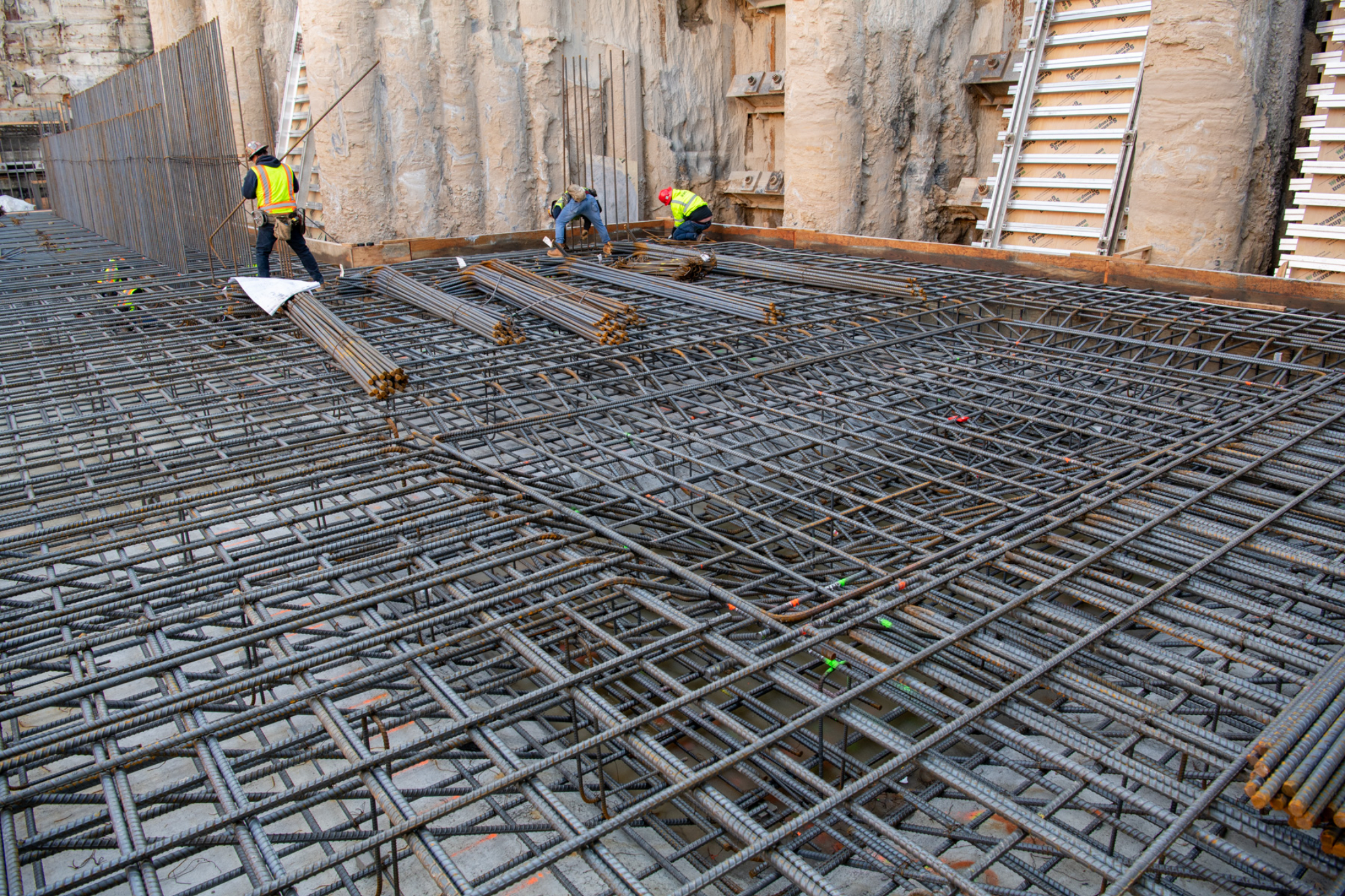 Workers prepare for a large concrete pour to create the foundation for the temple’s new three-level north addition, Salt Lake City, Utah, January 2022.© 2022 by Intellectual Reserve, Inc. All rights reserved.In this photo, workers are preparing the extensive steel reinforcement needed for the concrete pour.
