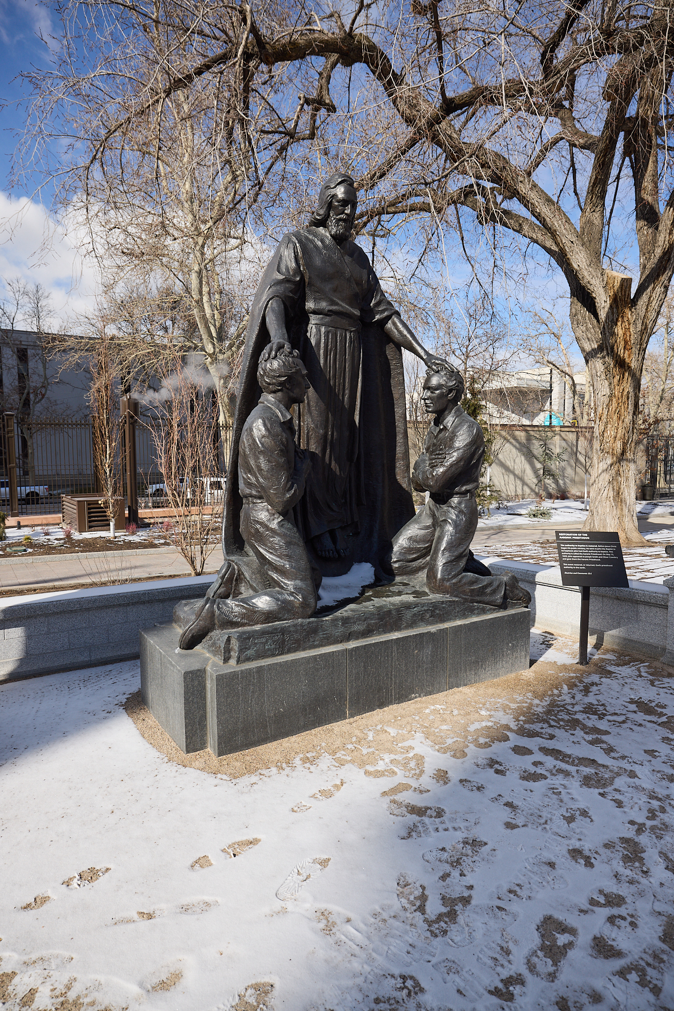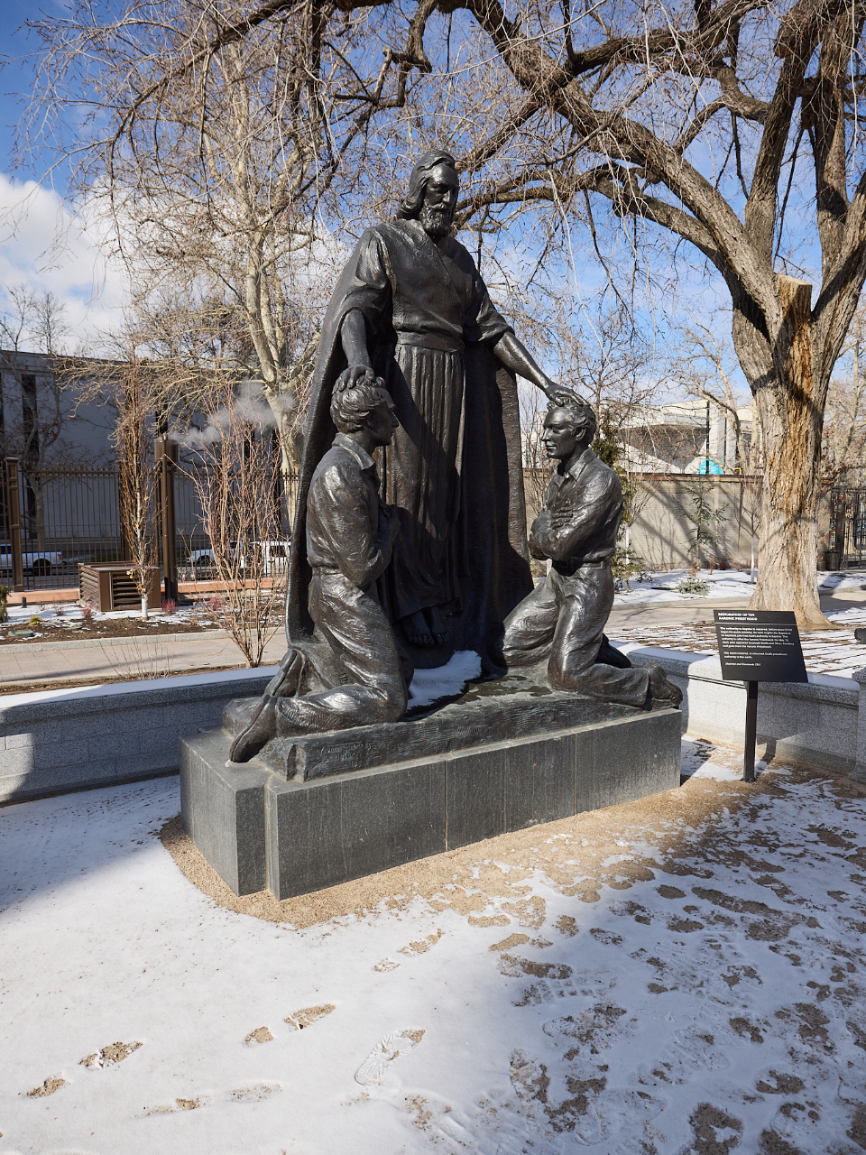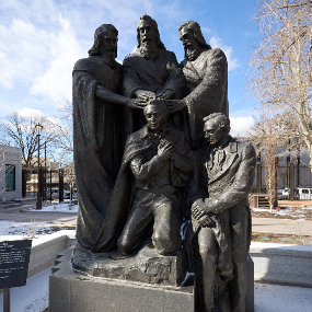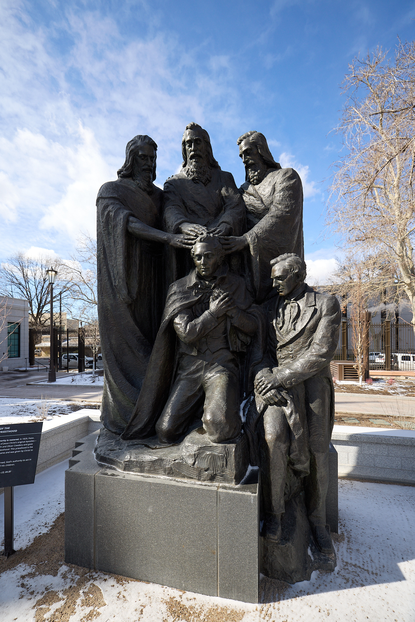 The southwest corner of Temple Square has reopened to the public. Landscaping is still underway, but visitors can enjoy seeing three newly restored monuments. These are the Seagull monument (original, 1913) and two monuments depicting the restoration of the priesthood. The first portrays Joseph Smith receiving the Melchizedek Priesthood from Apostles Peter, James and John (original, 2006), and the other depicts John the Baptist giving Joseph Smith and Oliver Cowdery the Aaronic Priesthood (original, 1957).
