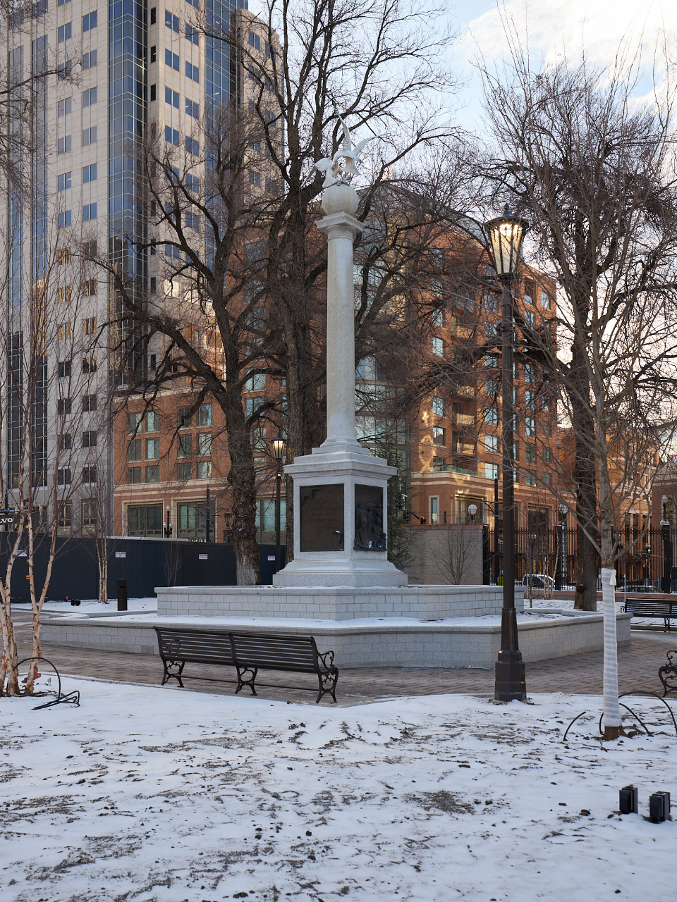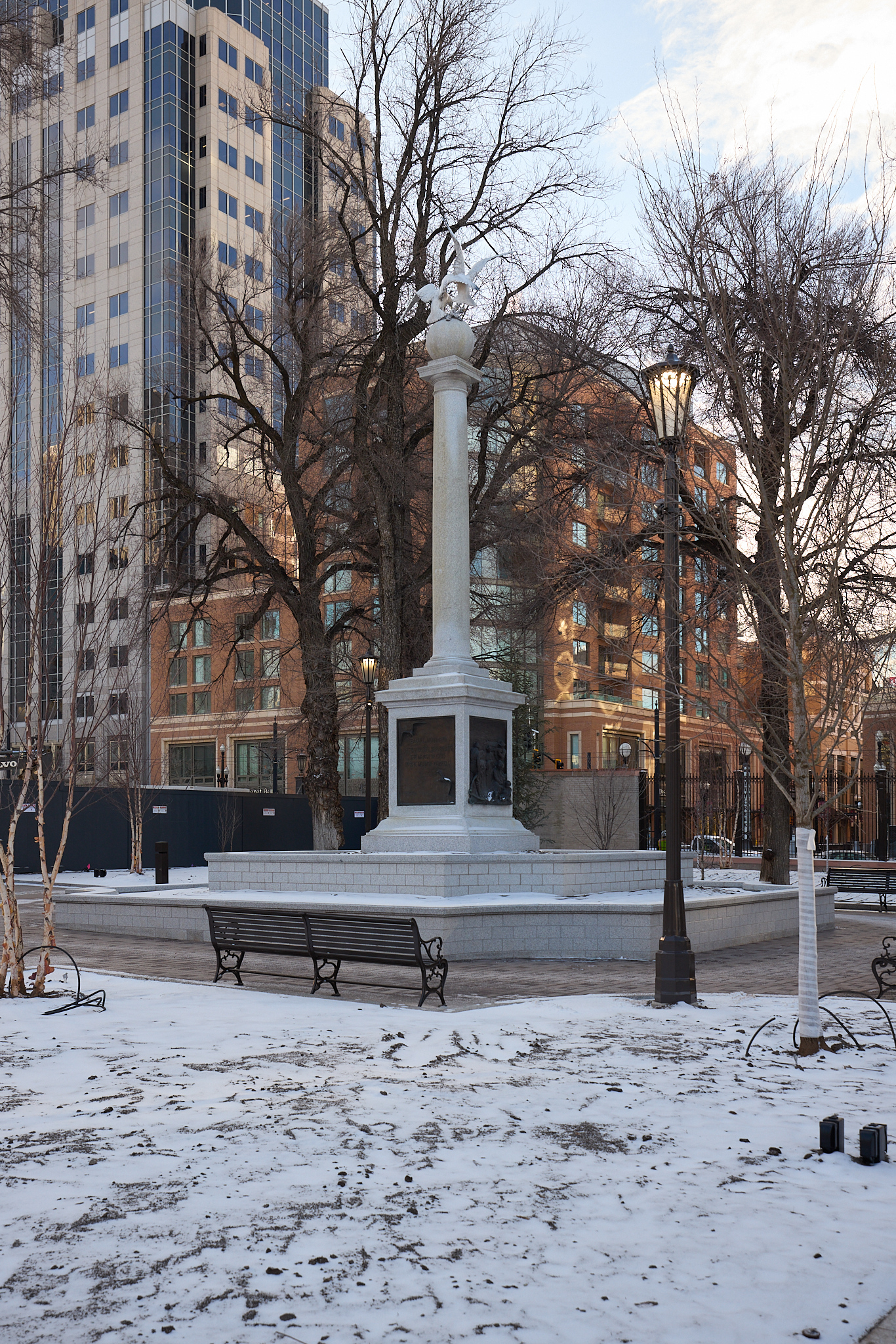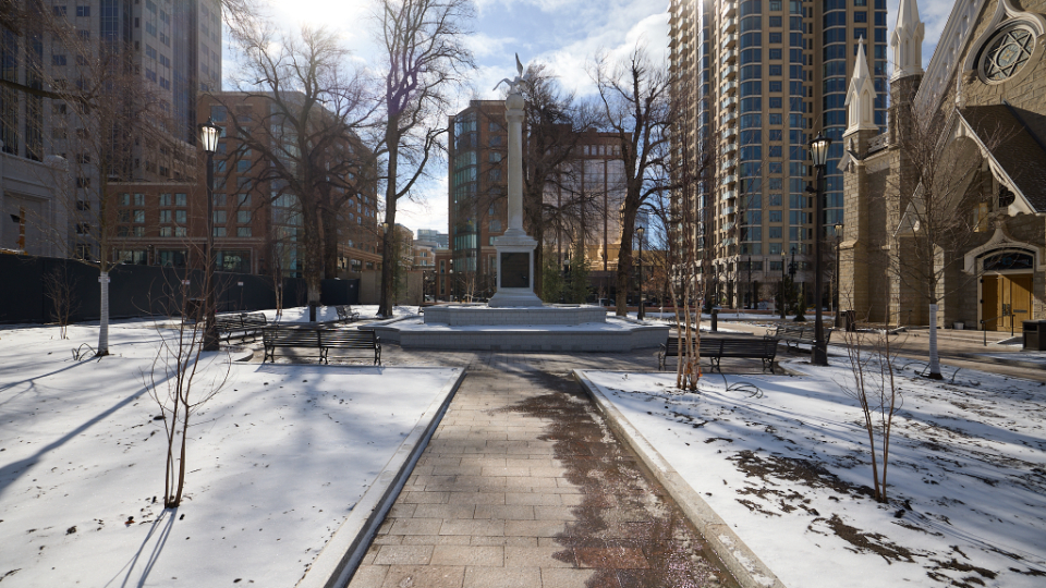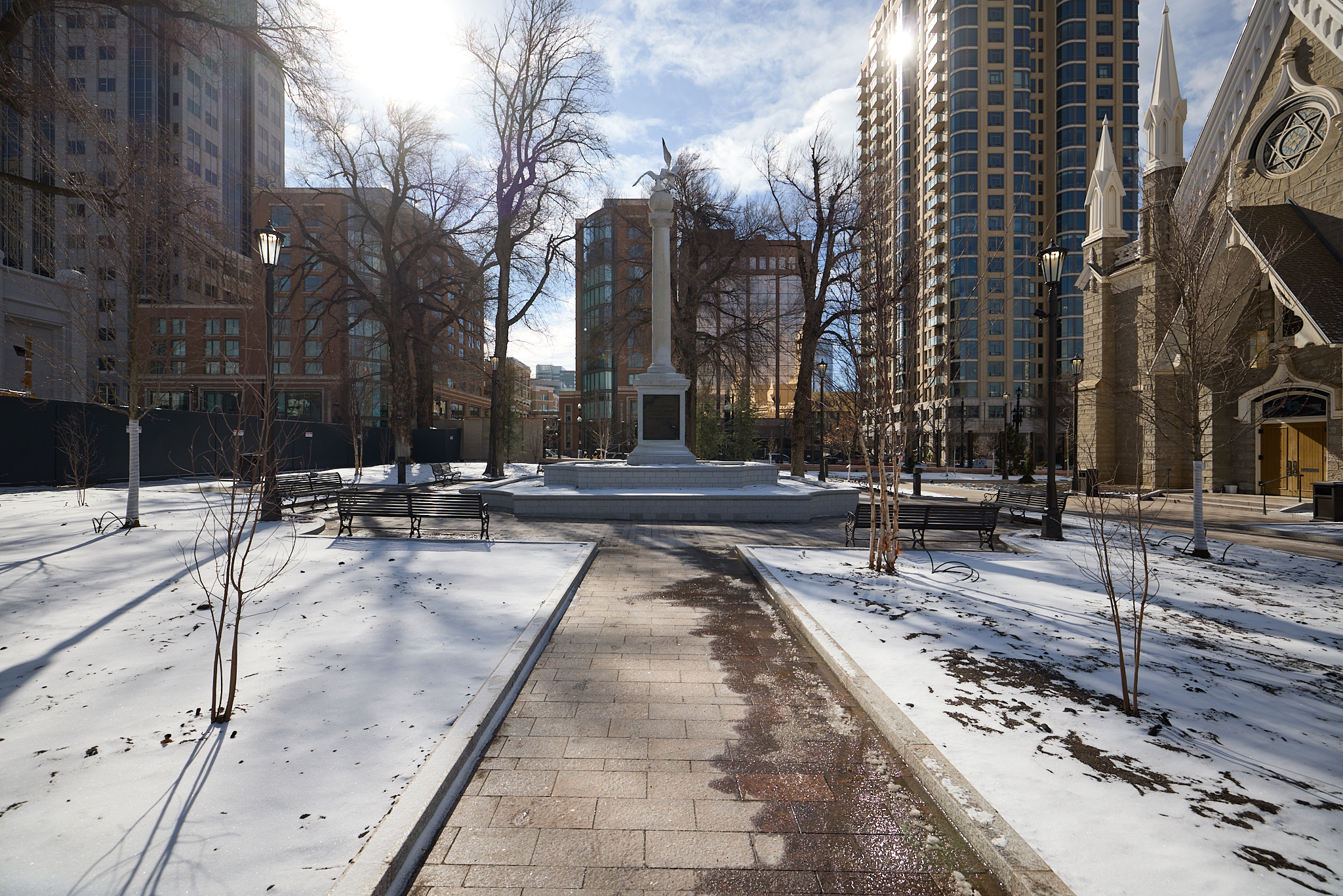 The southwest corner of Temple Square has reopened to the public. Landscaping is still underway, but visitors can enjoy seeing three newly restored monuments. These are the Seagull monument (original, 1913) and two monuments depicting the restoration of the priesthood. The first portrays Joseph Smith receiving the Melchizedek Priesthood from Apostles Peter, James and John (original, 2006), and the other depicts John the Baptist giving Joseph Smith and Oliver Cowdery the Aaronic Priesthood (original, 1957).