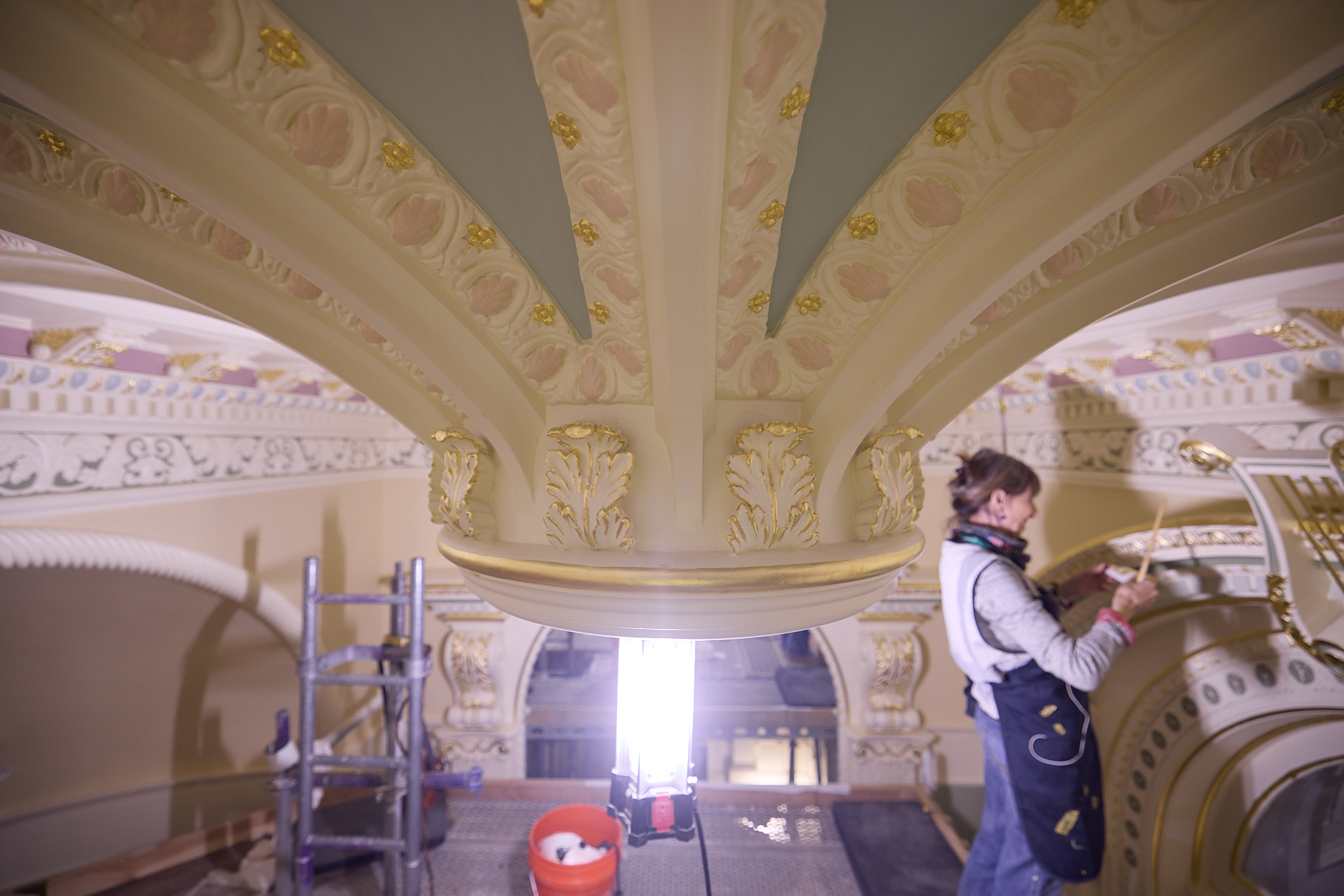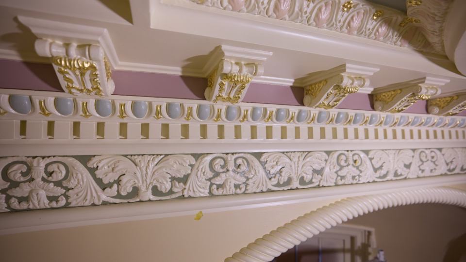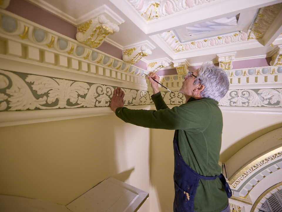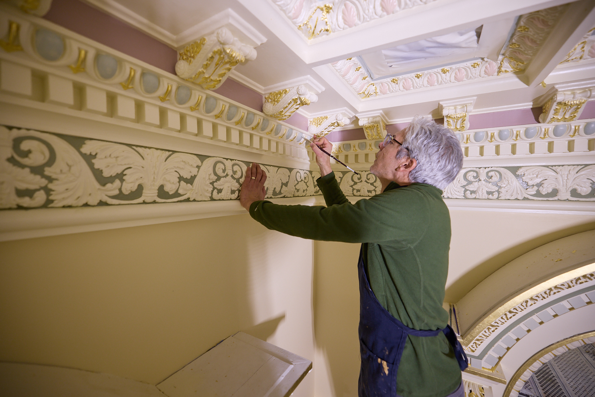 Artist does delicate finish work in one of the sealing rooms in the north addition of the Salt Lake Temple on Wednesday, February 12, 2025.2025 by Intellectual Reserve, Inc. All rights reserved.Inside the historic temple, finish work is underway in the celestial room and adjoining original sealing rooms, which had to undergo abatement work to remove lead-based paint.