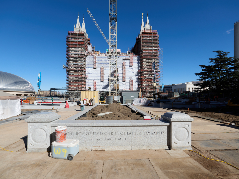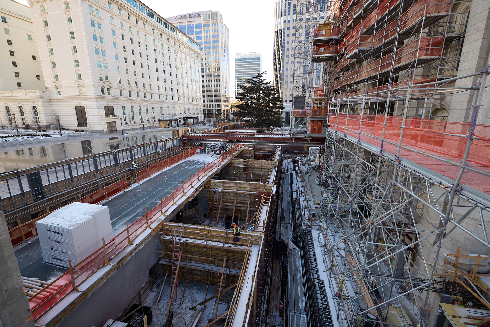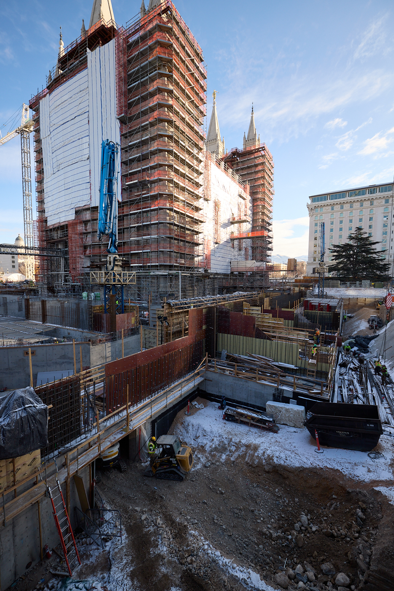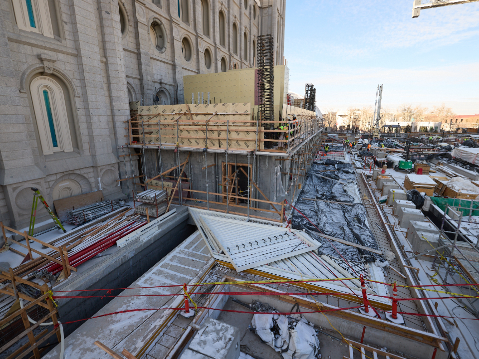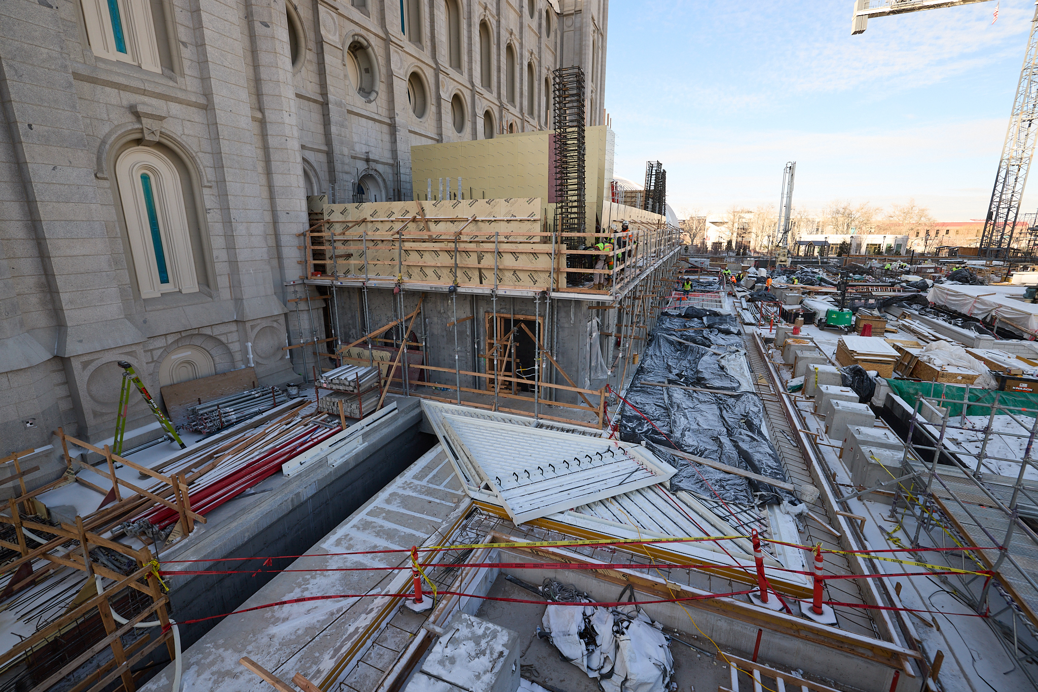 The sealing wing addition, attached to the north wall of the Salt Lake Temple, is currently being built. The wing, which will include five additional sealing rooms, rests on base isolators like the new seismically designed foundation of the historic temple.