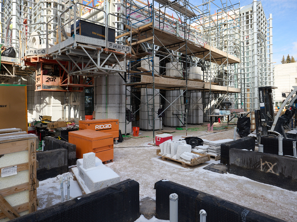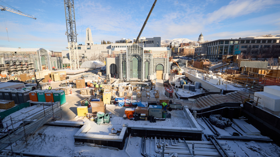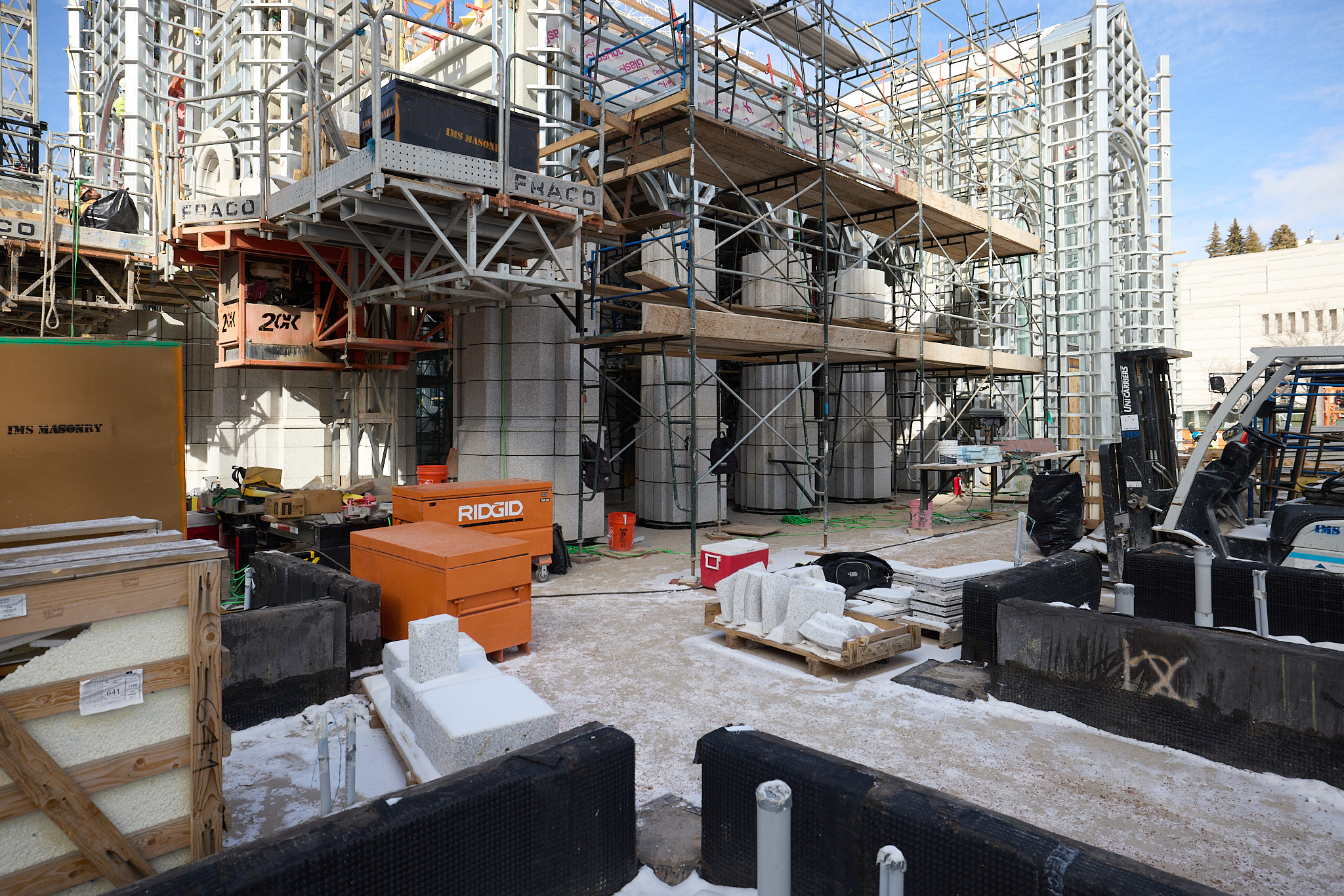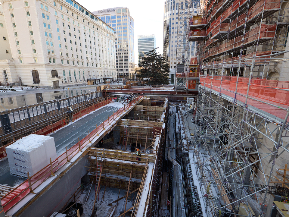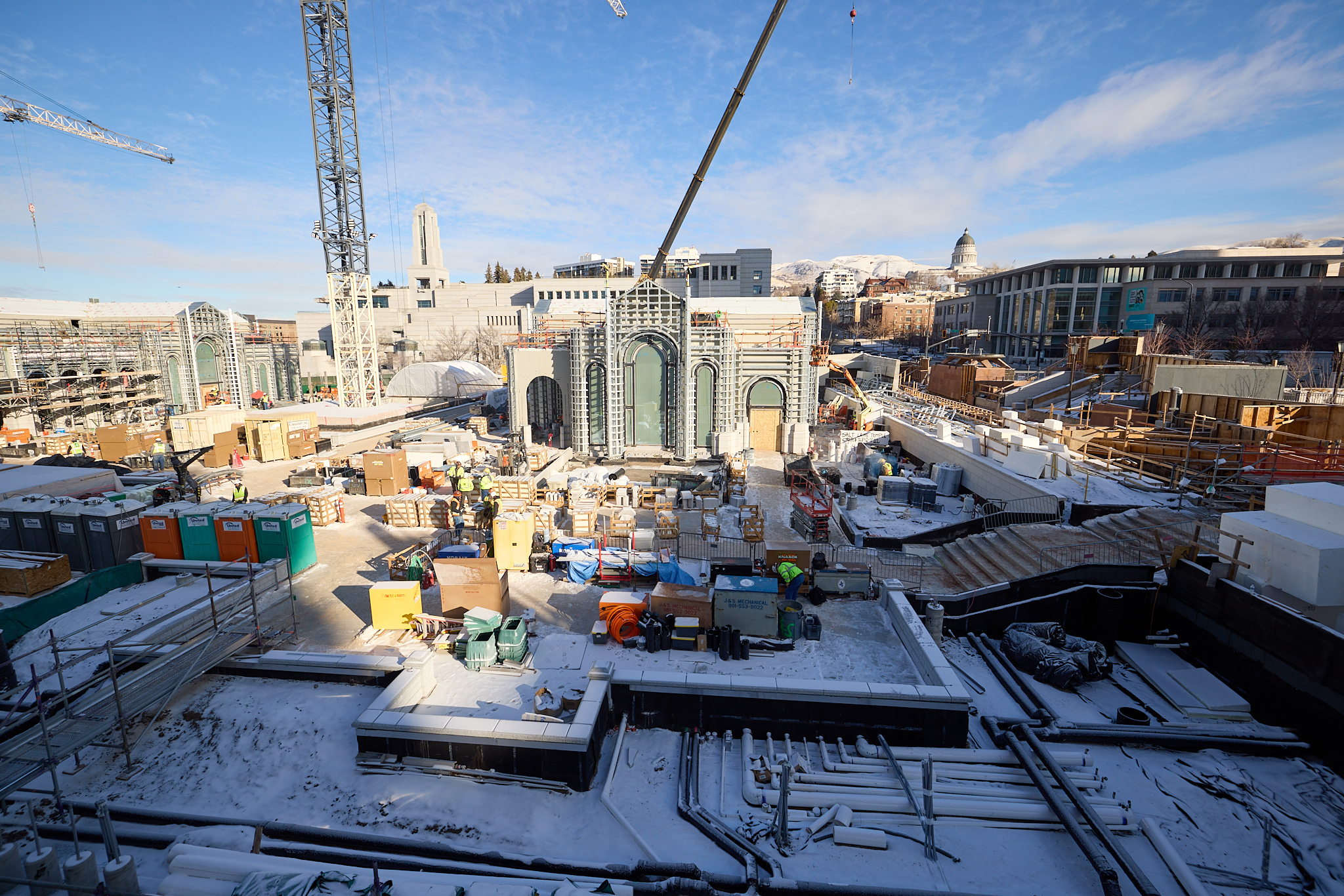 The sealing wing addition, attached to the north wall of the Salt Lake Temple, is currently being built. The wing, which will include five additional sealing rooms, rests on base isolators like the new seismically designed foundation of the historic temple.