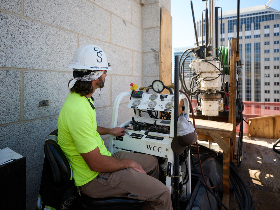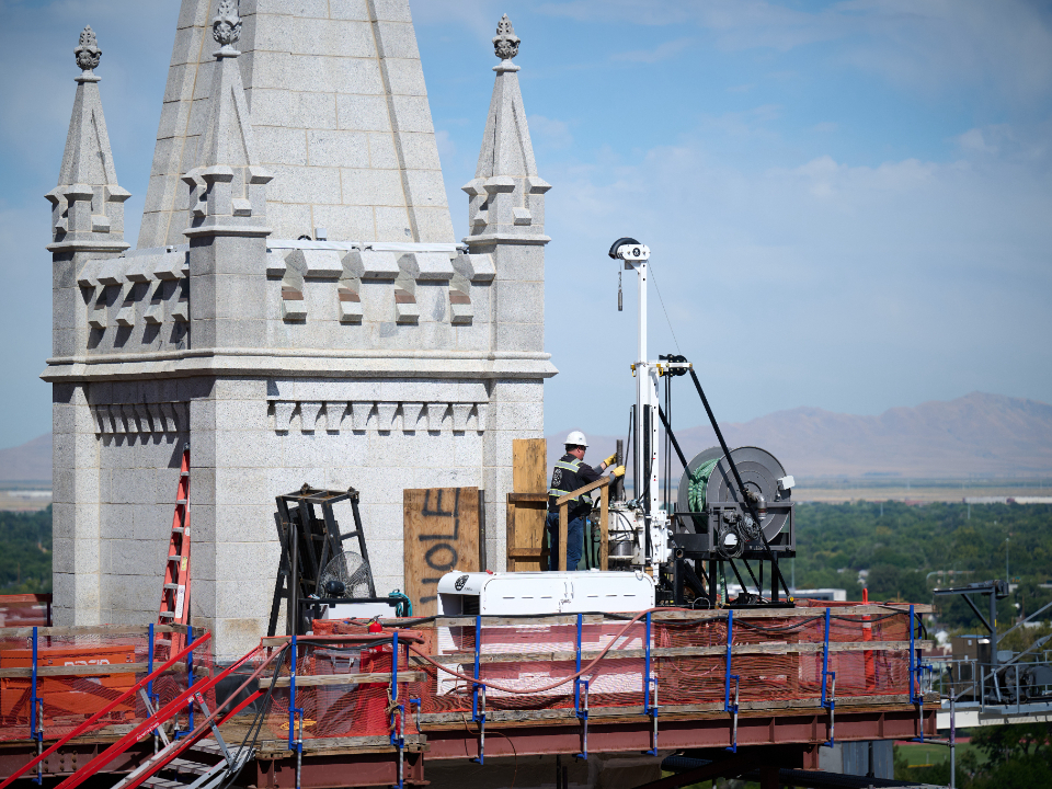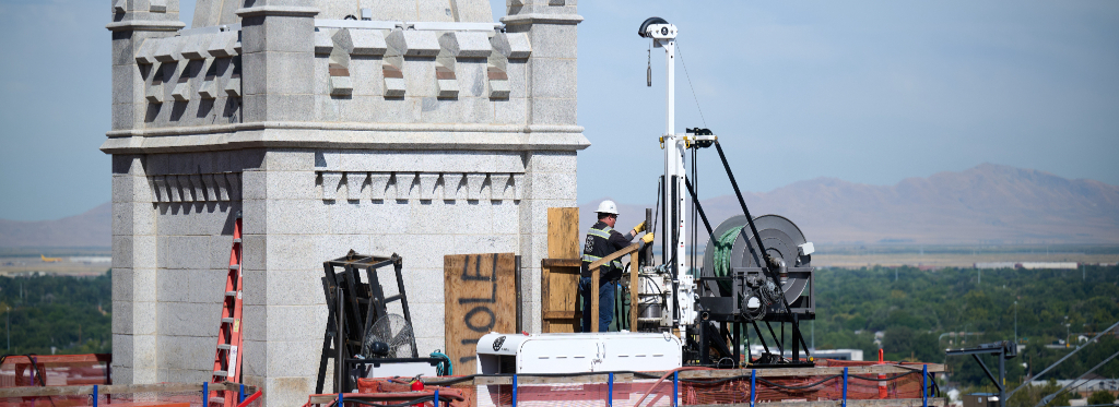 The Salt Lake Temple renovation project recently hit another milestone with the completion of vertical coring. This monumental three-year process (the most extensive single activity on-site to date) entailed drilling 46 holes through its granite-like (quartz monzonite) stone walls, from the tops of each corner of its six towers to the new upper foundations over which the sacred structure now rests.