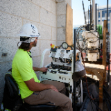 The holes were reamed and now house bundles of post-tension cables, part of the temple’s seismic upgrade base isolation system. The steel cables are attached to reinforced steel structures in the towers and roof, threaded through the temple exterior walls and attached to its new foundation, then tightened to half a million pounds. The tension compresses the historic structure to withstand high-magnitude earthquakes.