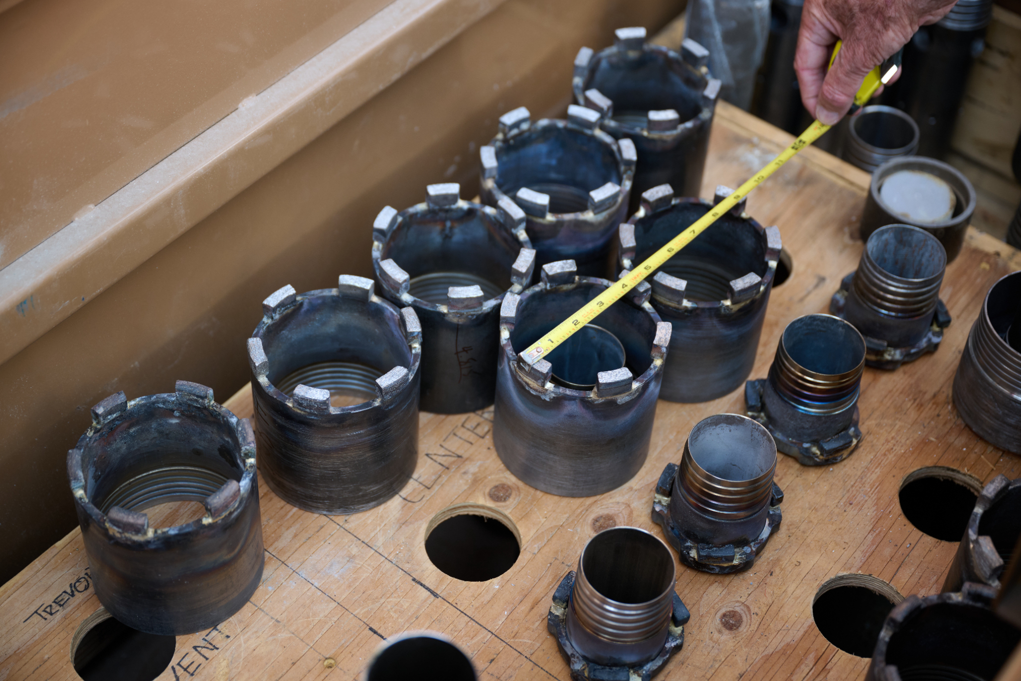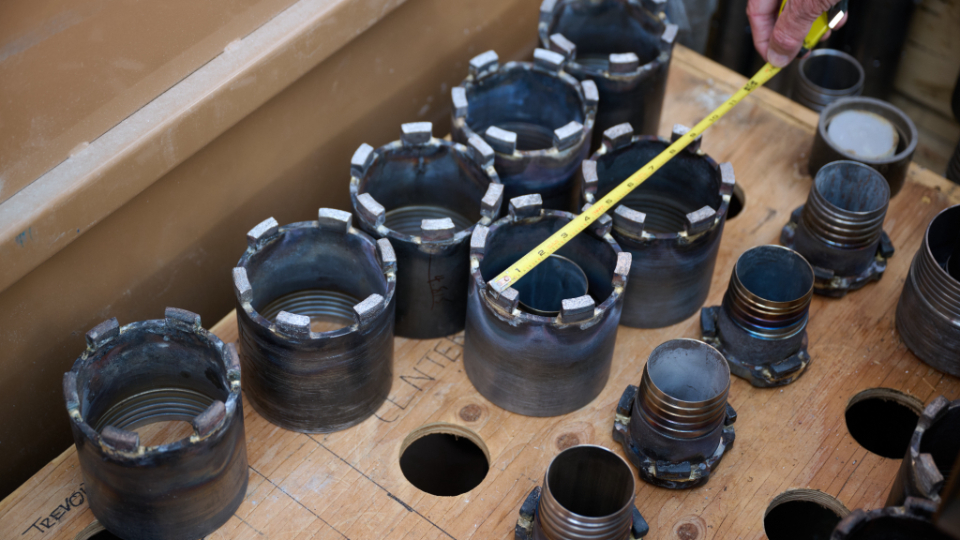 Drill bits used during the vertical coring process of the Salt Lake Temple in Salt Lake City, Utah, on Wednesday, August 14, 2024.2025 by Intellectual Reserve, Inc. All rights reserved.Hollow, diamond-edged drill bits were attached to hollow drill rods five feet long and about two and a half inches in diameter. The drill rods were threaded and connected to form what are called drill strings.