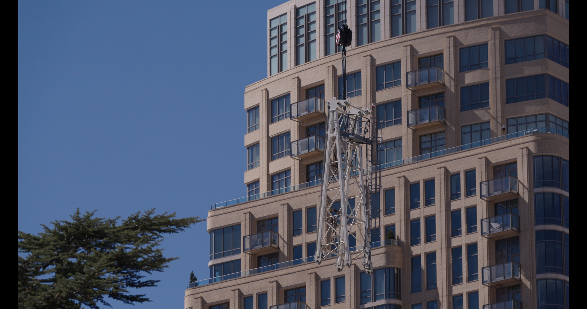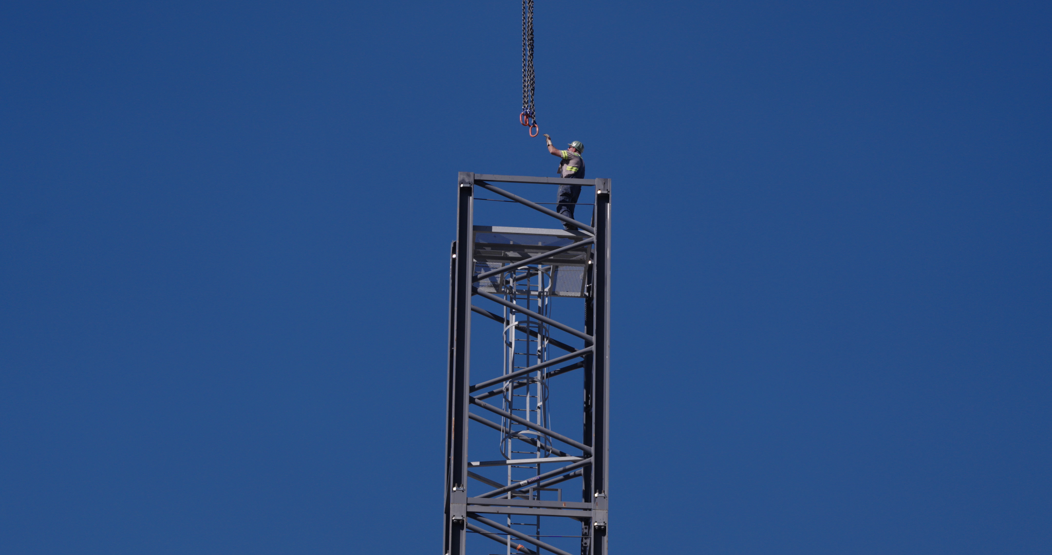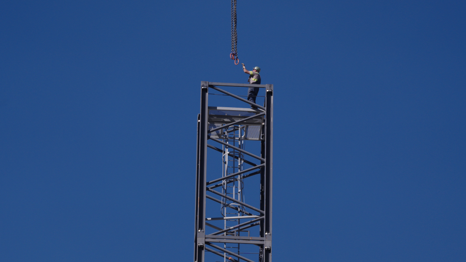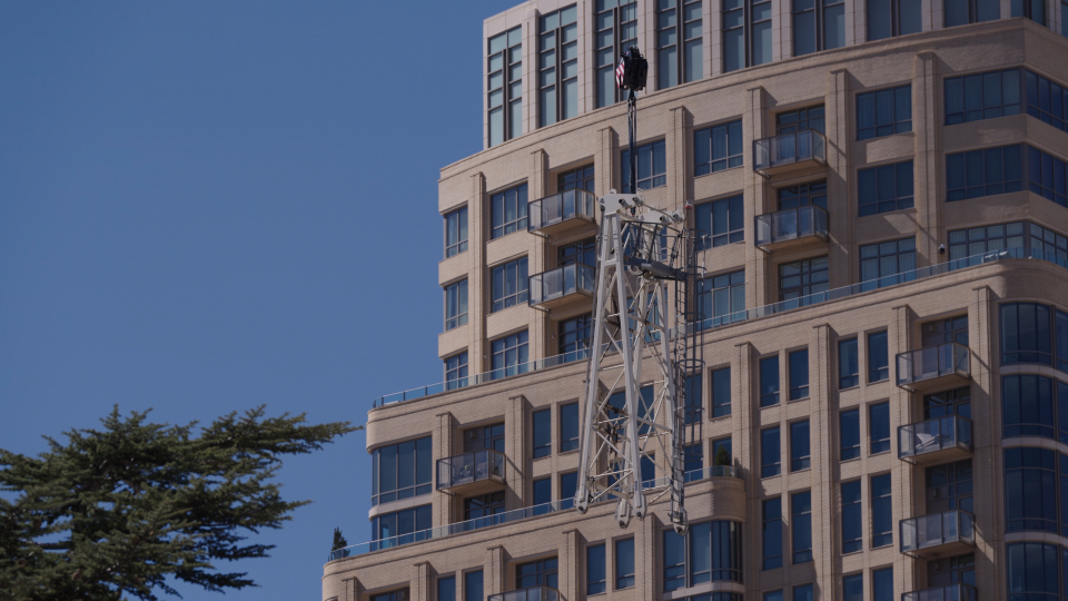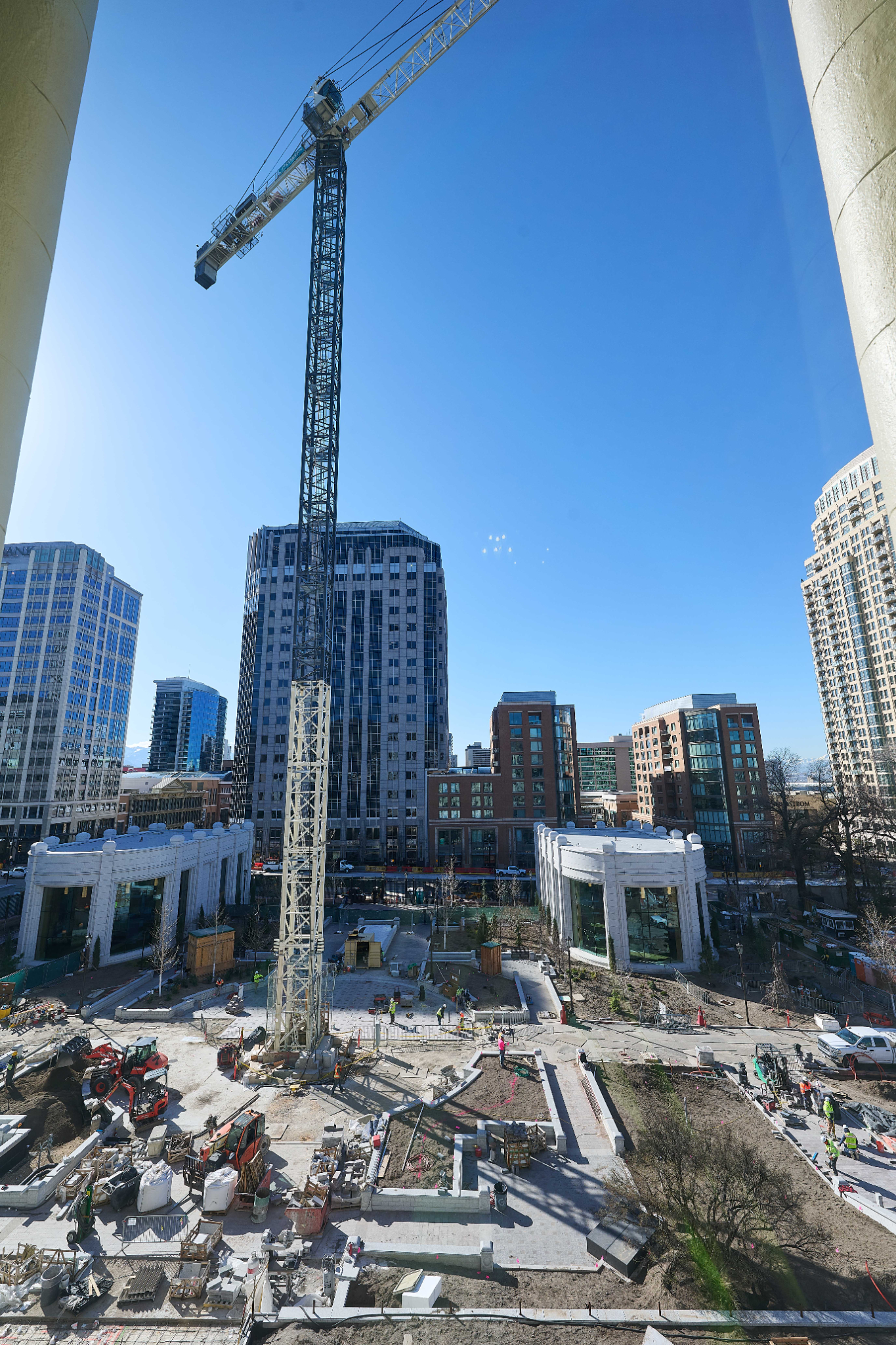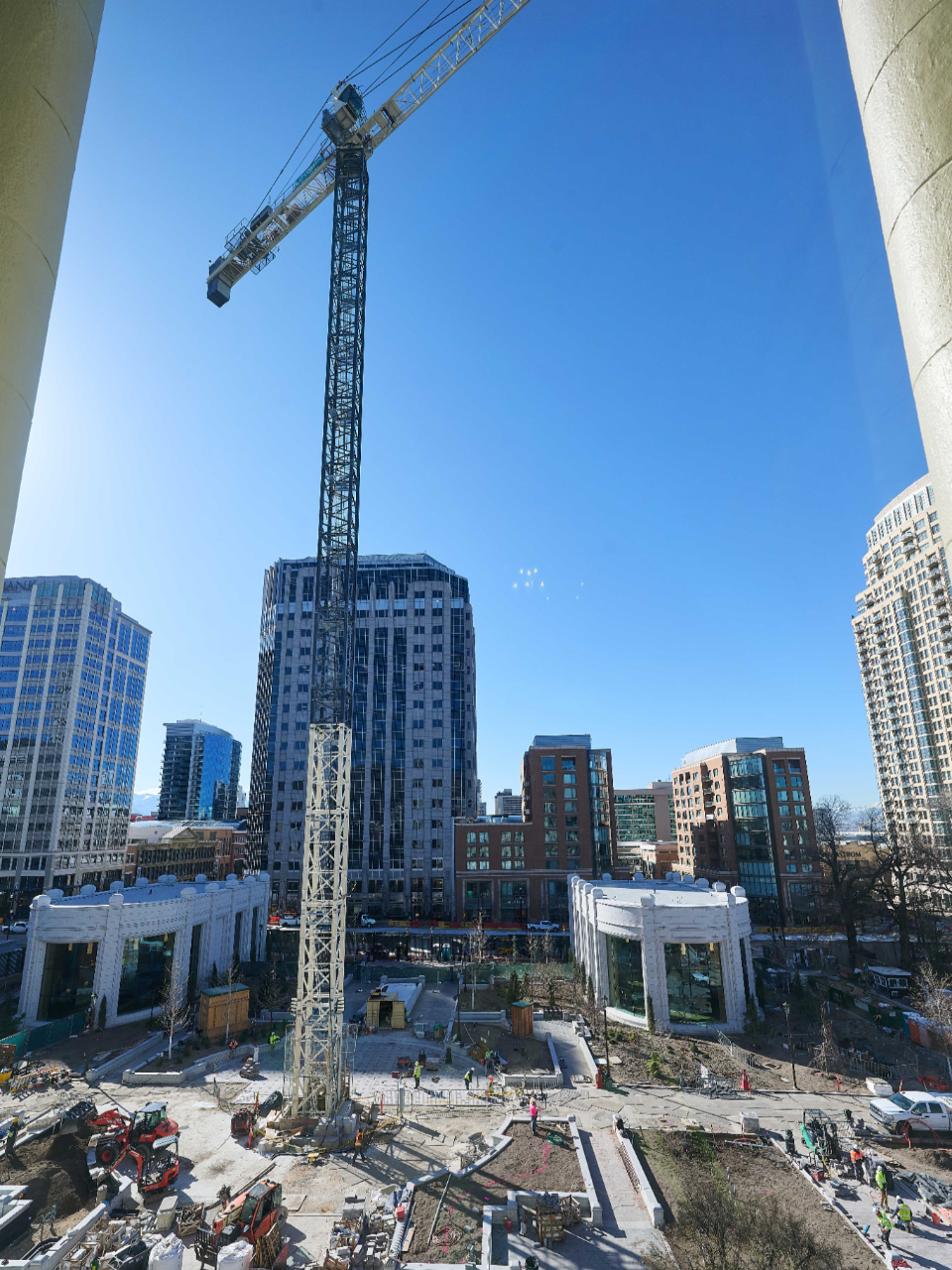 During construction, the cranes helped move large stones, structural components, mechanical systems and many other loads used throughout the project.