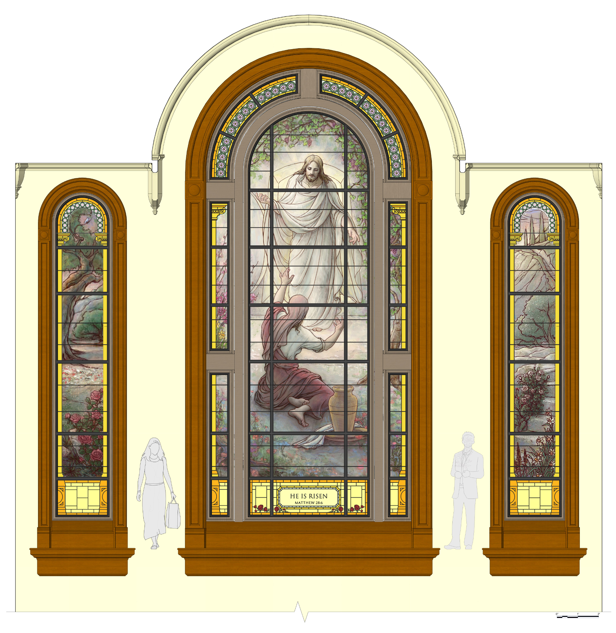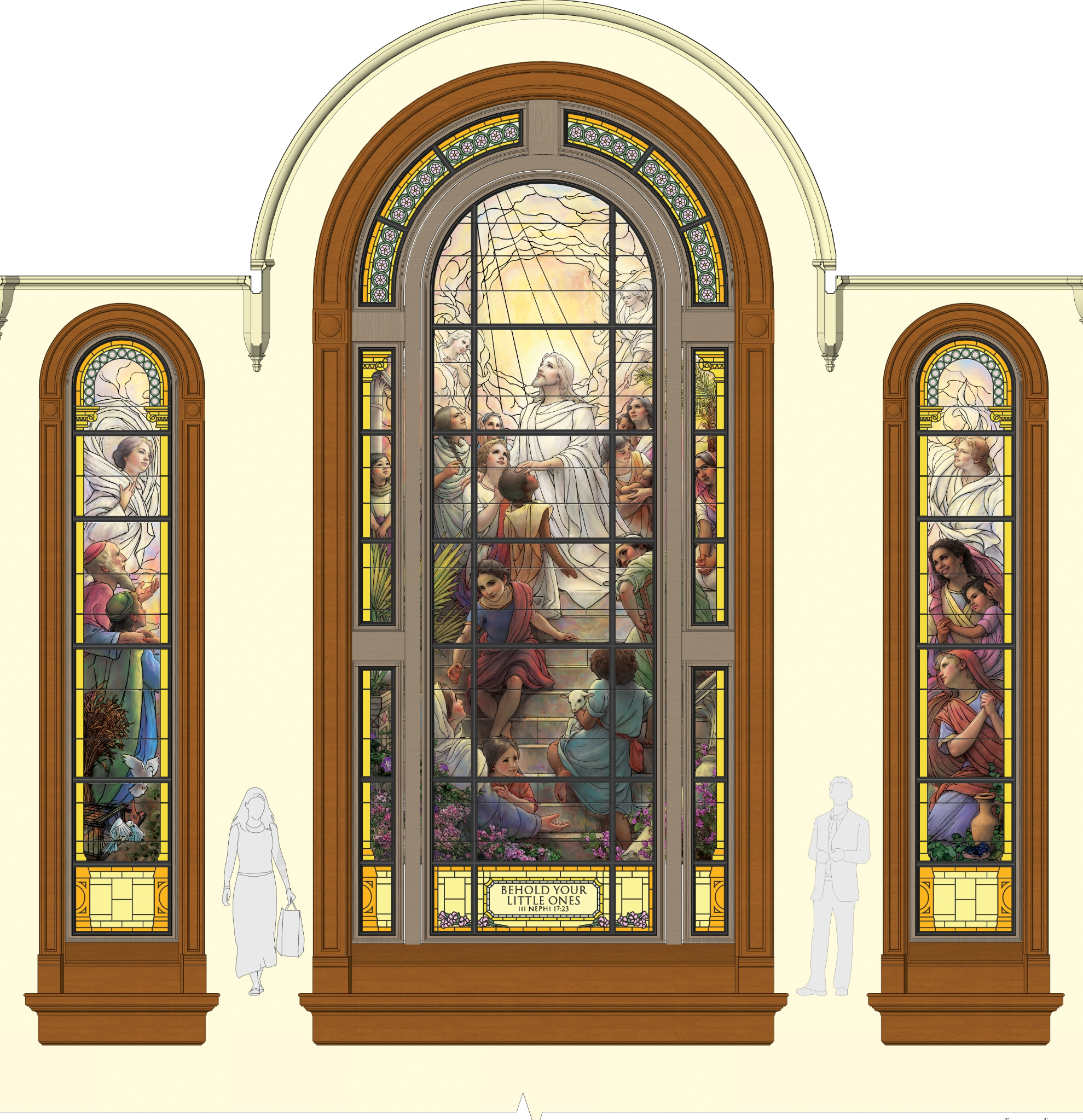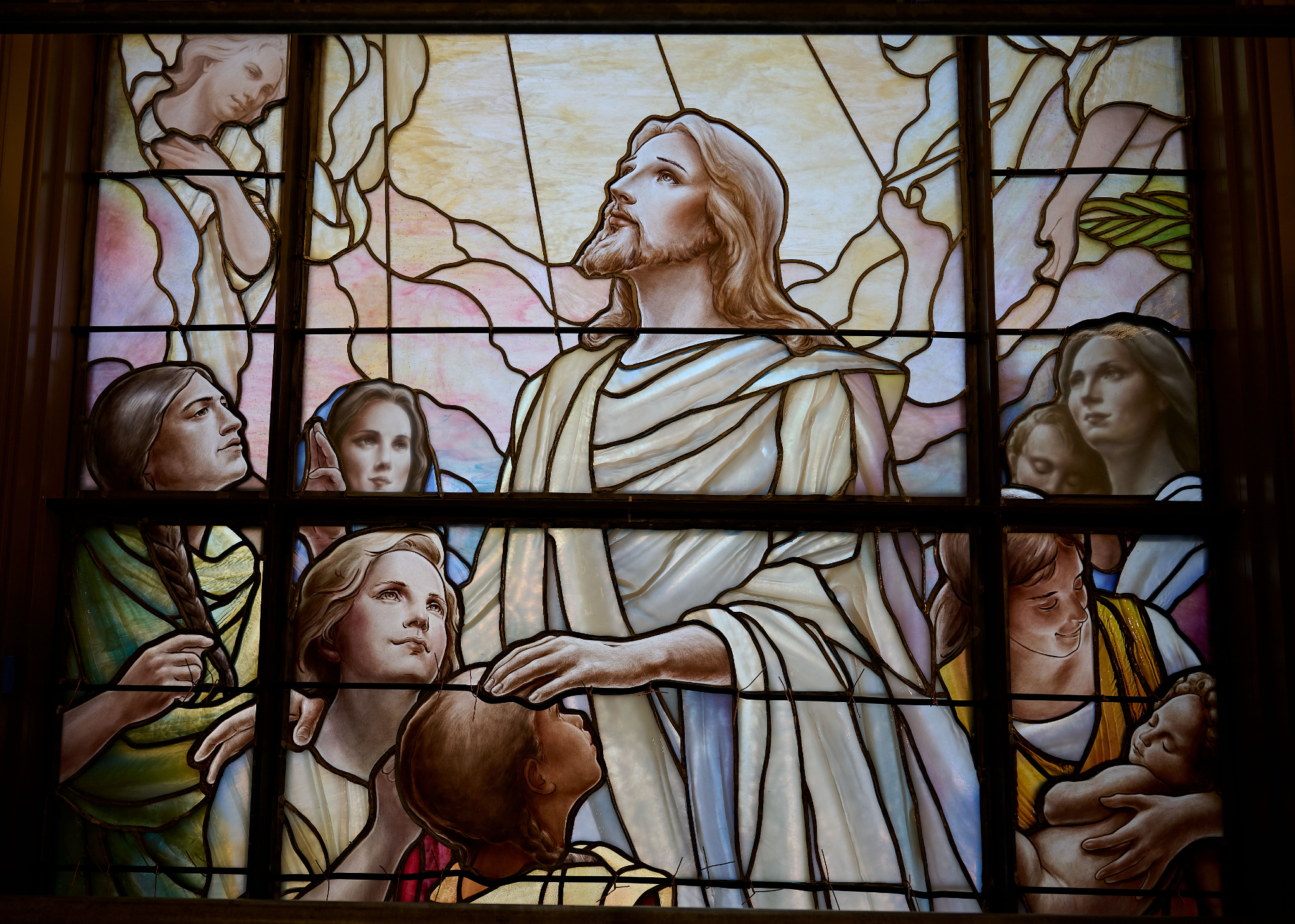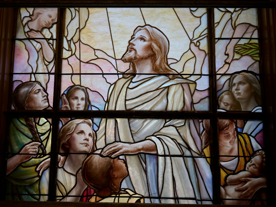 The artwork depicts sacred scenes from the life, ministry and teachings of Jesus Christ. One piece portrays the account of Christ ministering to children found in 3 Nephi 17, while another depicts the New Testament account of the resurrected Savior appearing to Mary Magdalene.