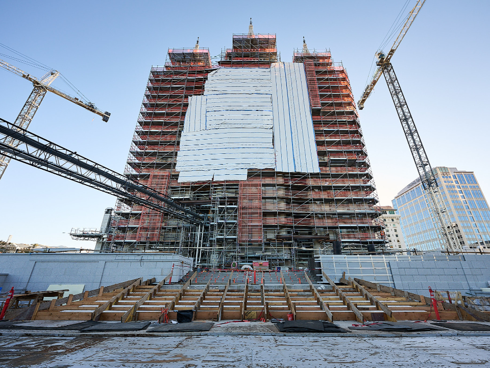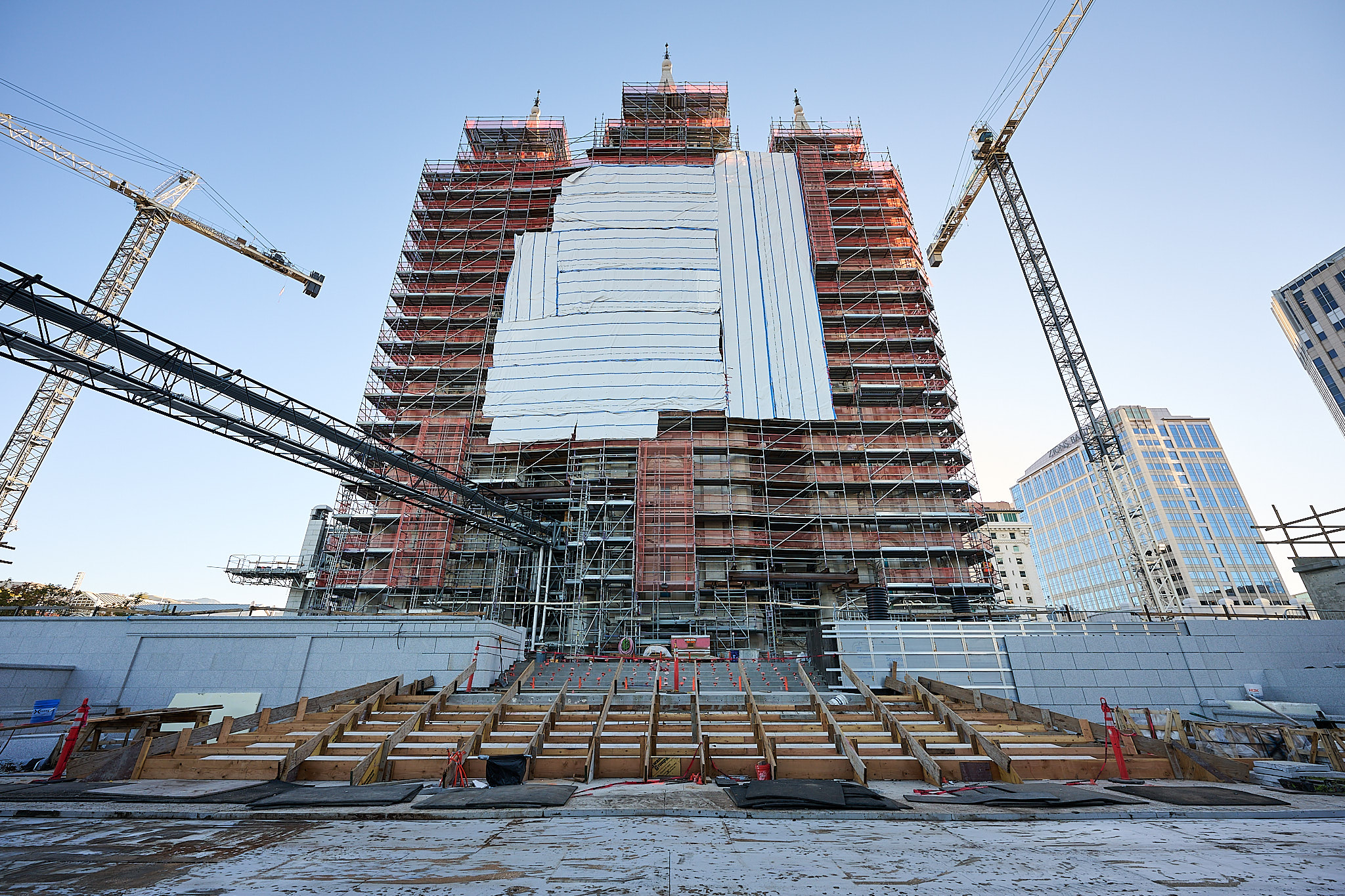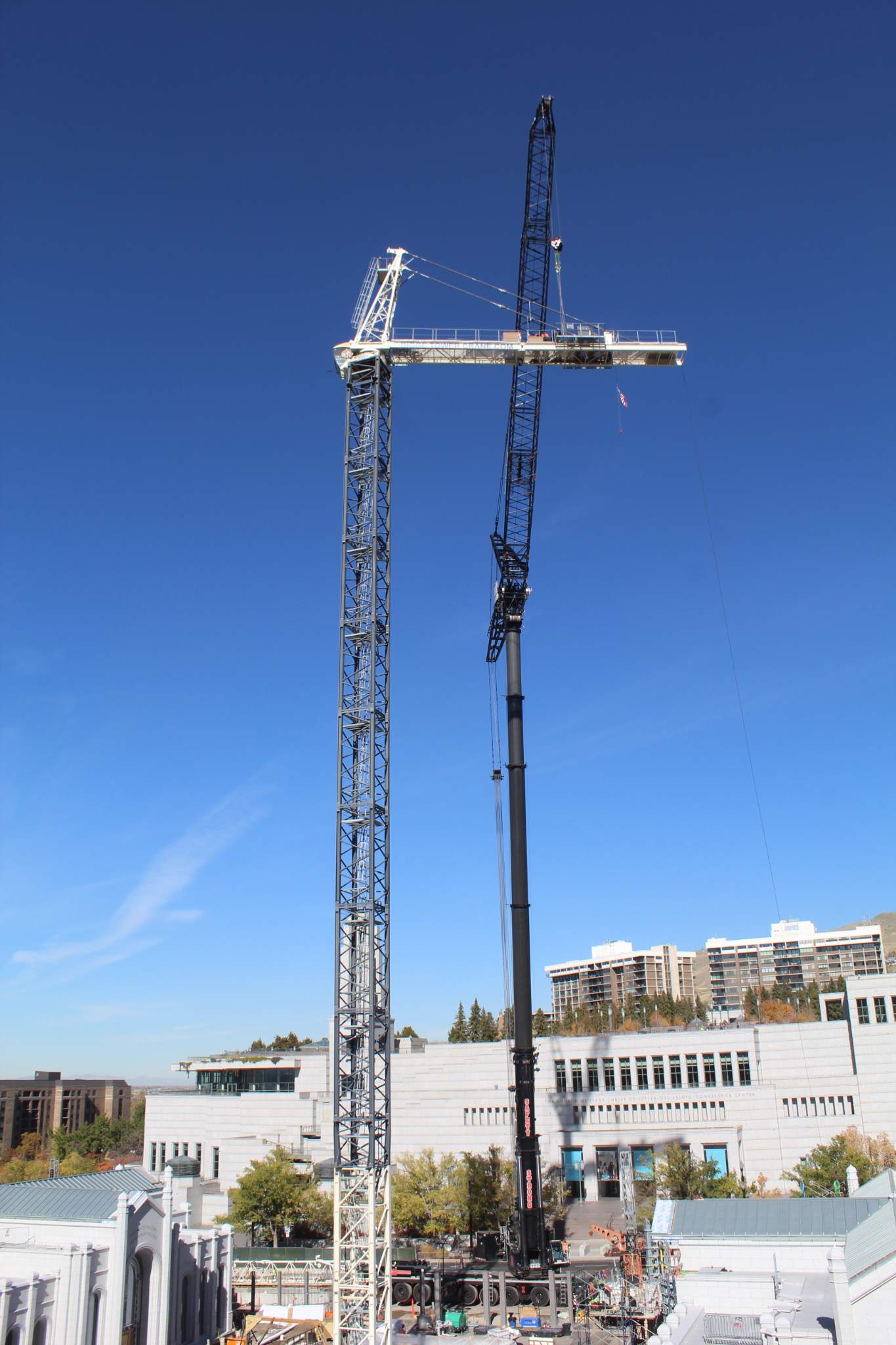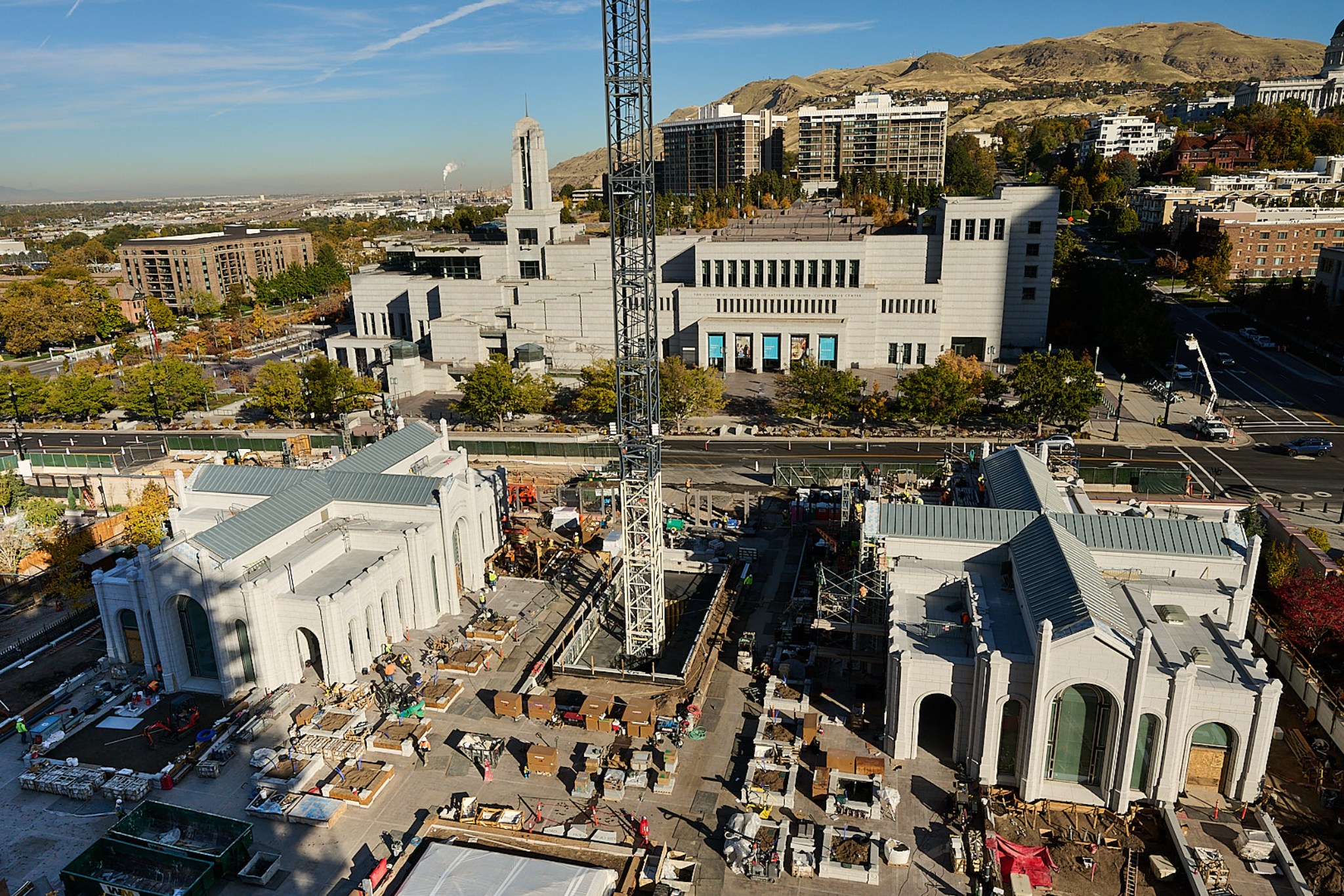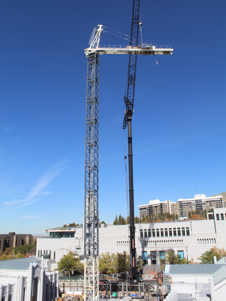 The 270-foot-tall north tower crane is removed, while construction begins on a new accessible entrance for the Relief Society Building