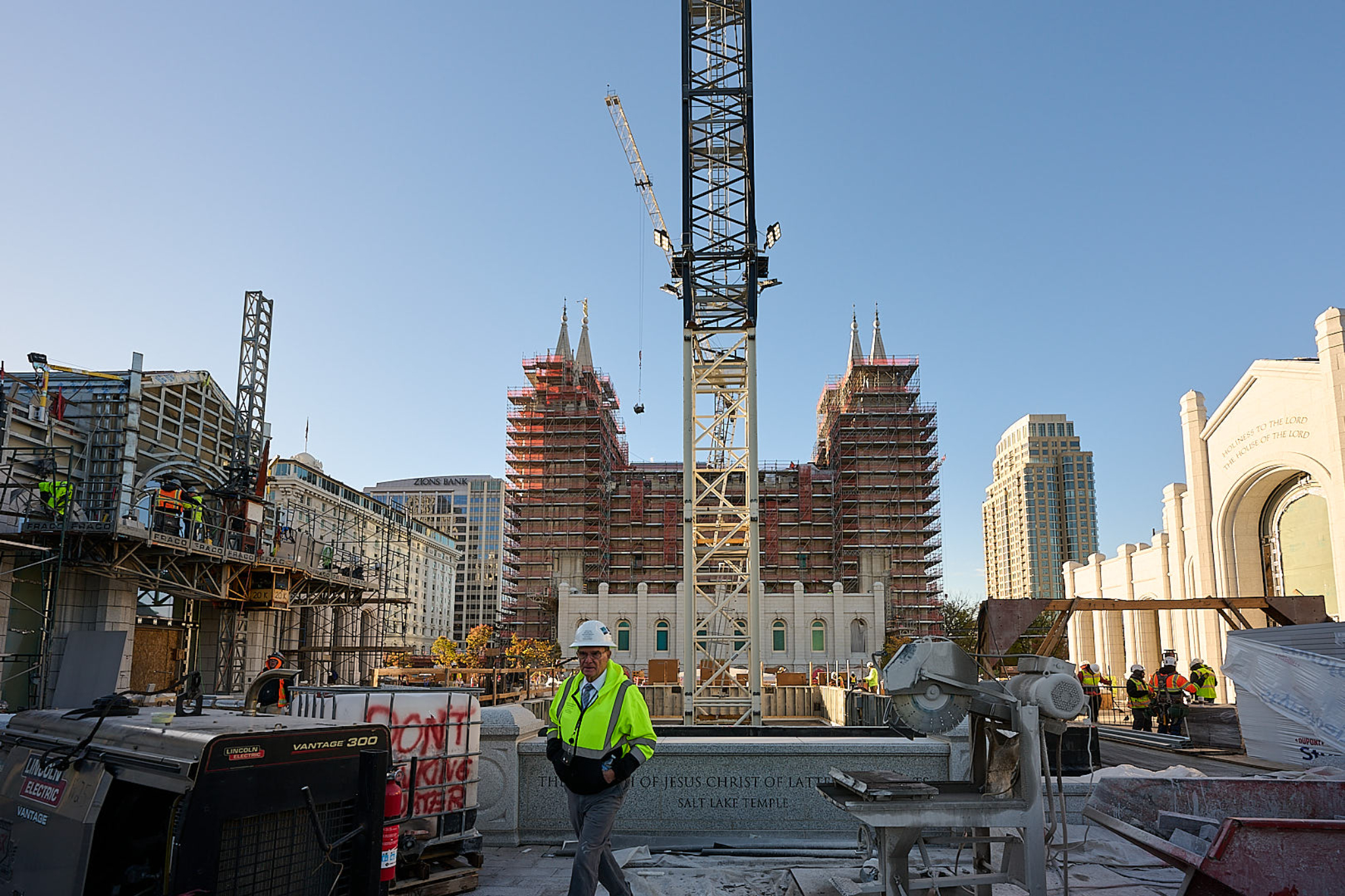 The crane can lift approximately 35,000 pounds at its base and 10,000 pounds at its tip, enabling crews to move heavy loads that would otherwise be impossible to position in the north addition of the temple.
