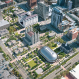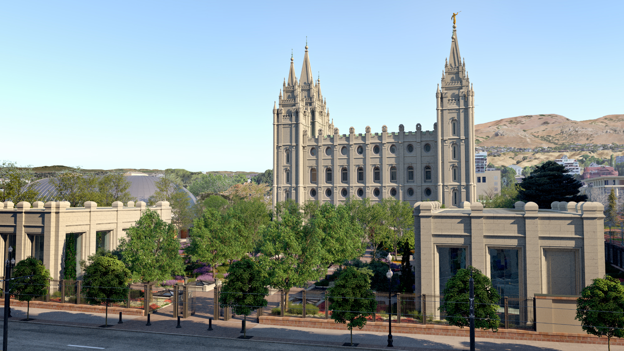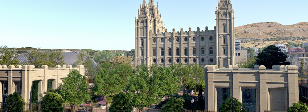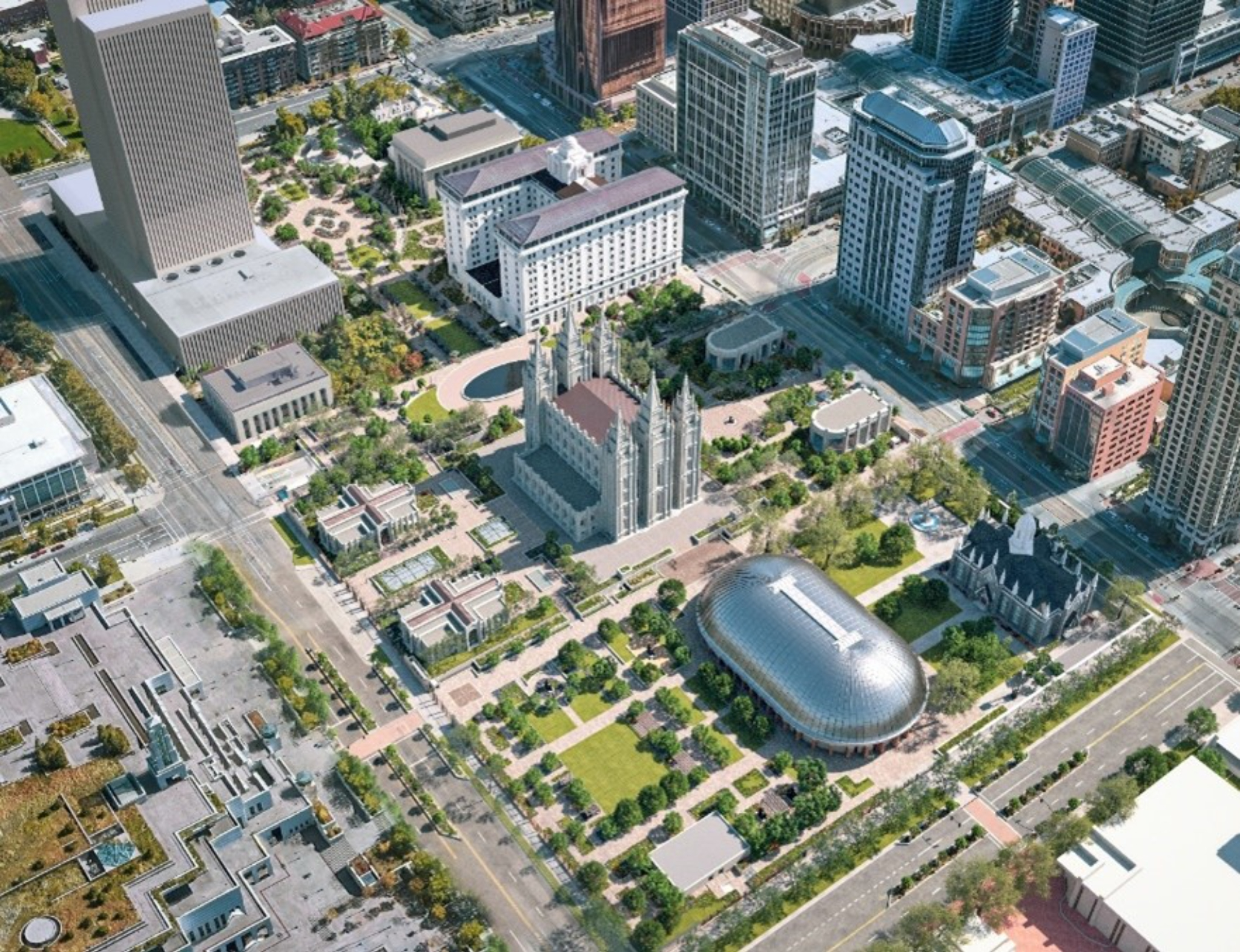 A rendering of the completed renovation project of Temple Square in Salt Lake City, Utah. The new guest pavilions can be seen on the south end. © 2022 by Intellectual Reserve, Inc. All rights reserved.