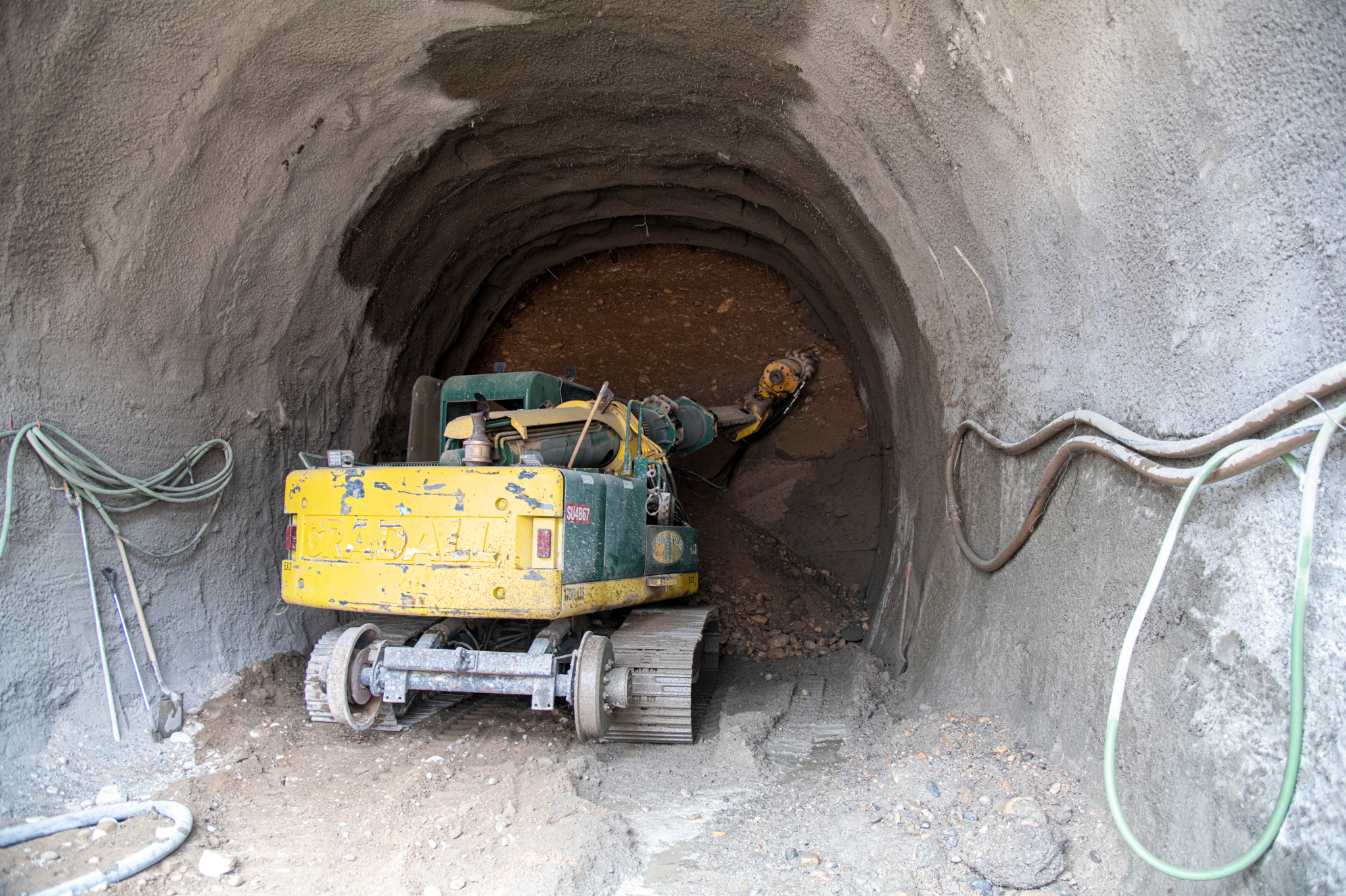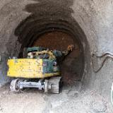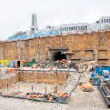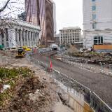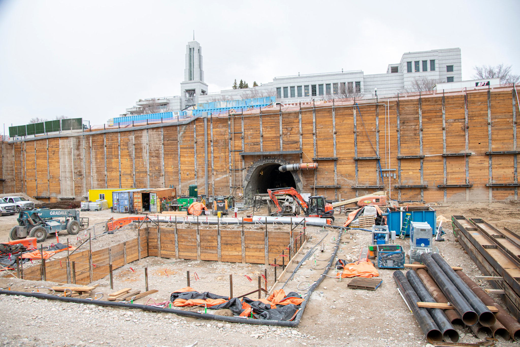 The excavation to create a tunnel underneath North Temple is underway. This tunnel will connect the Conference Center parking lot to the underground temple entrance to create safer and easier access for visitors to the temple. Previously, canopy tubes were installed at the upper perimeter of the tunnel to provide a support frame before drilling and excavation began. The excavation is now about halfway complete.