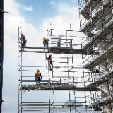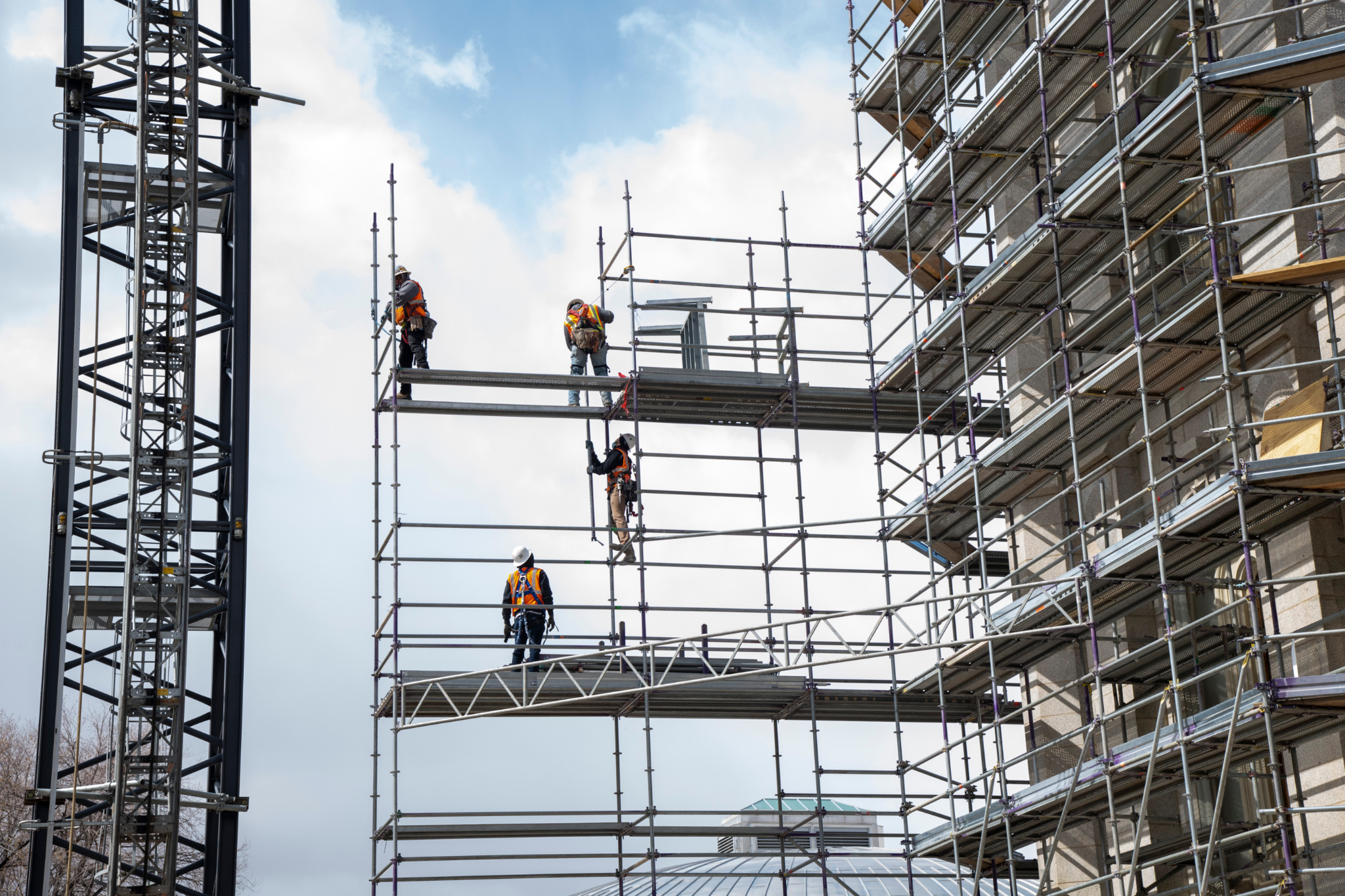 2021 by Intellectual Reserve, Inc. All rights reserved.The worker and material lift continue to be assembled. Workers are now constructing scaffolding bridges that will connect the lift to the scaffolding, which will surround the entire temple. The lift will provide access to the various floors of the temple.