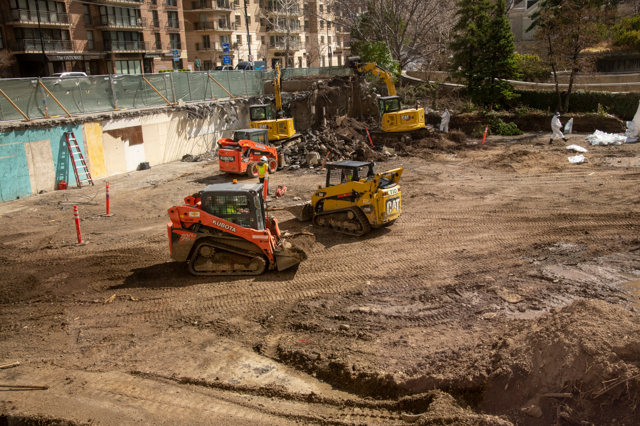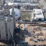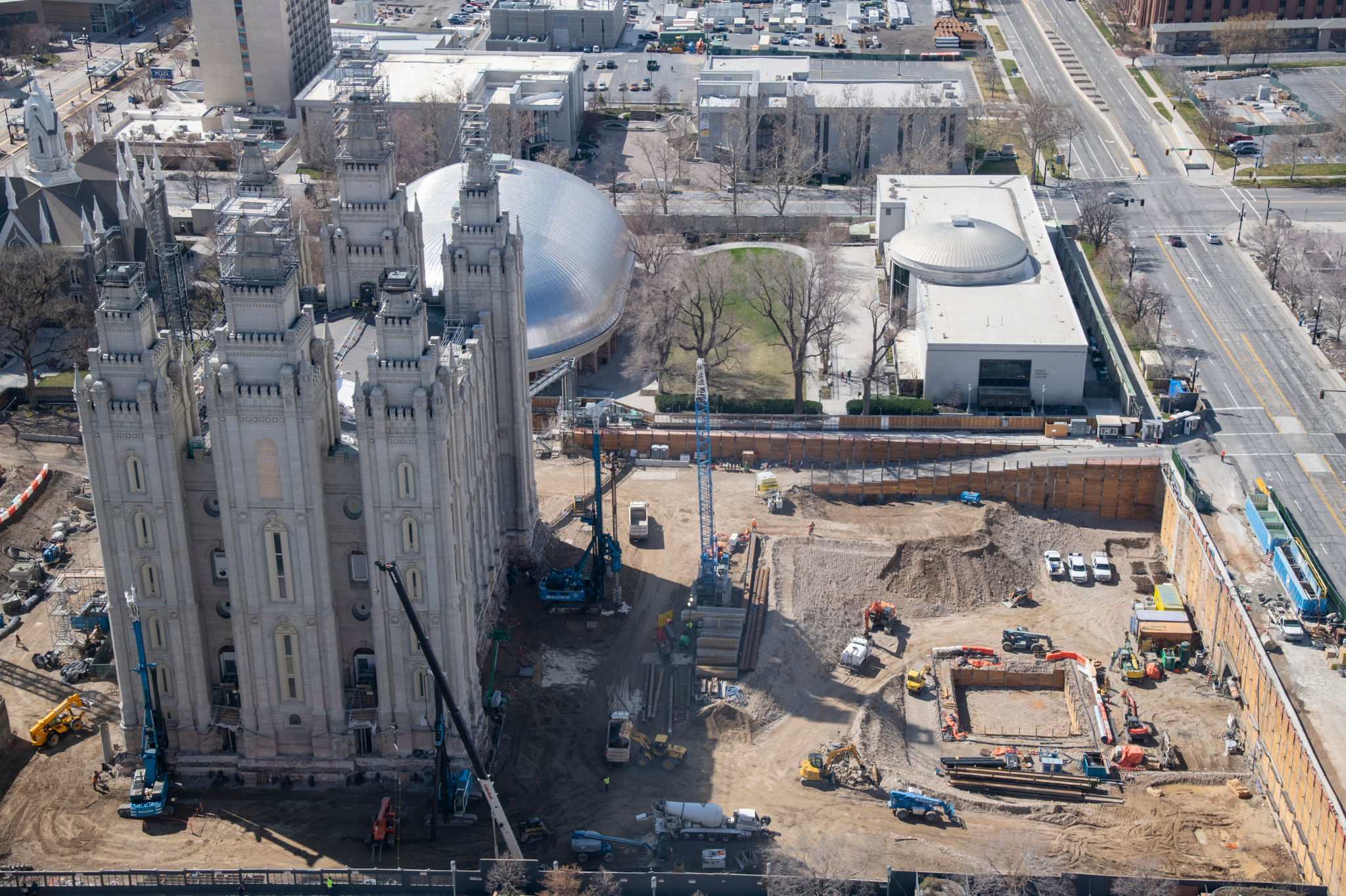 2021 by Intellectual Reserve, Inc. All rights reserved.Aerial view of Salt Lake Temple Renovation, with focus on the area north of the temple. The square-shaped excavation on the right side of the picture is where the foundation for another tower crane will be placed.