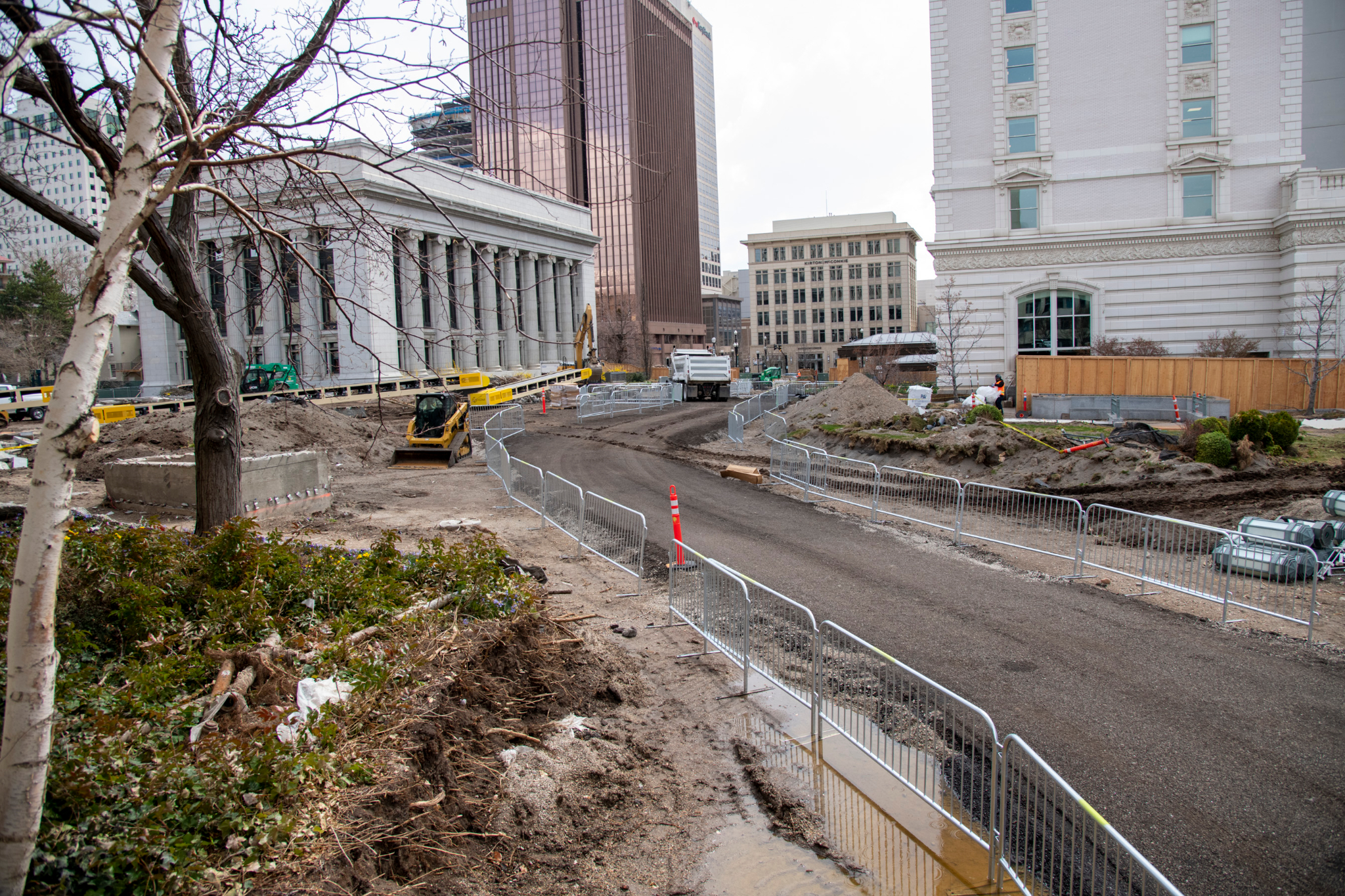 2021 by Intellectual Reserve, Inc. All rights reserved.A construction road made of recycled asphalt has been completed through the Church Office Building Plaza area from North Temple to South Temple to accommodate the movement of construction equipment and large trucks.