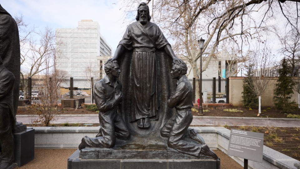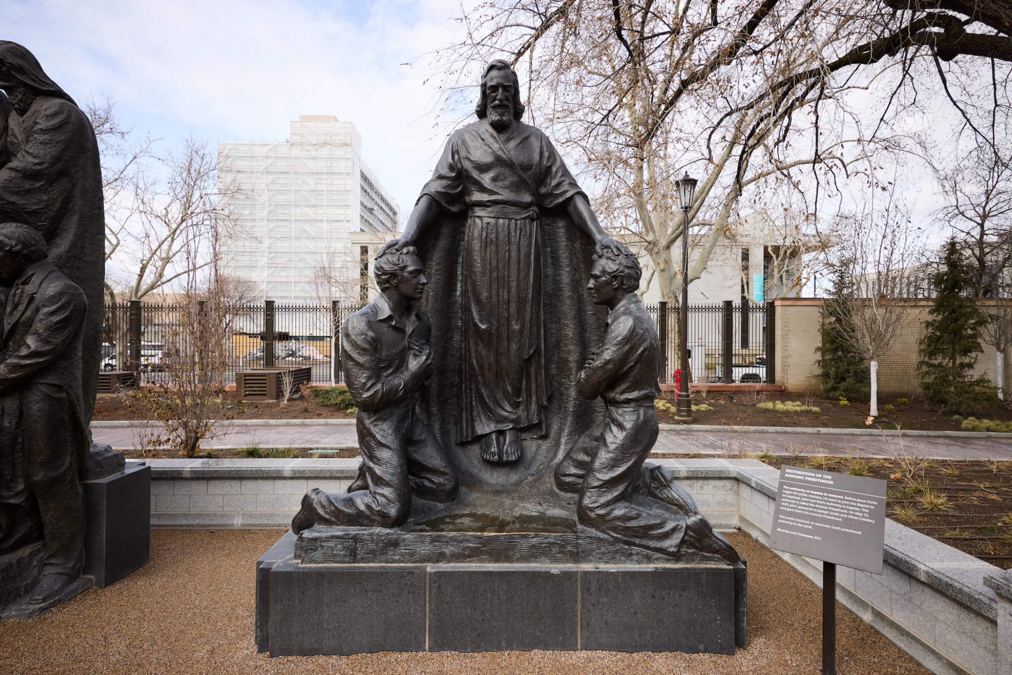 The “Restoration of the Sealing Keys” statue is installed on the northwest quadrant of Temple Square in Salt Lake City, Utah, on Thursday, January 15, 2026.2026 by Intellectual Reserve, Inc. All rights reserved.Download Photo