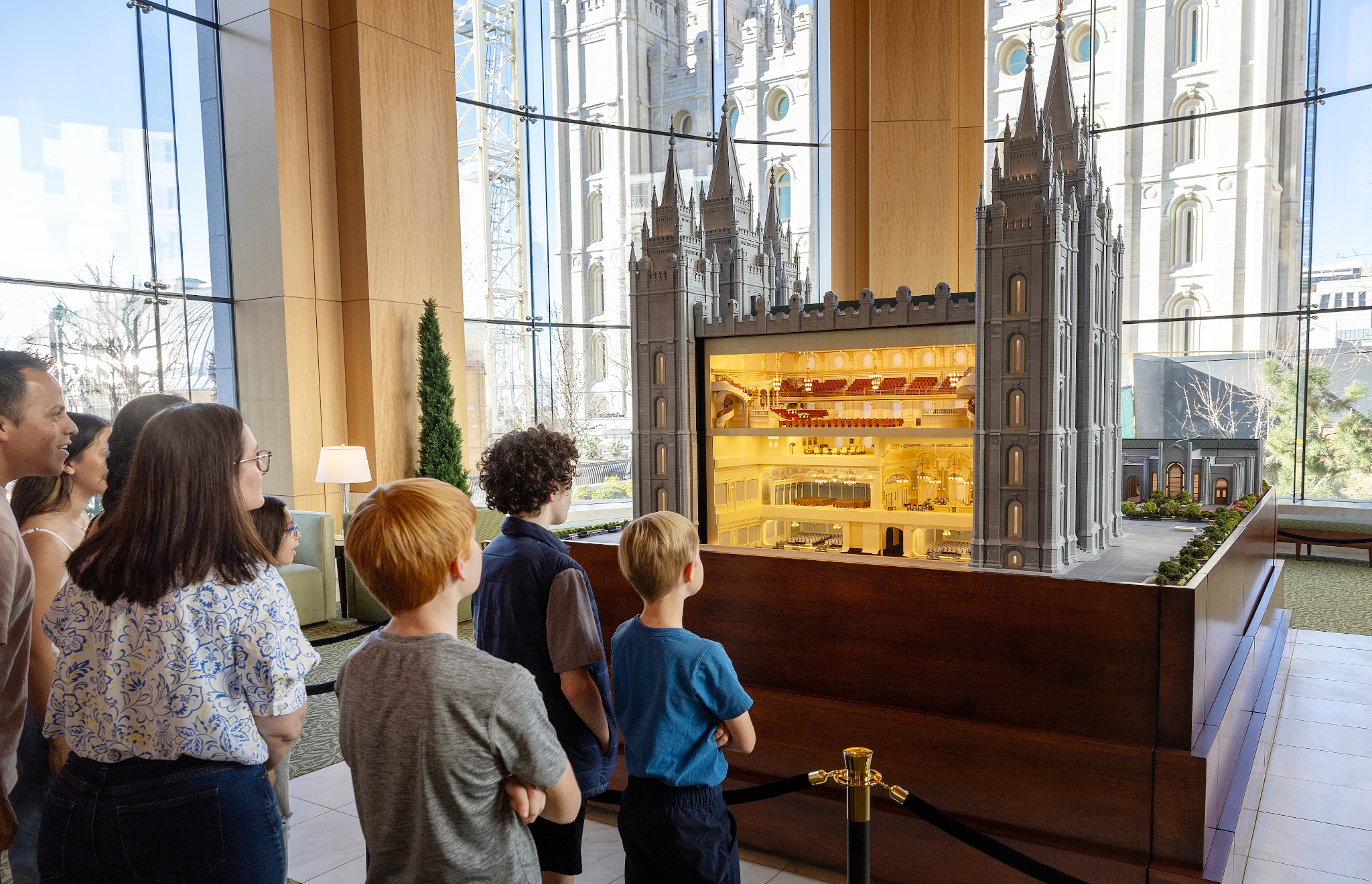 A scaled cutaway model of the Salt Lake Temple is on display with a brief presentation.