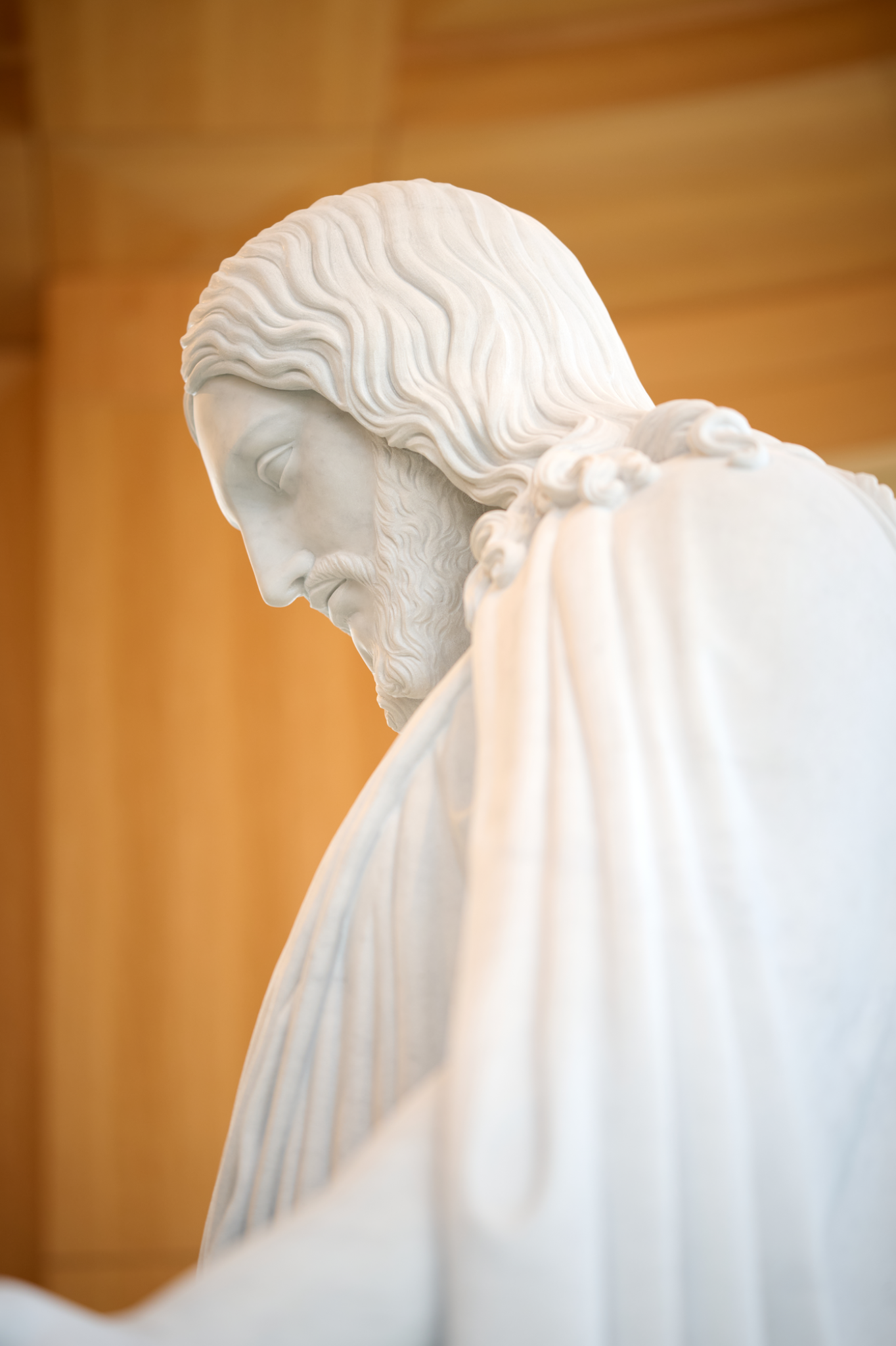 The west wing is home to a newly commissioned replica of Bertel Thorvaldsen’s “Christus.” The 11-foot marble statue depicts the resurrected Jesus Christ with outstretched arms.