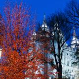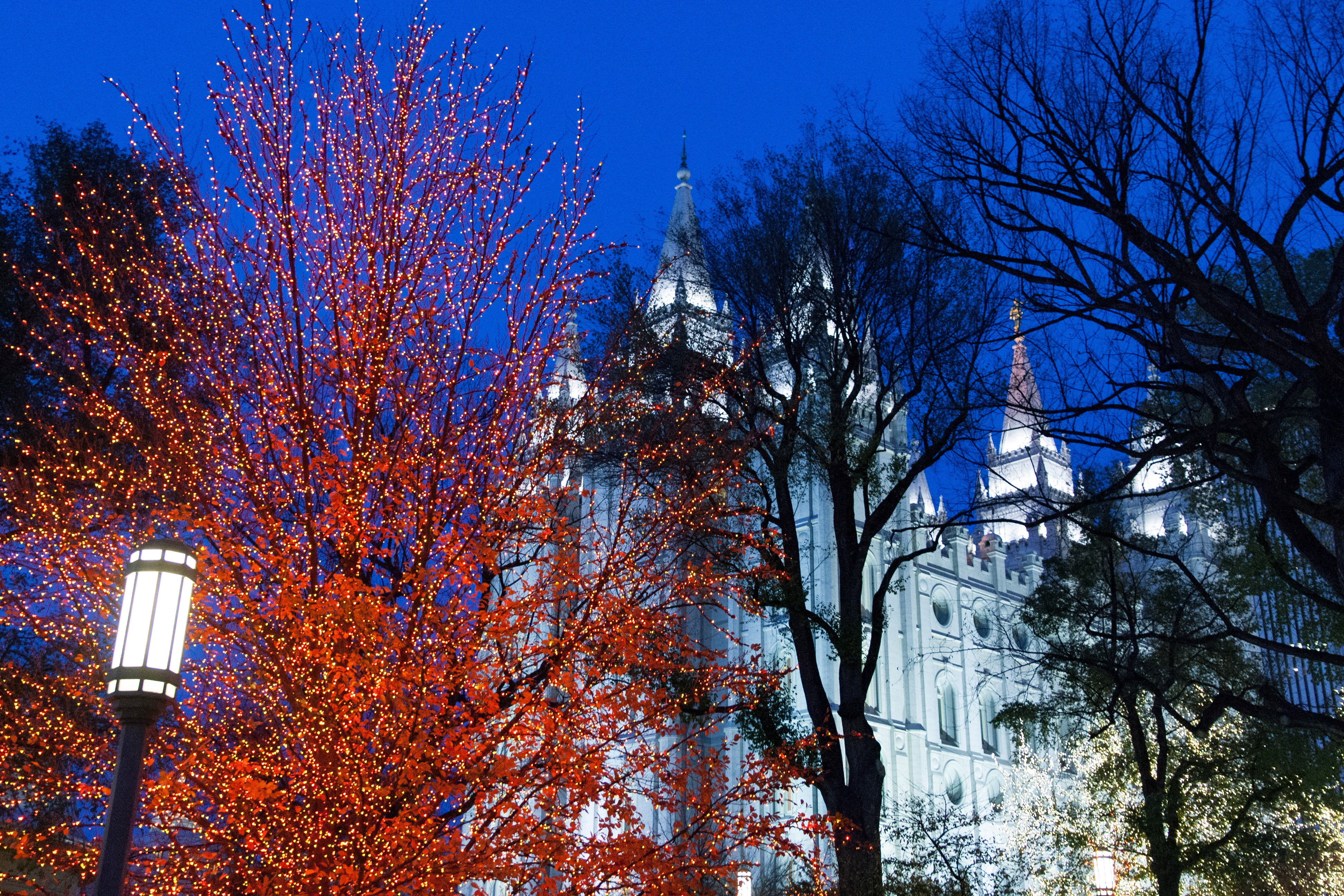 It takes grounds crews months to decorate Temple Square for Christmastime. They start wrapping the trees with strands of colored lights in August when there’s still foliage on the branches.