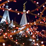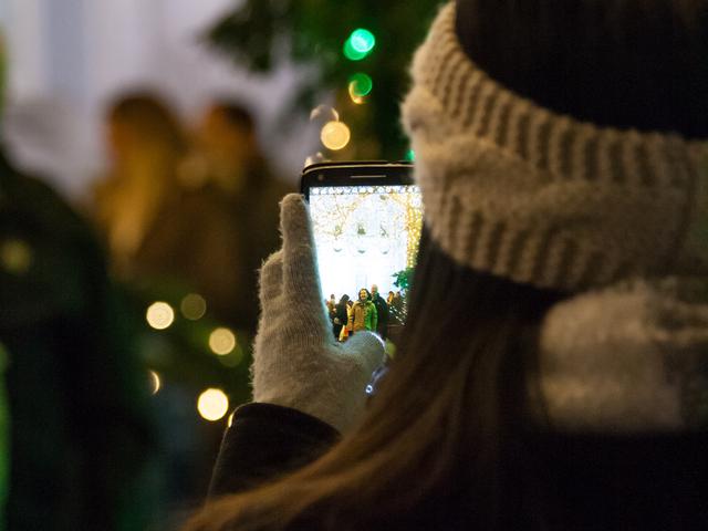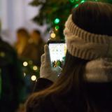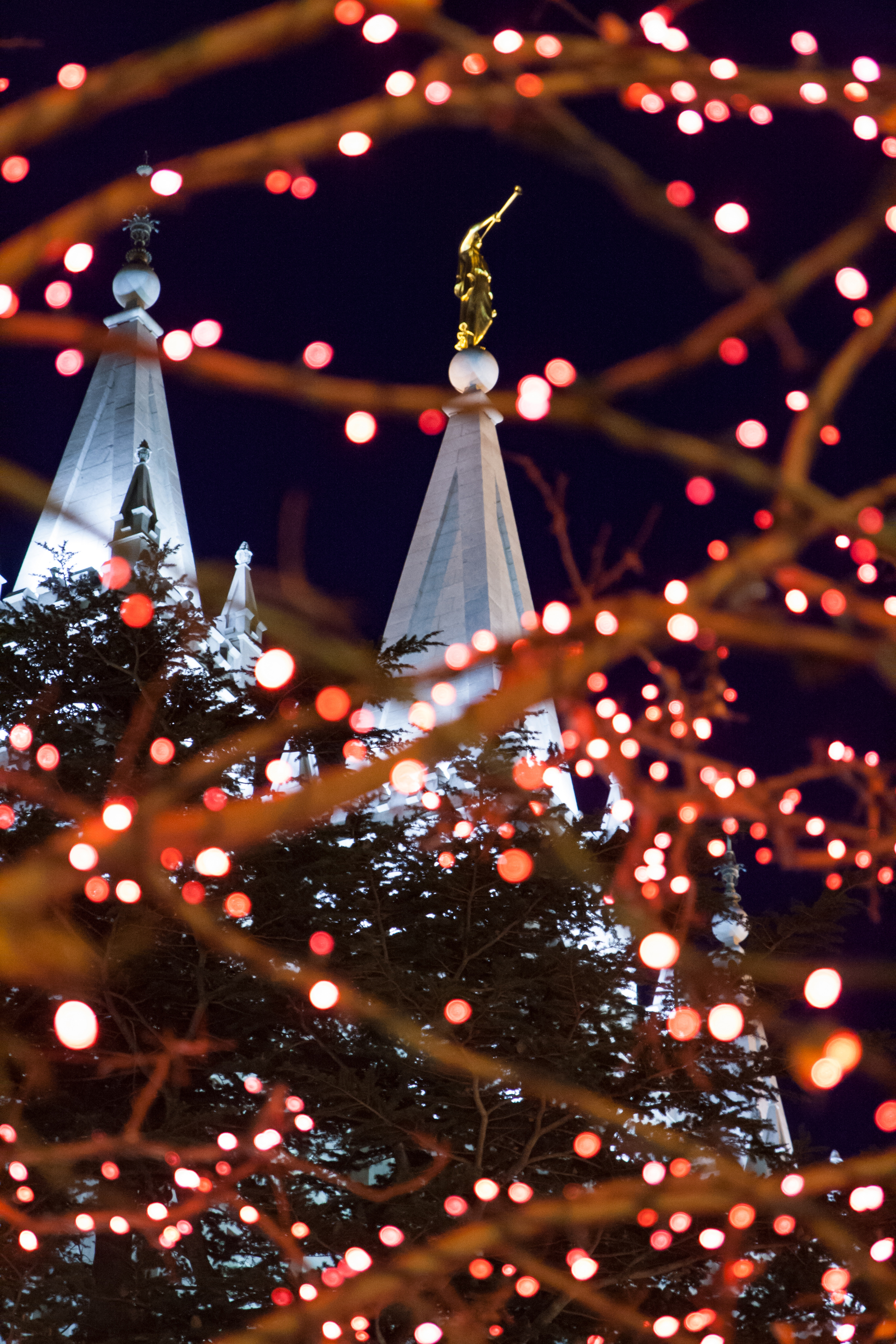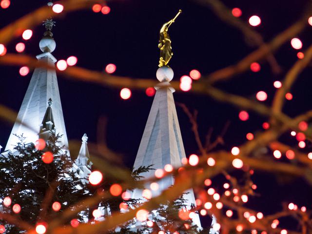 A Church-service missionary aims the camera lens toward the angel Moroni on the top of the Salt Lake Temple, framing it in Christmas lights.