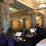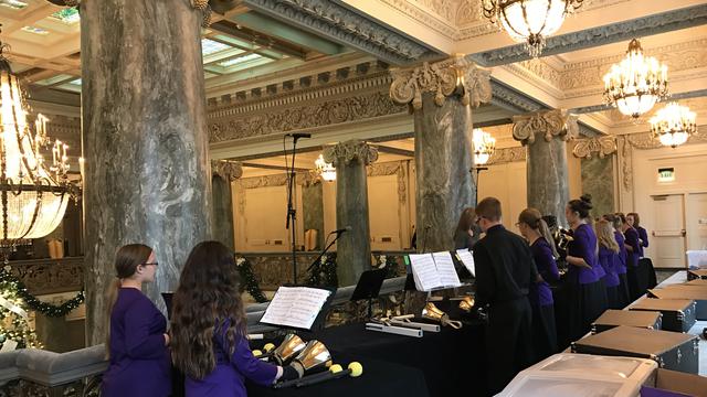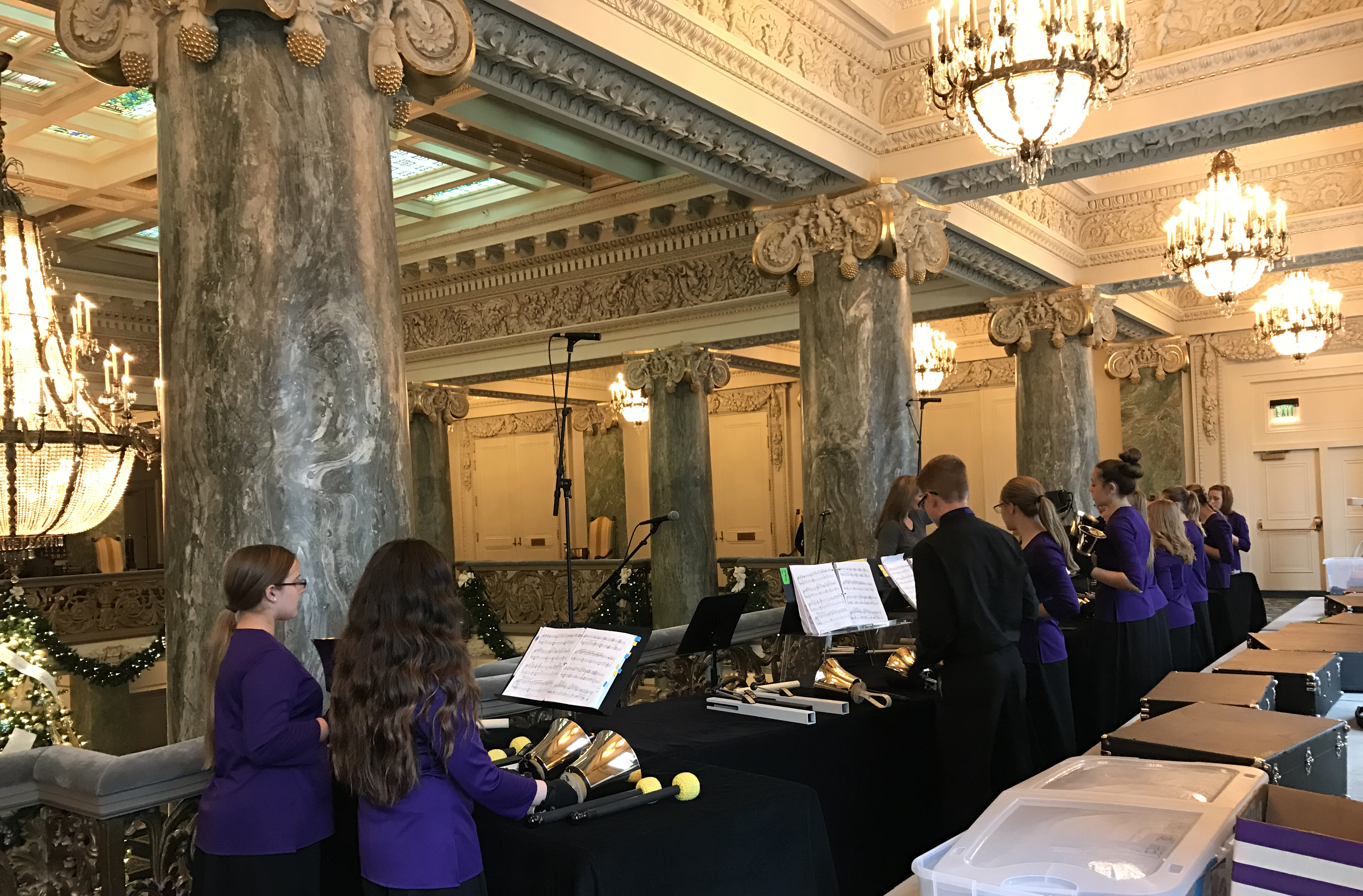 The Lehi Junior High School Handbell Choir performs in the Joseph Smith Memorial Building. Guests can see free Christmas musical performances from Utah schools and other performing groups throughout the day and evening in various locations, including the Assembly Hall, Church Office Building and Joseph Smith Memorial Building.