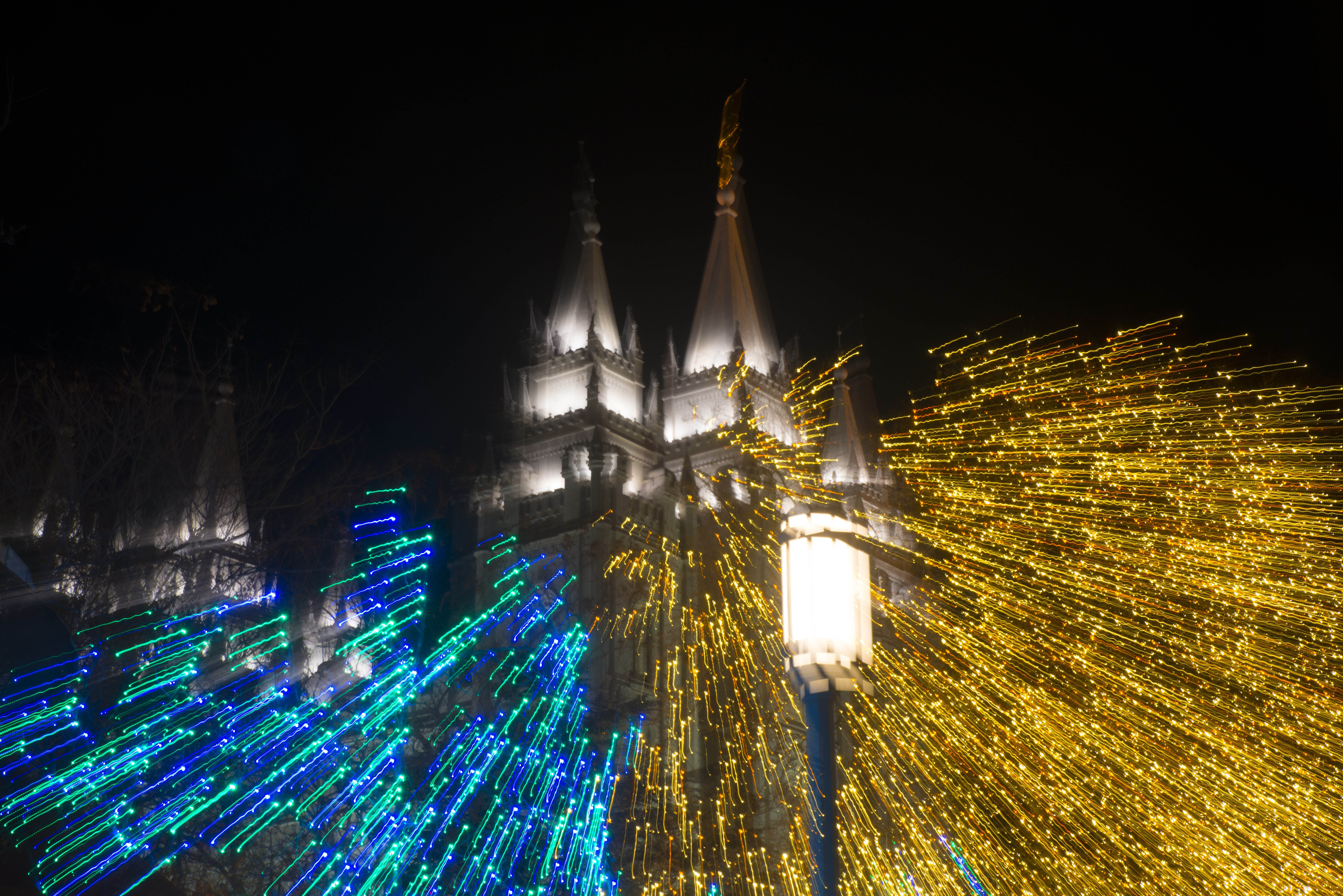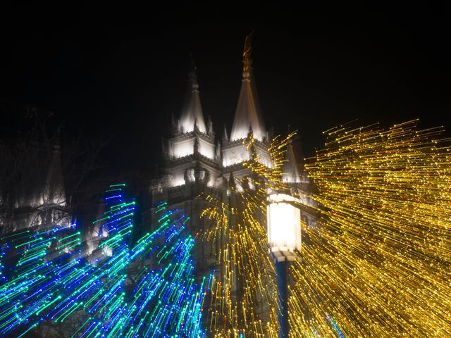 Bursts of blue, green and gold lights highlight the Salt Lake Temple.