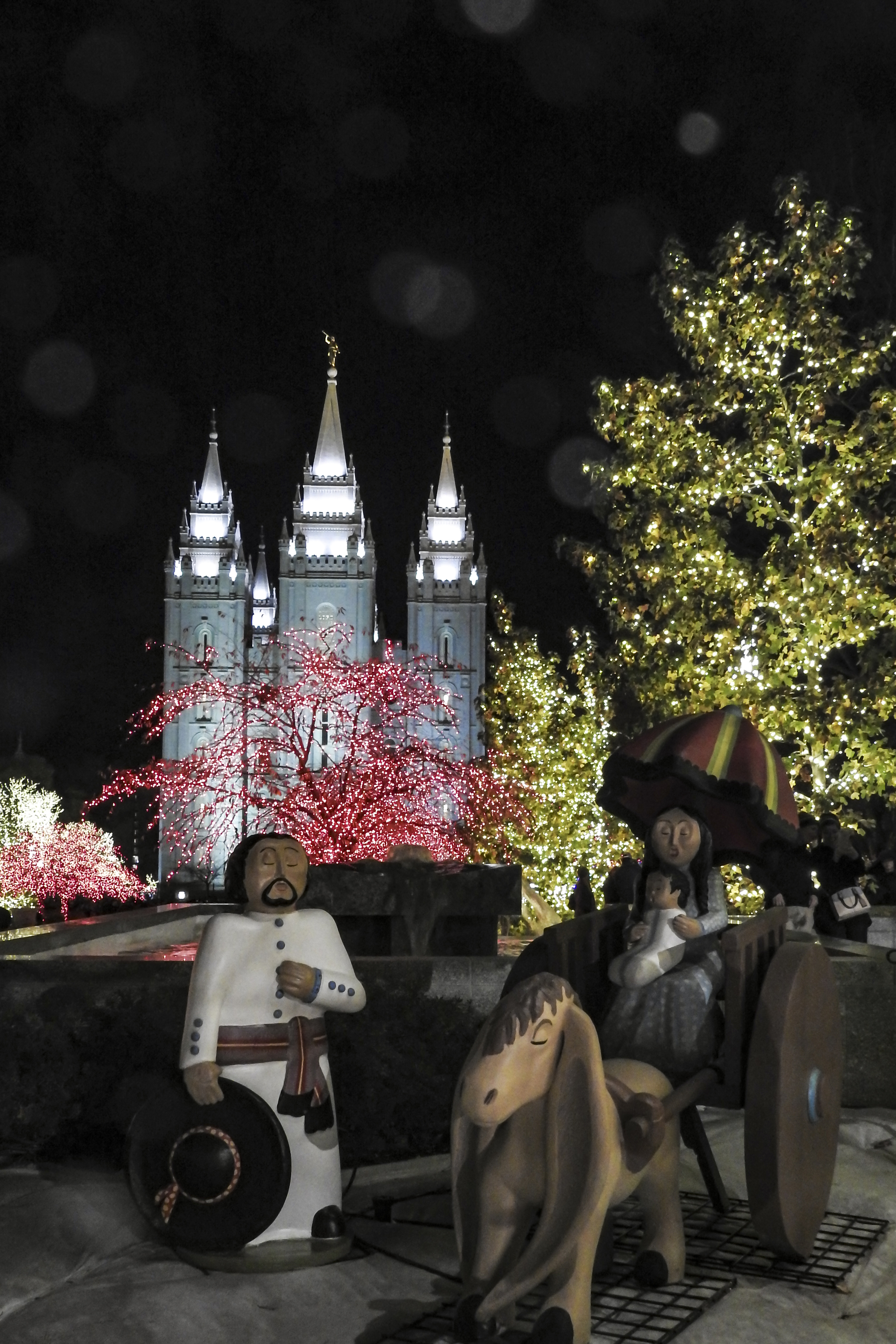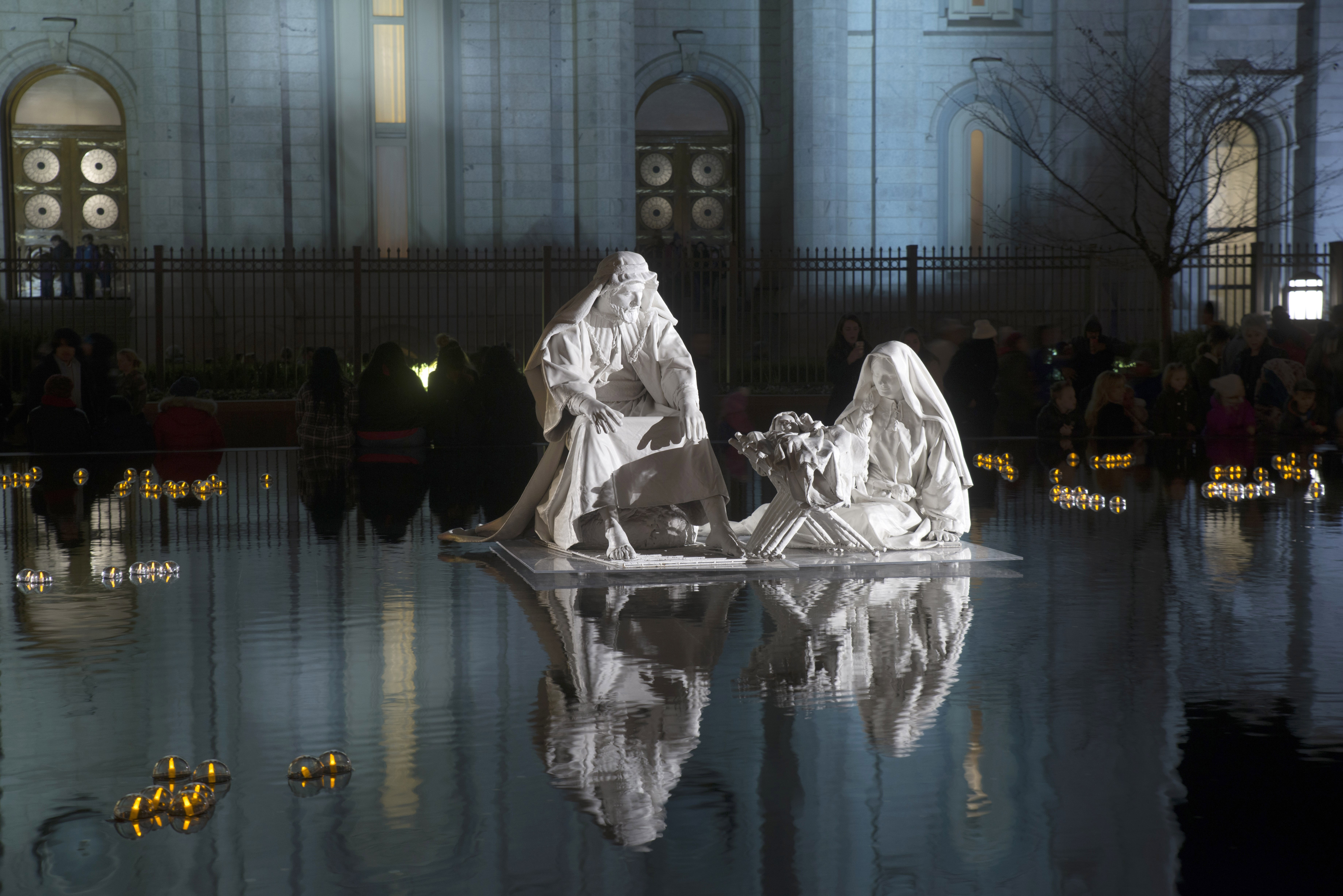 A floating nativity is placed in the reflecting pond just east of the Salt Lake Temple during the holidays.