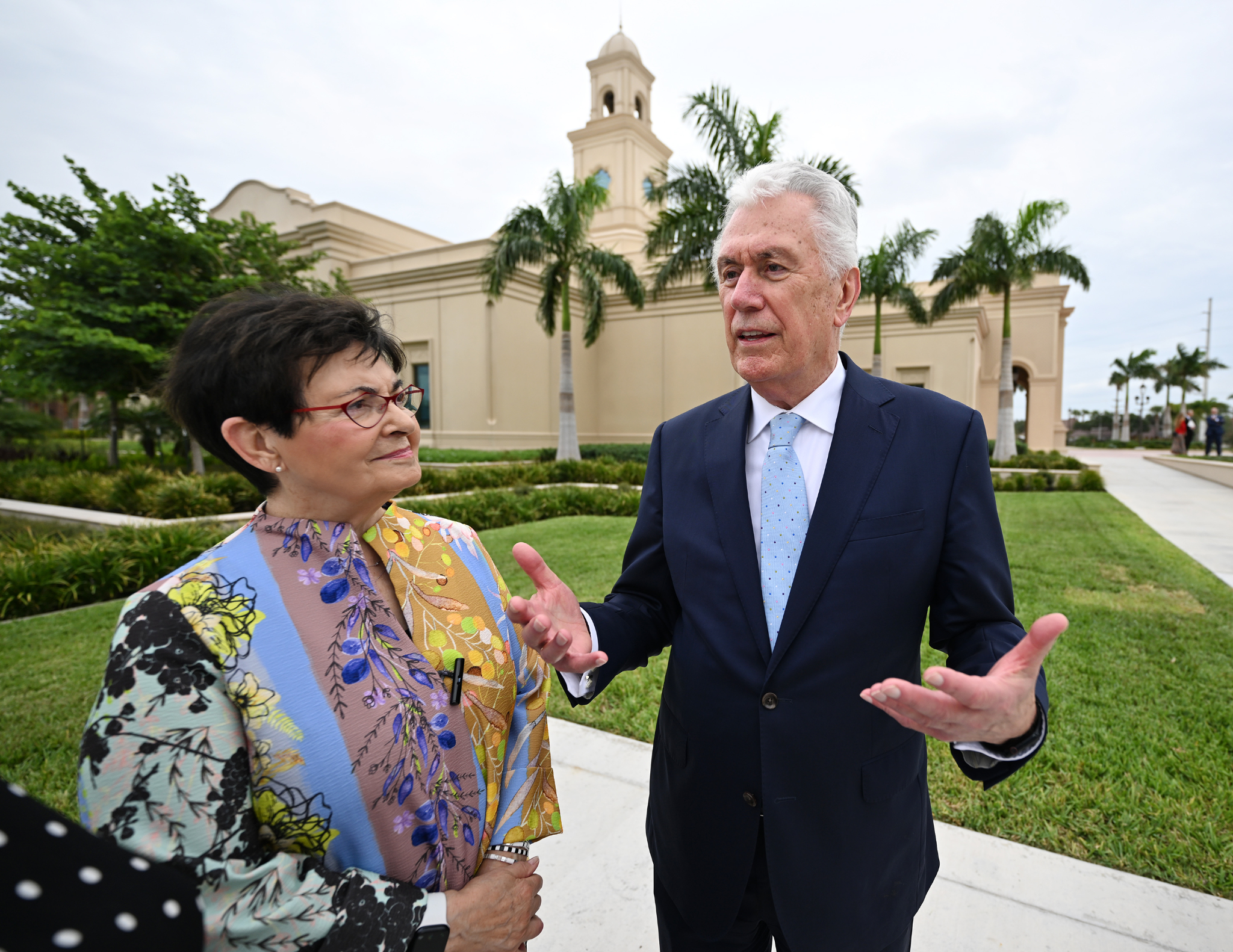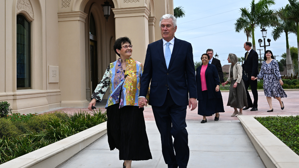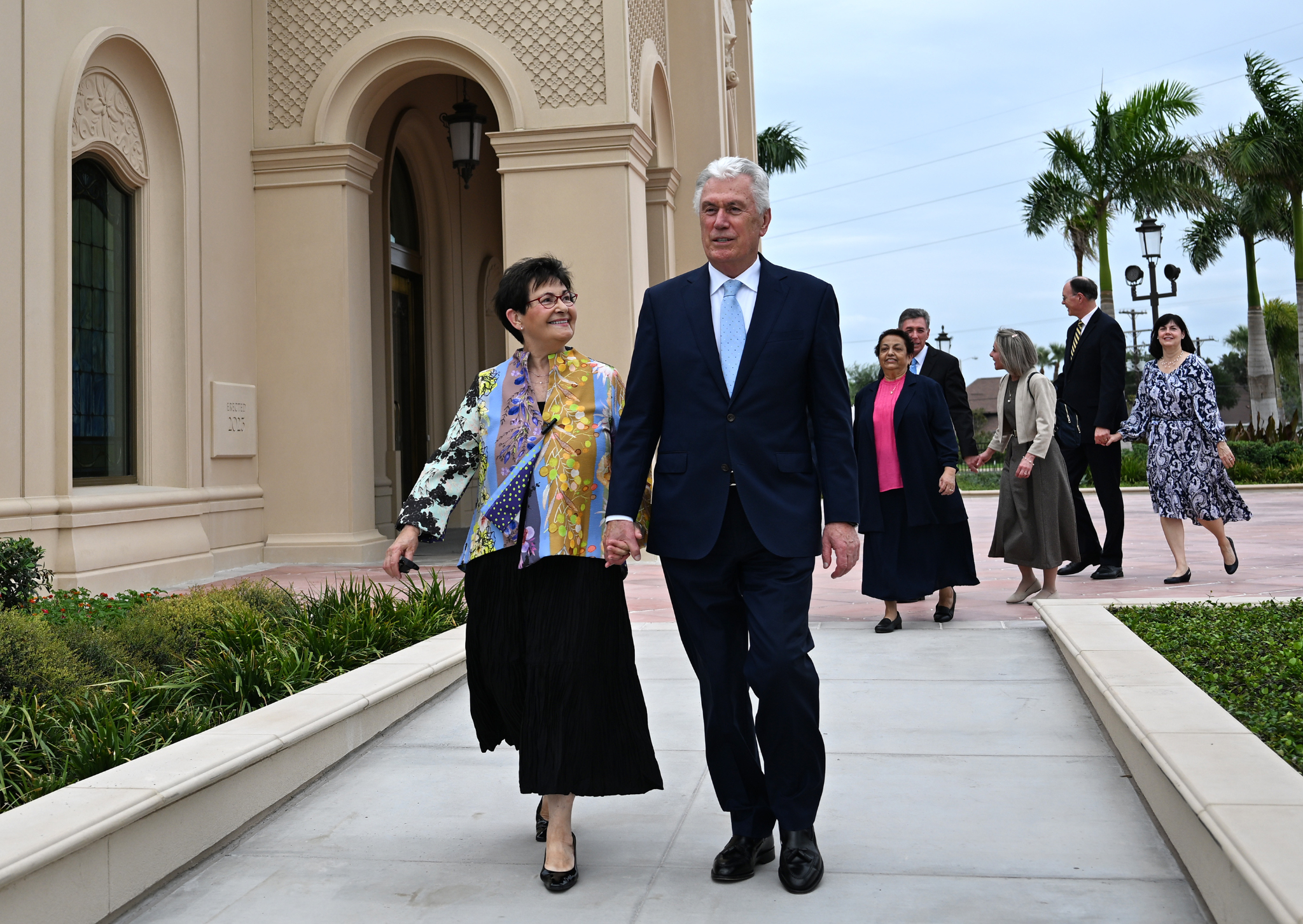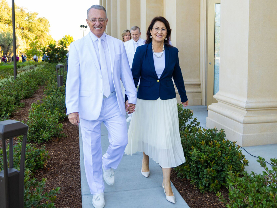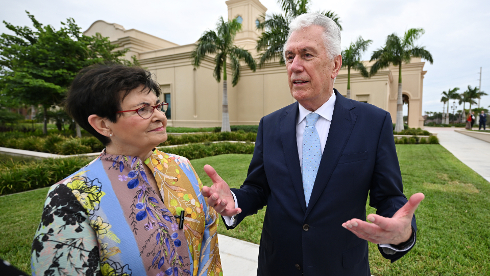 Elder Dieter F. Uchtdorf of the Quorum of the Twelve Apostles of The Church of Jesus Christ of Latter-day Saints and his wife, Sister Harriet Uchtdorf, pose for photos at the McAllen Texas Temple on Saturday, October 7, 2023.“The spreading of the restored gospel did not stop at political or social boundaries; it expanded on both sides of the Rio Grande,” he said.