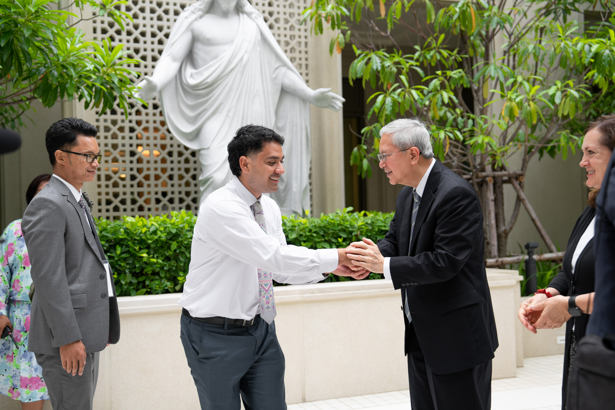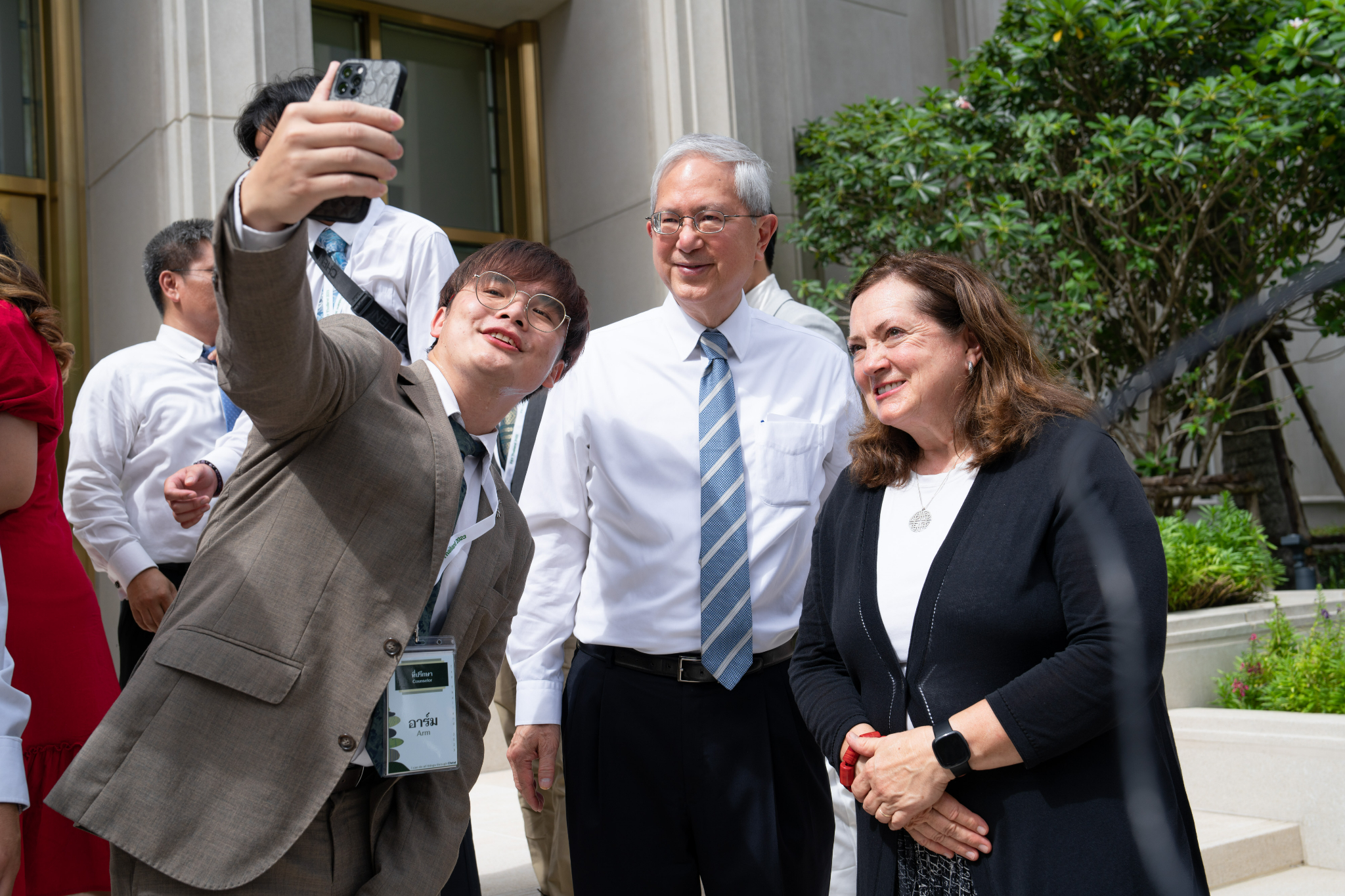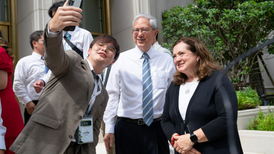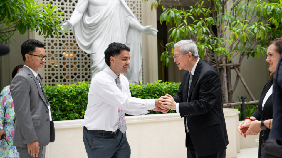 A young man takes a selfie with Elder Gerrit W. Gong and and his wife, Susan, follow a tour of the Bangkok Thailand Temple, August 26, 2023.2023 by Intellectual Reserve, Inc. All rights reserved.After walking through the temple, Pariwat Sengpoung of Rangsit, Thailand, said, “I feel closer with God, and Jesus really [is] closer.”