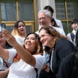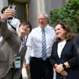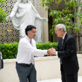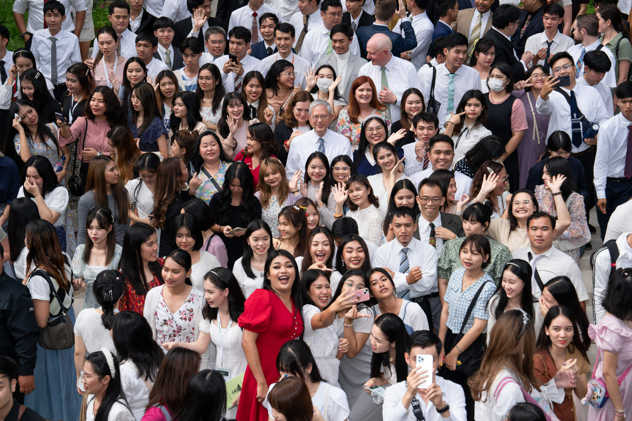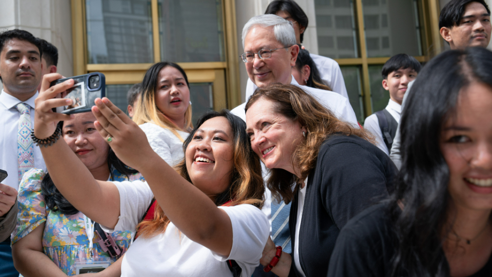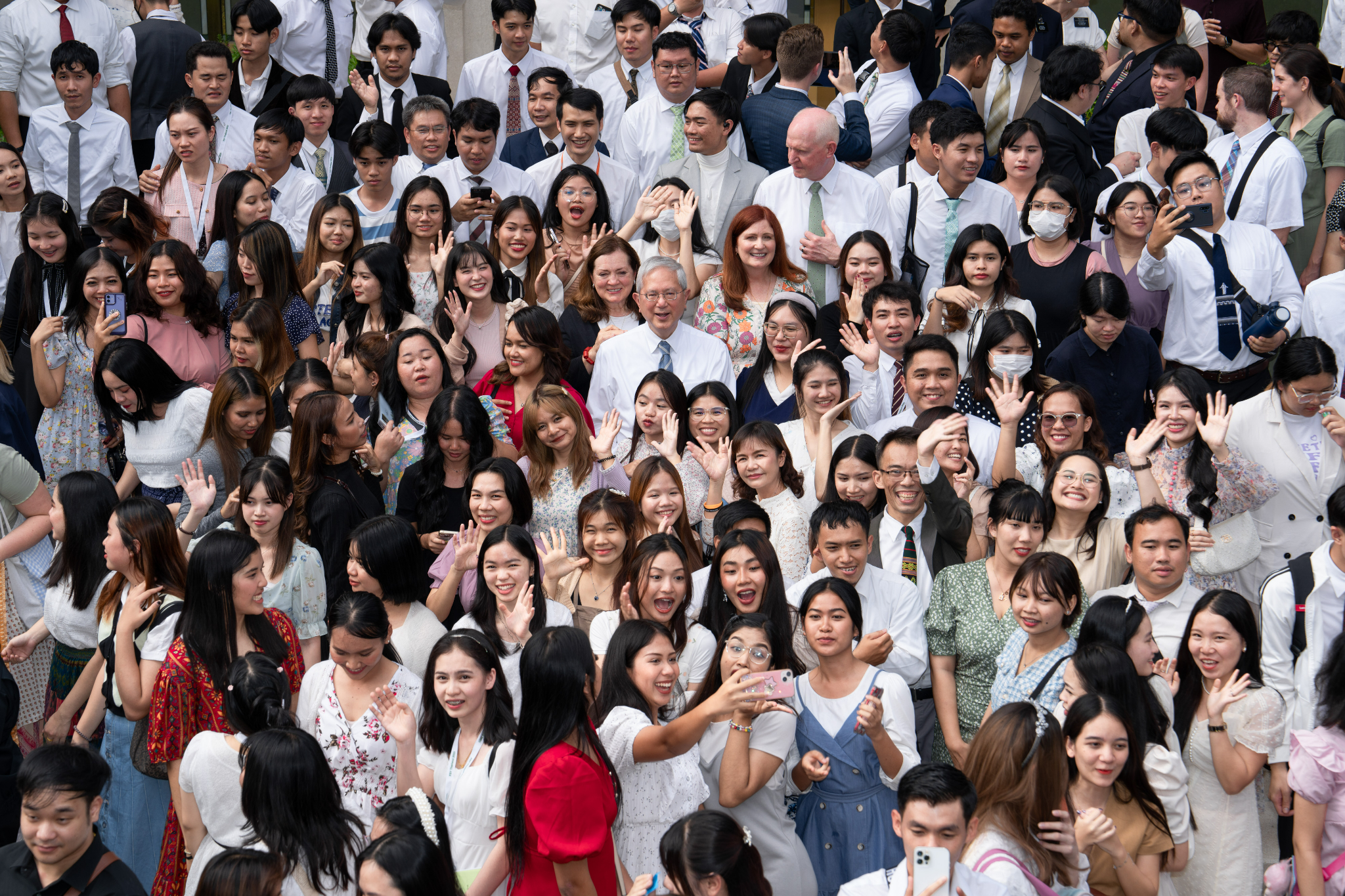 A young man takes a selfie with Elder Gerrit W. Gong and and his wife, Susan, follow a tour of the Bangkok Thailand Temple, August 26, 2023.2023 by Intellectual Reserve, Inc. All rights reserved.After walking through the temple, Pariwat Sengpoung of Rangsit, Thailand, said, “I feel closer with God, and Jesus really [is] closer.”