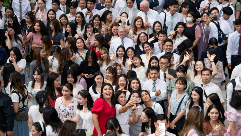 Young single adults (YSAs) from across Thailand attend a devotional with Elder Gerrit W. Gong of the Quorum of the Twelve Apostles, and his wife, Susan on August 26, 2023. They then took a tour of the Bangkok Thailand Temple.2023 by Intellectual Reserve, Inc. All rights reserved.The Apostle said peace, purity and purpose are three words that describe what the temple means to him.
