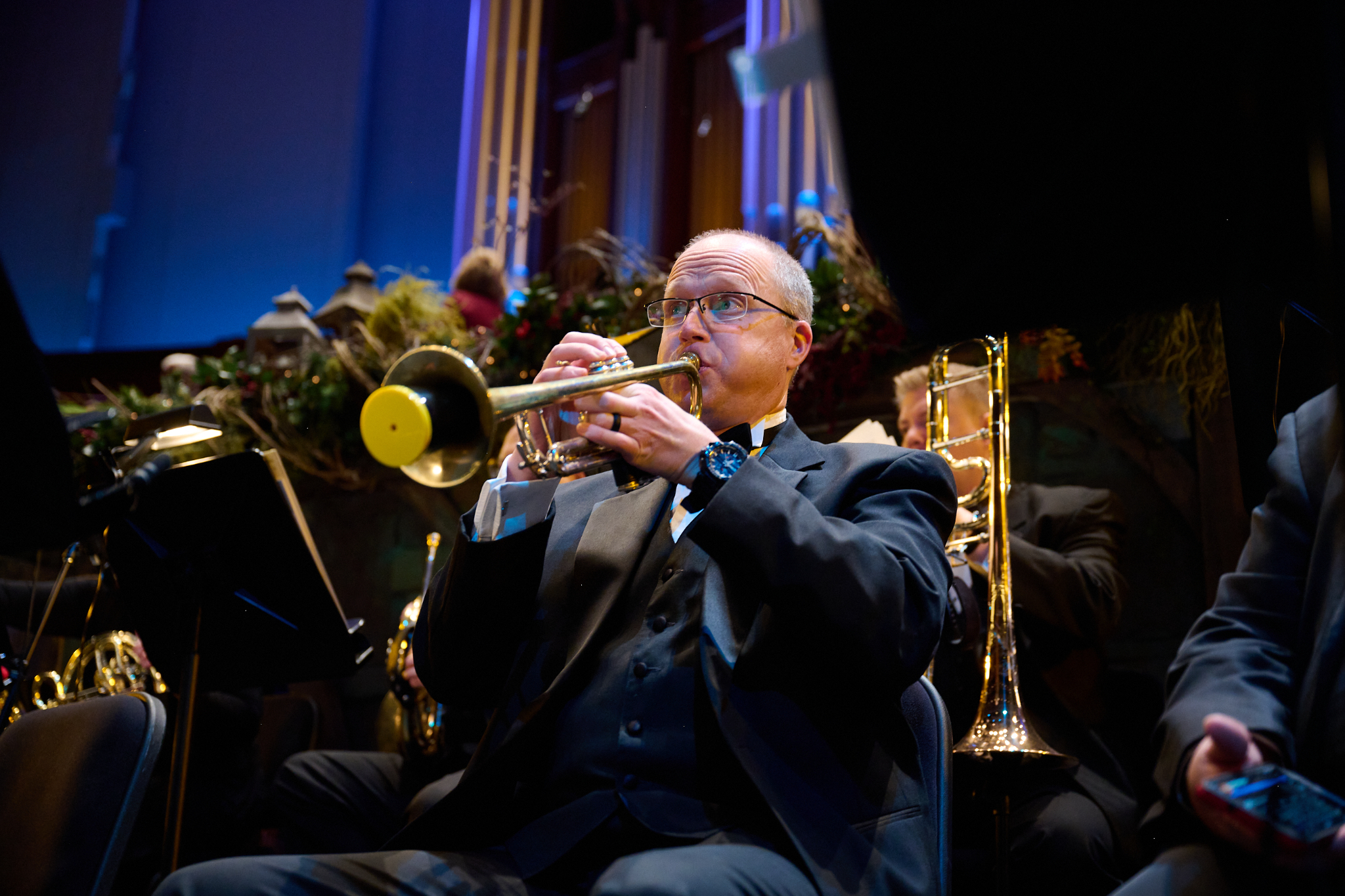 The stage is decorated in a Christmas motif with jewel tones of blue, purple and green.
