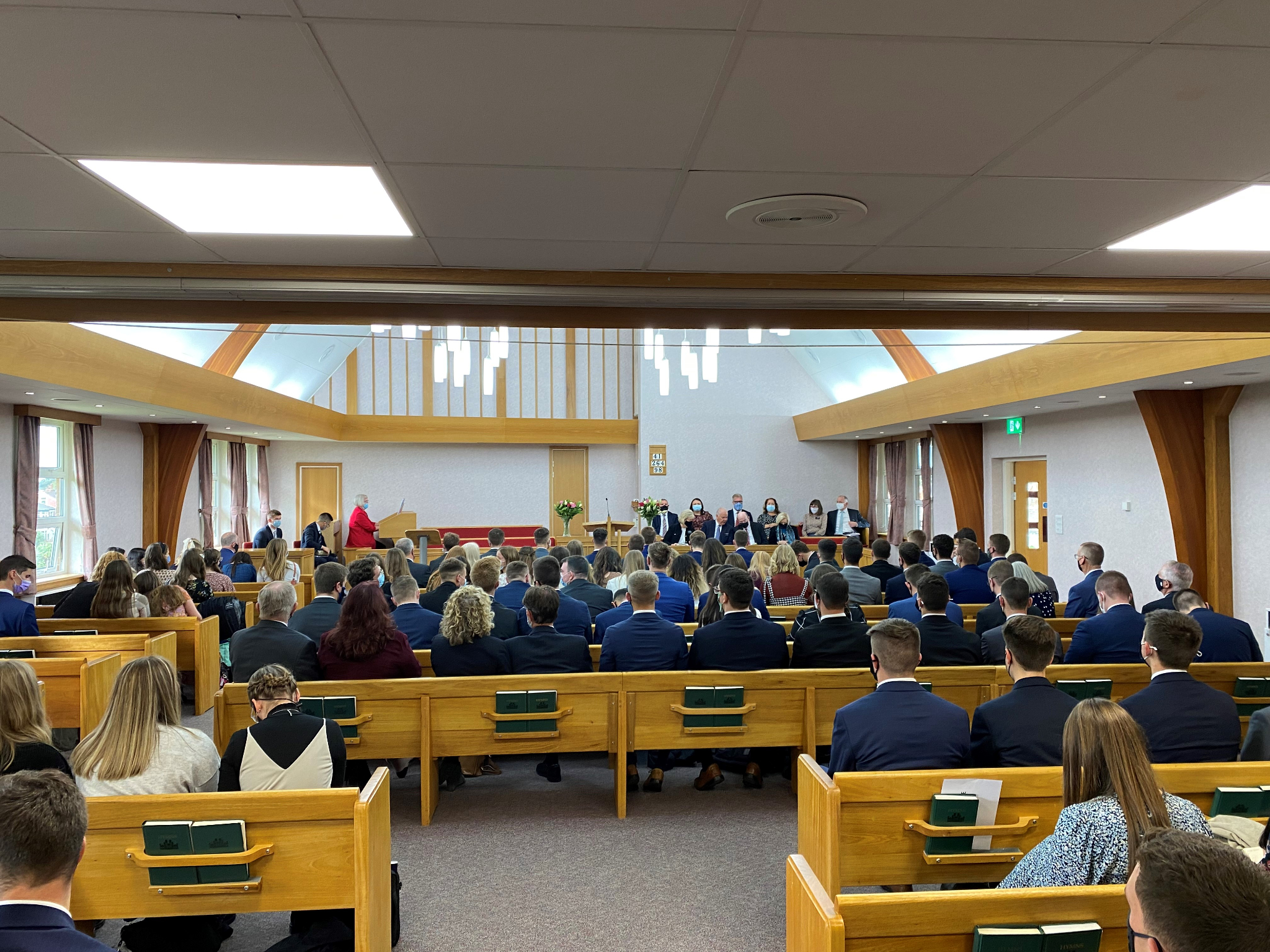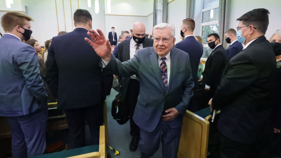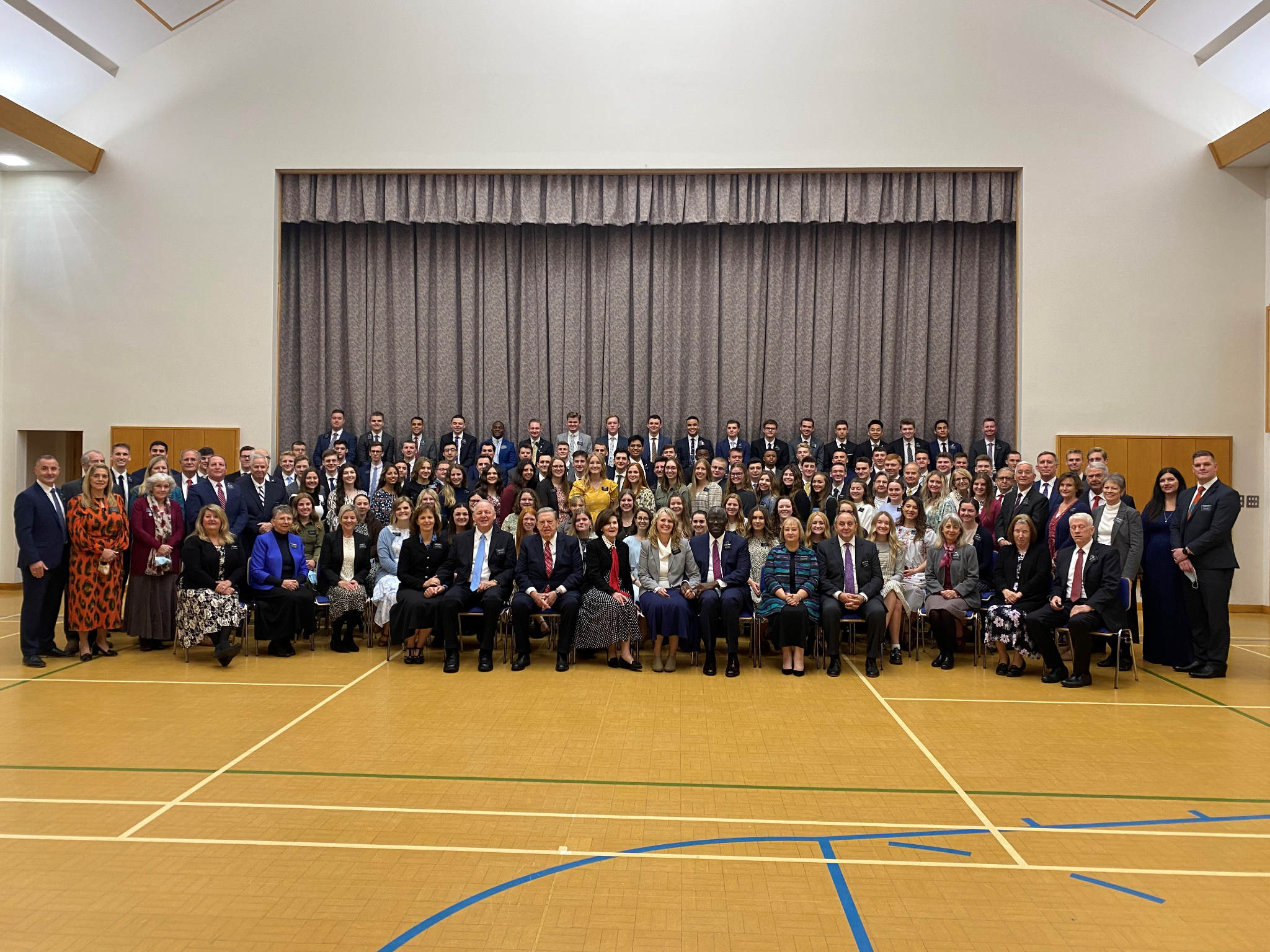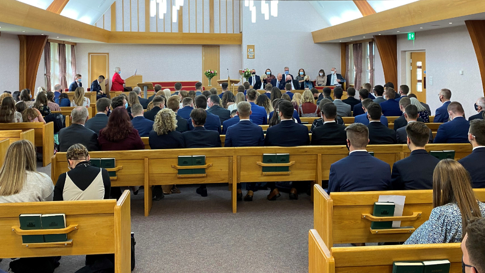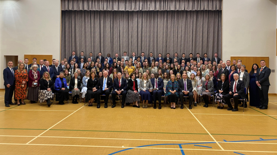 Elder Jeffrey R. Holland and his wife, Pat, speak to missionaries from the England Manchester Mission in the Chorley Stake Center on Tuesday, October 26, 2021.Elder and Sister Cook traveled to Leeds, meeting Tuesday afternoon with missionaries of the England Leeds Mission. He shared his experience of being with President Ballard on Monday at the docks in Liverpool, where many early Latter-day Saints set sail for America.