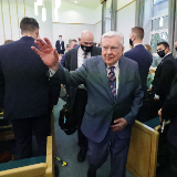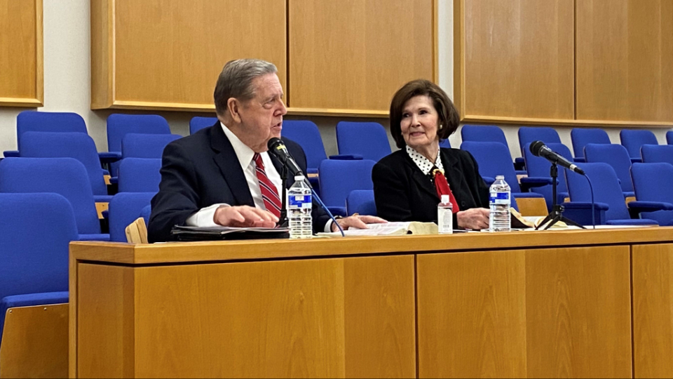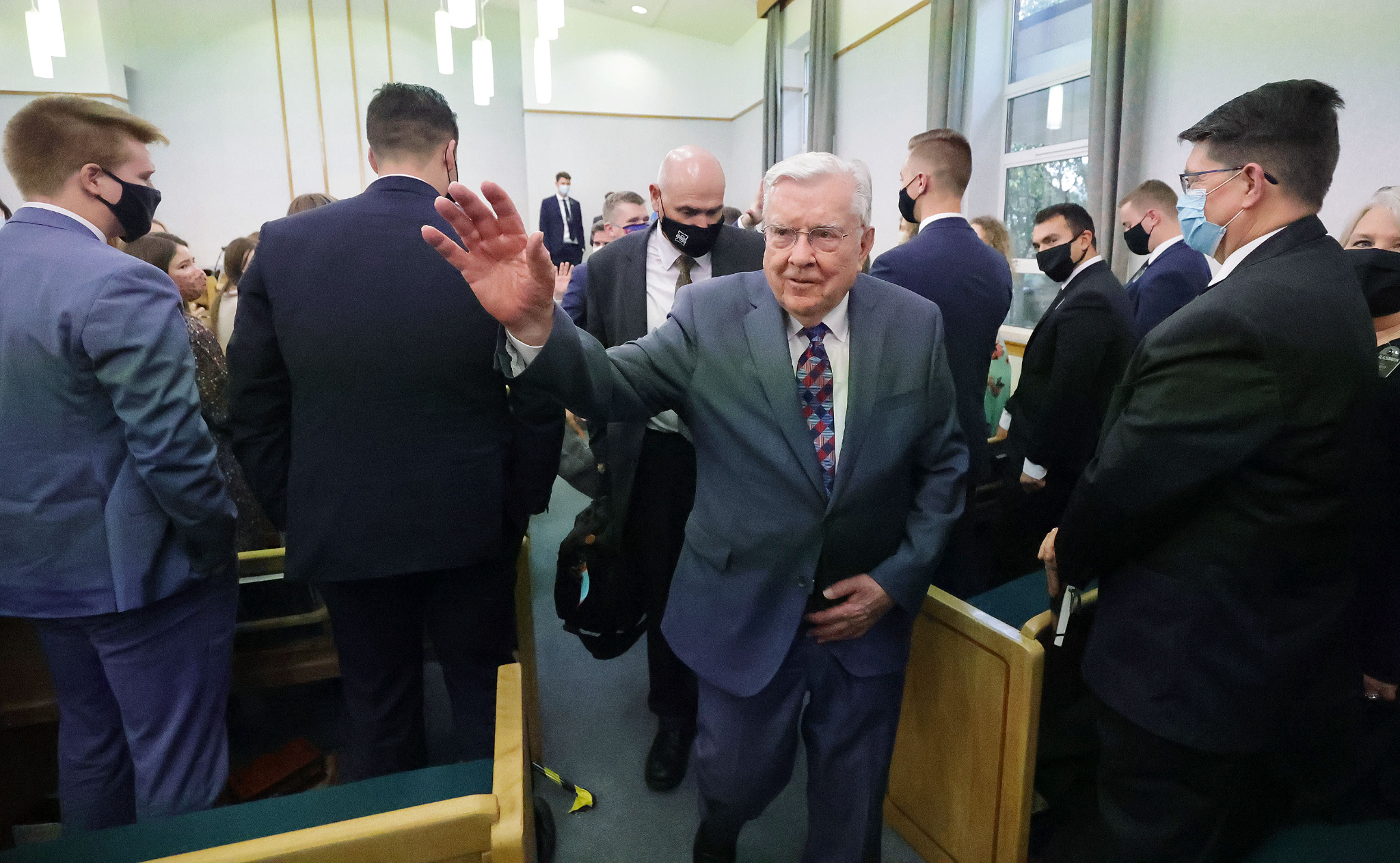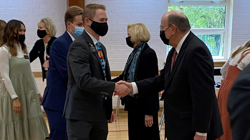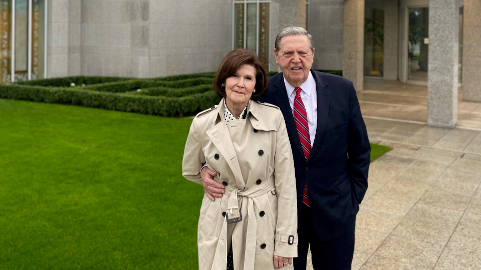 Elder Jeffrey R. Holland and his wife, Pat, speak to missionaries from the England Manchester Mission in the Chorley Stake Center on Tuesday, October 26, 2021.Elder and Sister Cook traveled to Leeds, meeting Tuesday afternoon with missionaries of the England Leeds Mission. He shared his experience of being with President Ballard on Monday at the docks in Liverpool, where many early Latter-day Saints set sail for America.