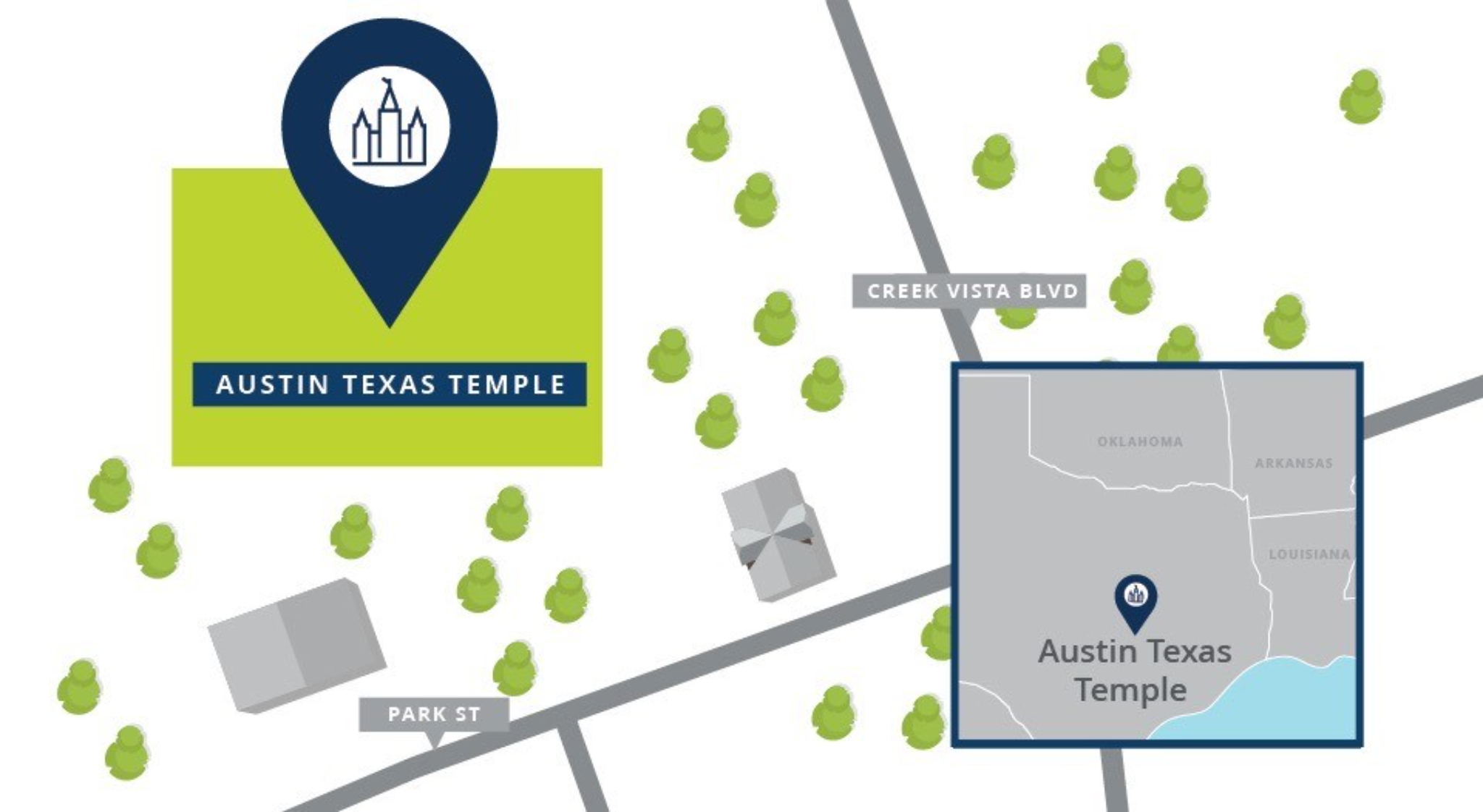 Map showing the location of the Austin Texas Temple. 2022 by Intellectual Reserve, Inc. All rights reserved.The Austin Texas Temple, which was announced in April 2022 by President Nelson, will be built on a 10.6-acre site adjacent to an existing meetinghouse located at 1801 E. Park Street, Cedar Park, Texas. Plans call for a single-story temple of approximately 30,000 square feet.