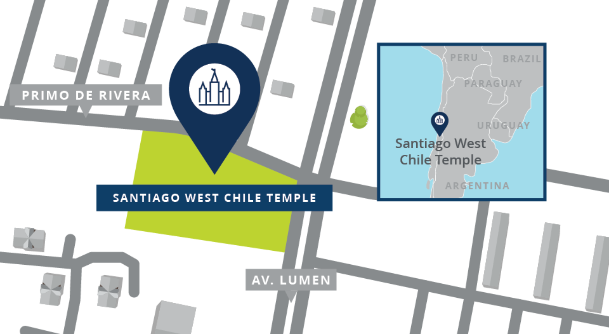 Map showing the location of the Santiago Chile West Temple. © 2022 by Intellectual Reserve, Inc. All rights reserved.The Santiago West Chile Temple will be built at Primo de Rivera 1551, Comuna de Maipu, Santiago, Chile. Plans call for a single-story temple of approximately 12,500 square feet.