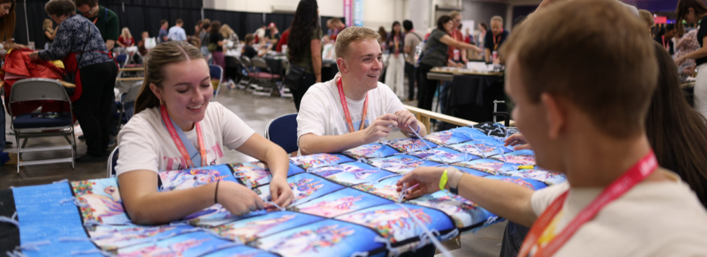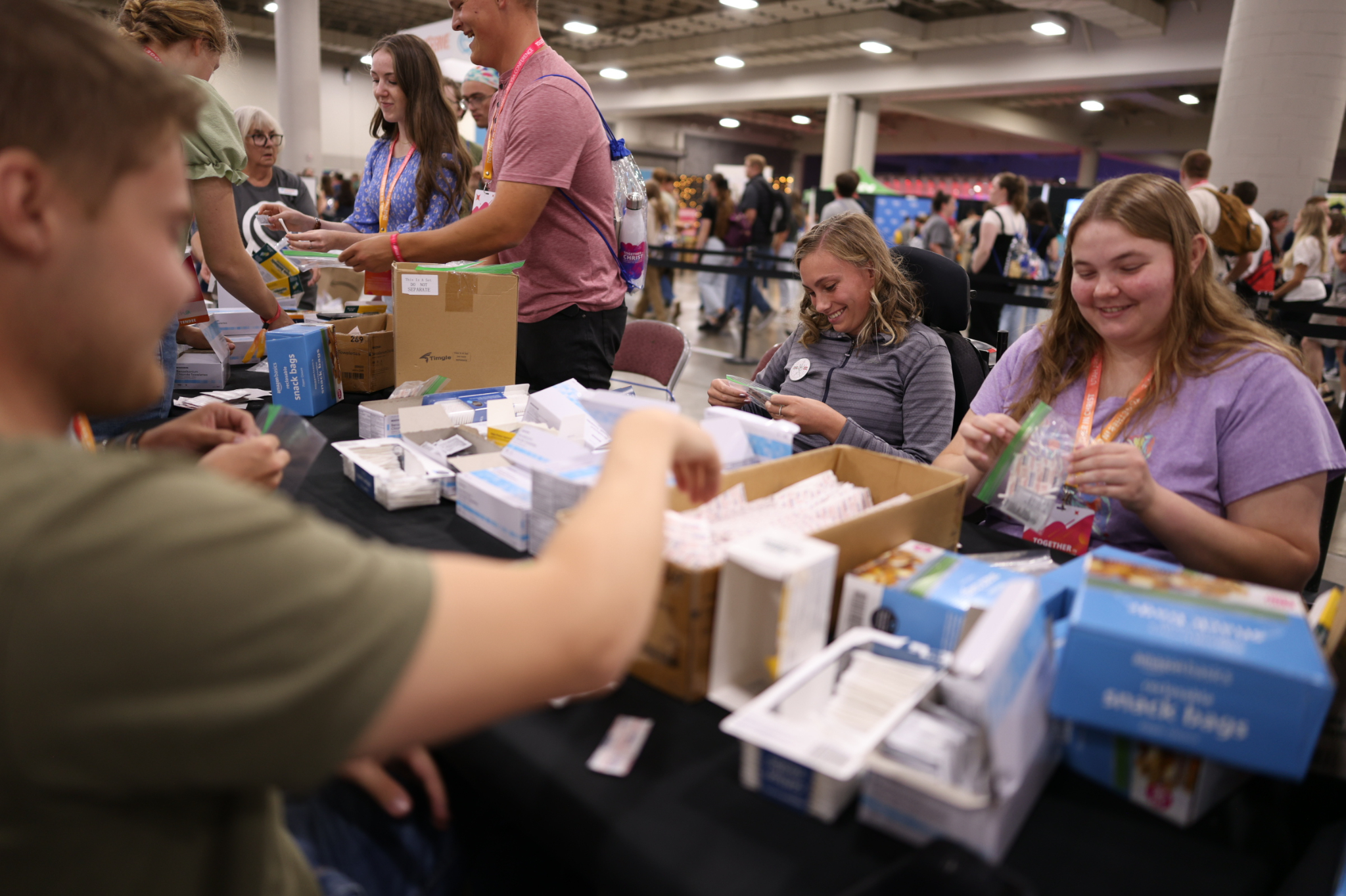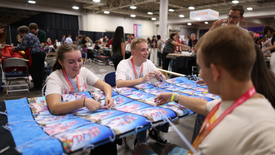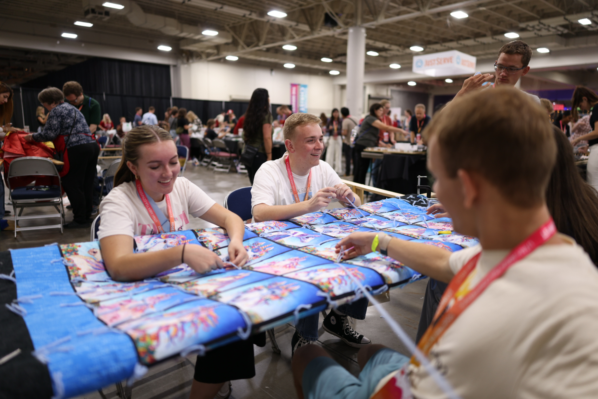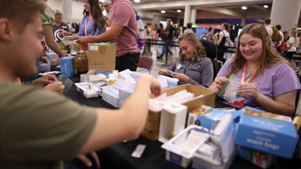 Several such opportunities were available at the Salt Palace throughout the weekend. Many assembled backpacks for children working through trauma, wrote notes to lonely seniors, created paracord lanyards for deployed soldiers, repurposed plastic bags into sleeping mats for the homeless, built birthday boxes for children in need, packed hygiene kits for the homeless, and created Disney-themed wigs for children undergoing medical treatment.