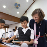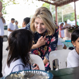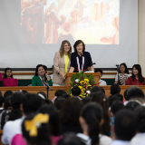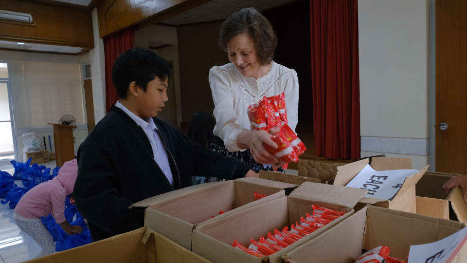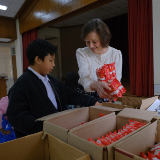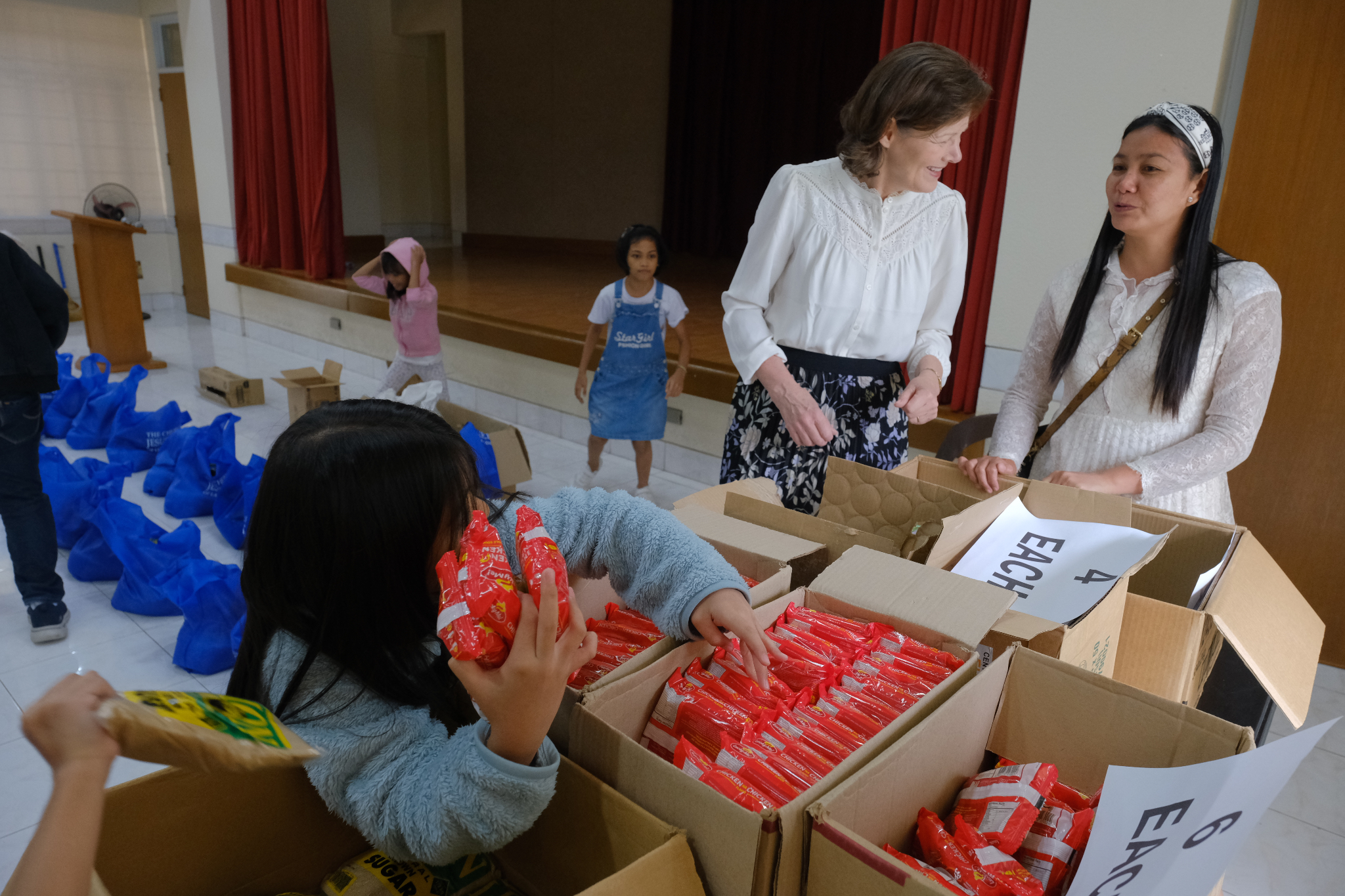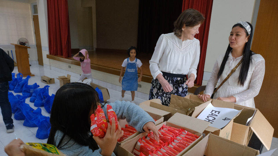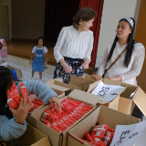 President Porter helped children assemble kits with food, clothing, bedding and hygiene items for 30 students who are unable to see or hear.