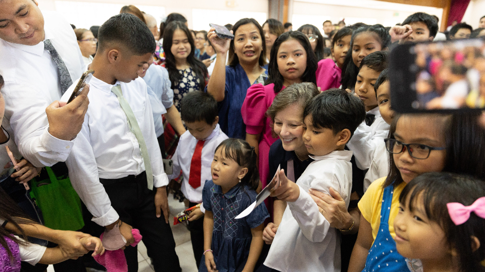 Children greet Primary General President Susan H. Porter (center) after a children’s devotional outside of Manila on Saturday, November 19, 2023.2023 by Intellectual Reserve, Inc. All rights reserved.“One of the sweetest opportunities for me was a chance to express love,” said President Johnson. “They are a beautiful example of optimism. Optimism that we find in our Savior Jesus Christ, hope in our Savior Jesus Christ, peace in our Savior Jesus Christ, even in the midst of the temporal challenges that all of us face.