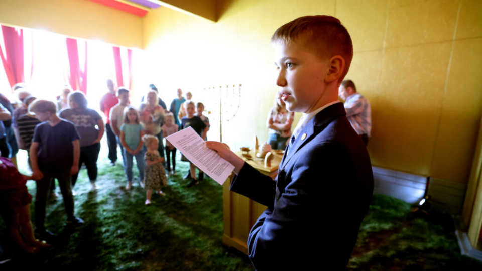 Ethan Shepherd, 19, of Roy Utah North Stake talks with visitors at the altar of the ancient tabernacle replica on display in Syracuse, Utah, on Saturday, May 7, 2022. Photo by Scott G Winterton, courtesy of Church News.Copyright 2022 Deseret News Publishing Company.He told the Church News, “It’s been cool to learn more about it with the training and it’s been a good experience.”