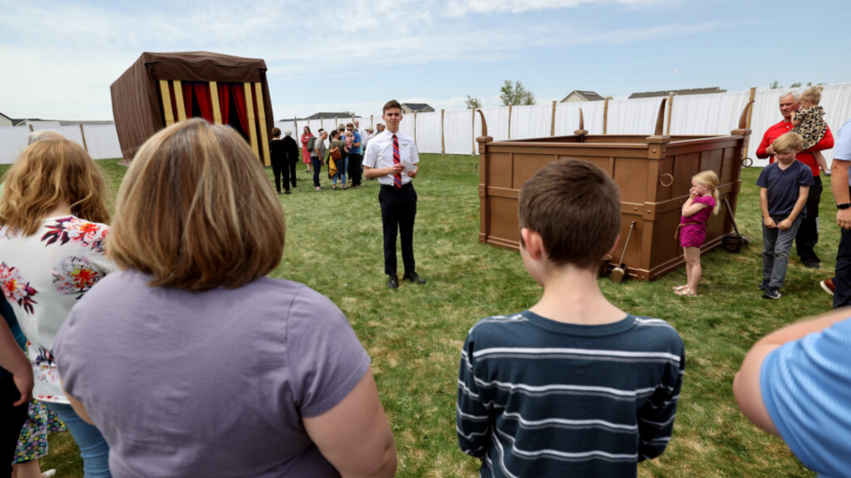 Parker J. Yardley gives information inside ancient tabernacle replica on display in Syracuse, Utah, on Saturday, May 7, 2022. Photo by Scott G Winterton, courtesy of Church News.Copyright 2022 Deseret News Publishing Company.