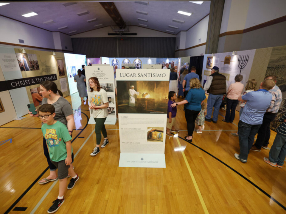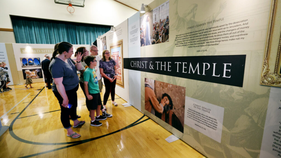 When visitors arrive, they watch a video inside before heading outside to tour the tabernacle. Afterward, they go back into the stake center and walk through a visitors center display about the symbols of ancient temples and how they relate to modern day temples.