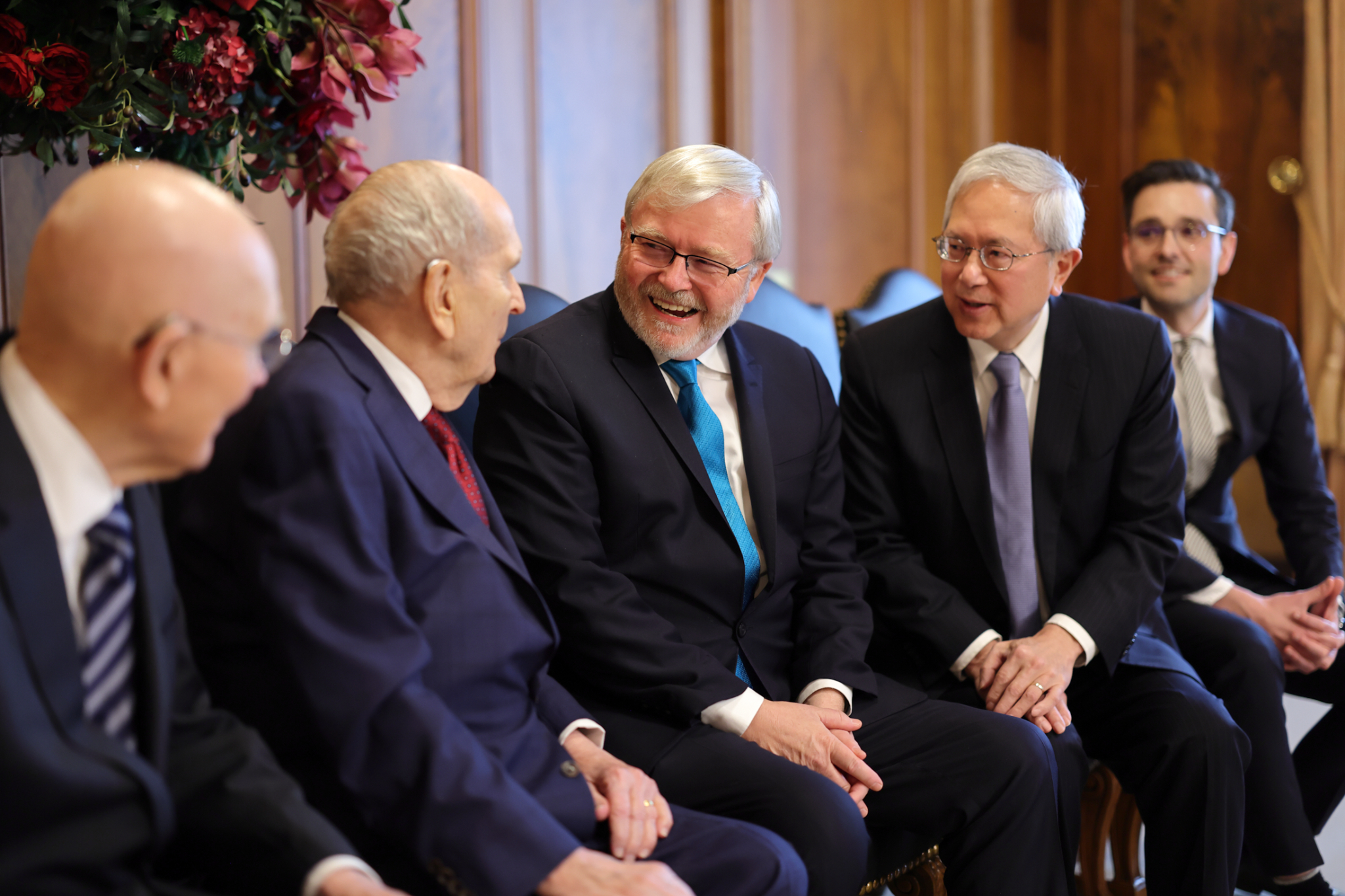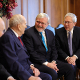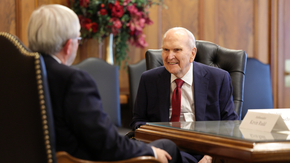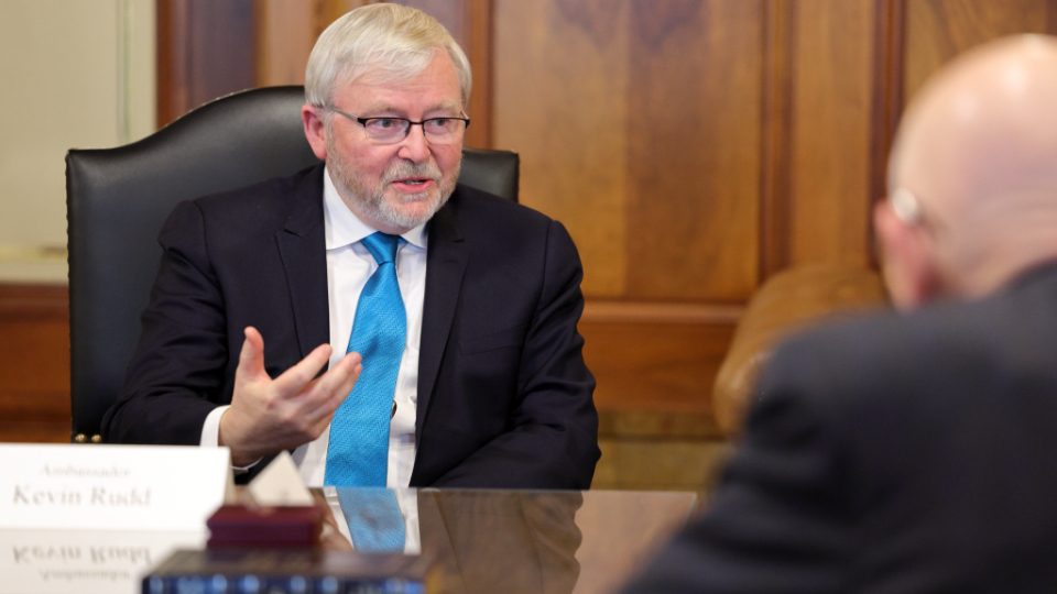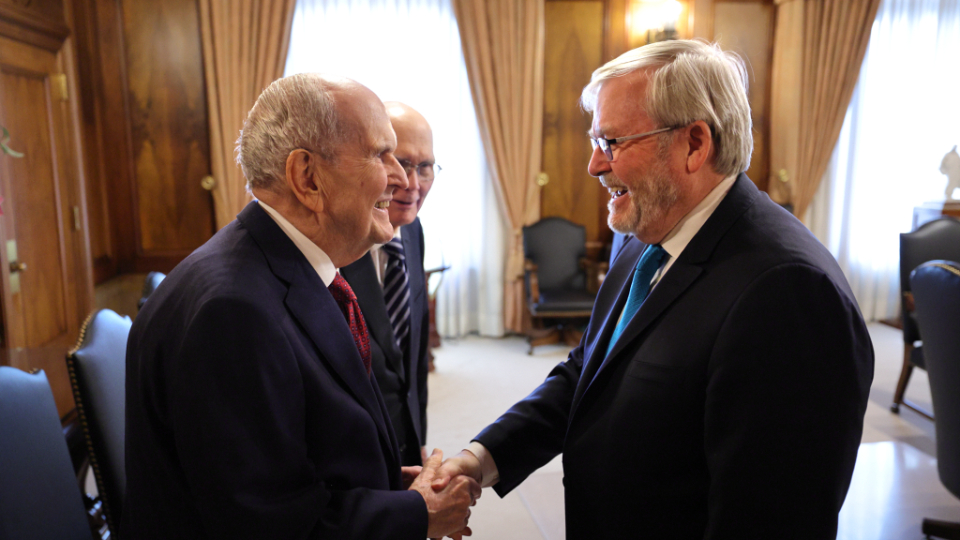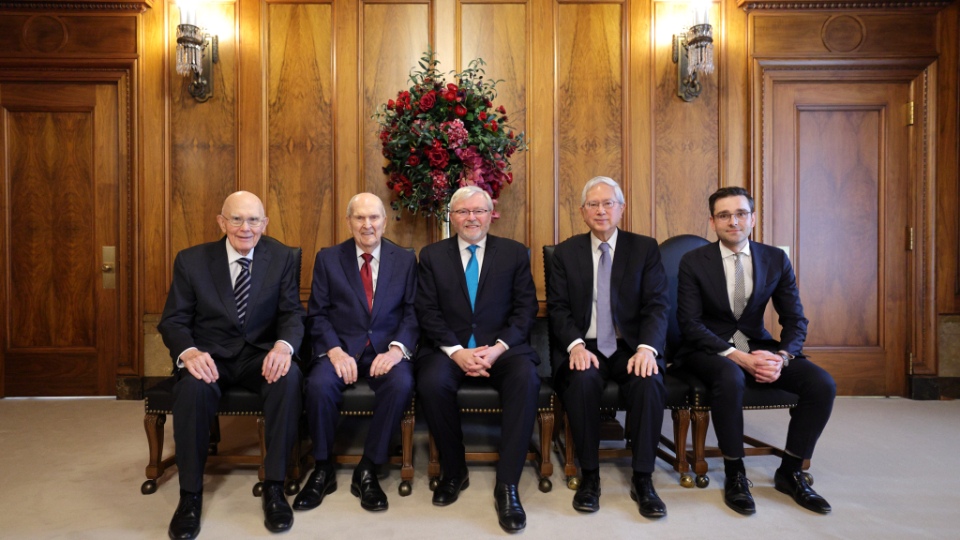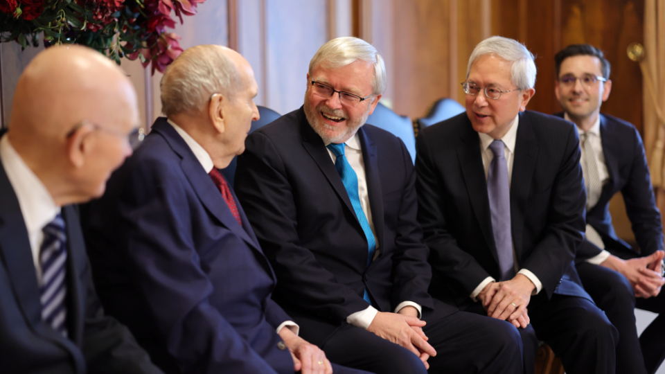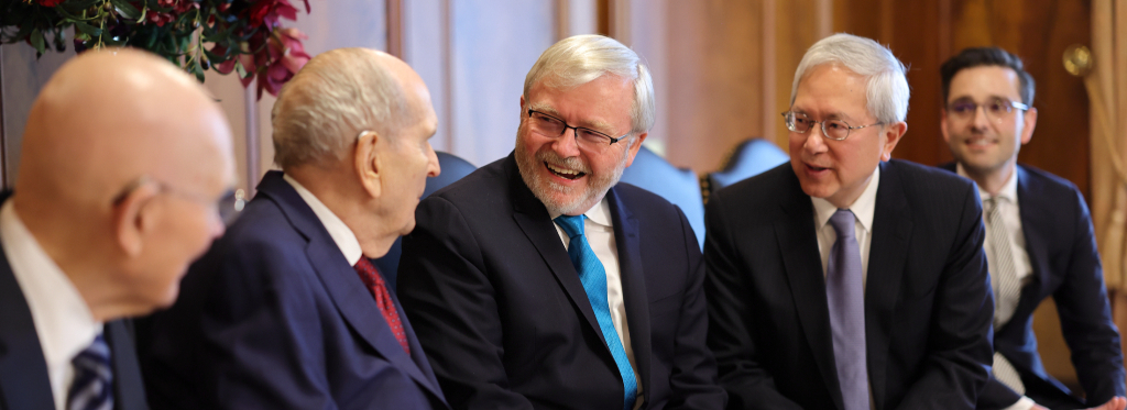 Australia’s Ambassador to the United States and former Prime Minister Kevin Rudd met with members of the First Presidency on Wednesday, February 28. Elder Gerrit W. Gong of the Quorum of the Twelve Apostles was also present at the meeting.