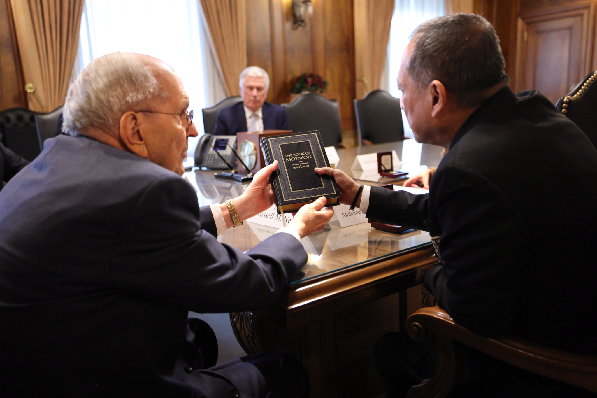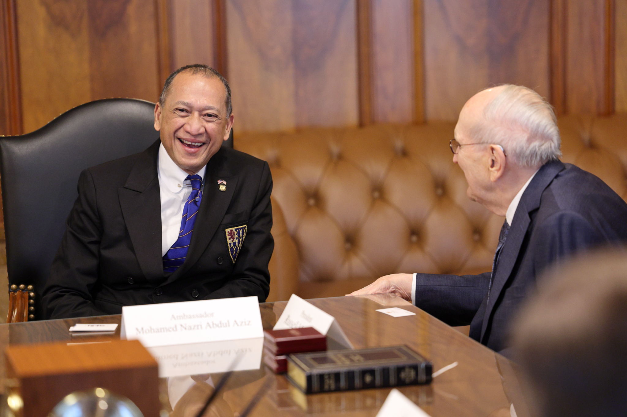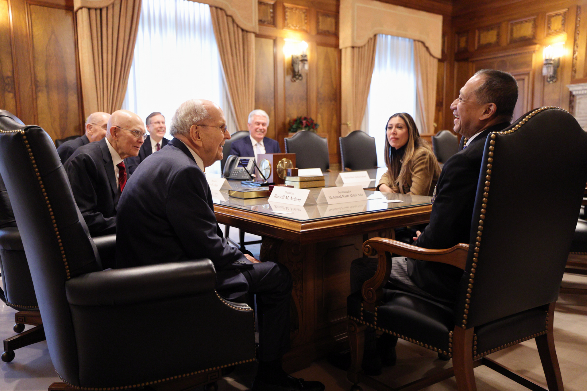 The following day, the First Presidency and Elder Dieter F. Uchtdorf of the Quorum of the Twelve Apostles met with Mohamed Nazri bin Abdul Aziz, the ambassador from Malaysia to the United States. The ambassador was accompanied by his wife, Haflin Binti Saiful Azhar, and their 7-year-old son.