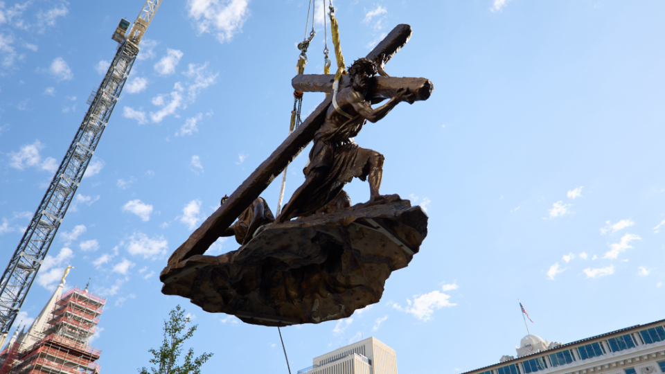 “Jesus Christ Carrying the Cross,” created by Michael Hall, who also sculpted the First Vision statue at Temple Square, depicts Jesus Christ bearing the cross as He makes His final walk to Calvary. “Jesus Christ in Gethsemane,” created by husband-and-wife duo Stephani and Roger Hunt, portrays Christ in prayer and suffering in the Garden of Gethsemane.