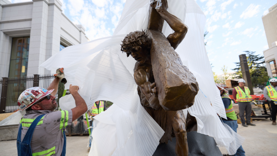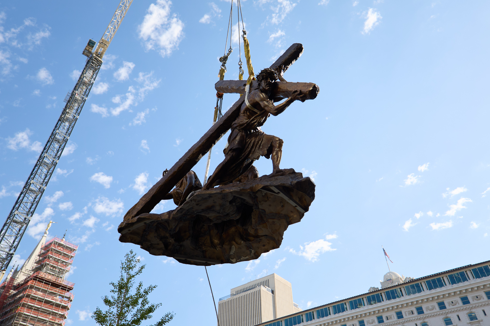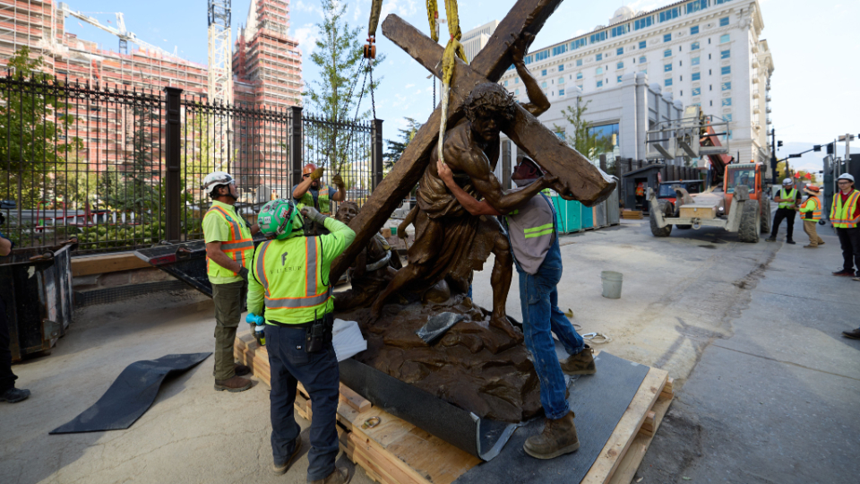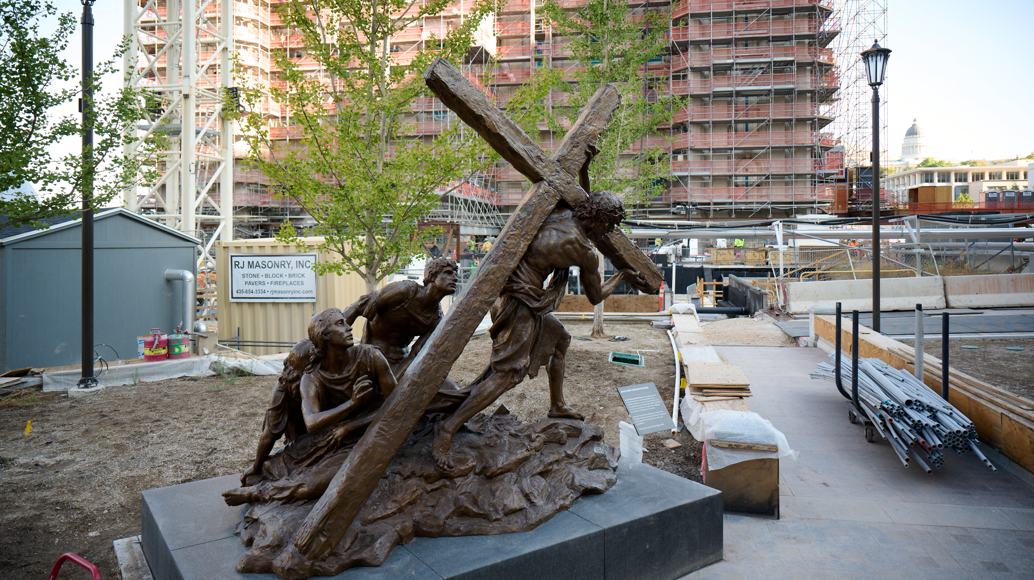 The two statues, “Jesus Christ Carrying the Cross” and “Jesus Christ in Gethsemane,” are visible to the public, but they are in an area of Temple Square still under construction.